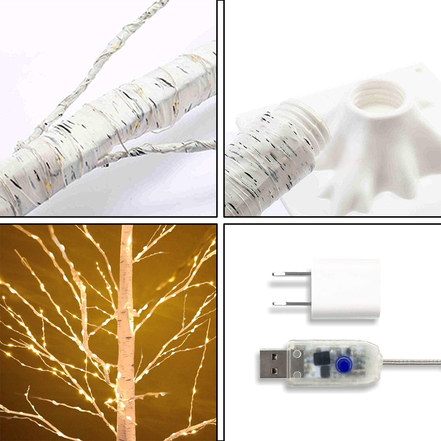 Simulation Birch Trunk And Bendable Branch. The simulation birch trunk and branch make this LED birch tree light more realistic. You can fold these bendable branch to any shape that you want. Features: Remote control. Super bright 440 pcs of LED beads. Beautiful warm white lighting effect. 8 of lighting mode. Ideal 6 FT height. Flexible branches Parameter: LED : 440LED Material : Plastic Size : 6 FT height Weight : 3.3 Lb Control : Remote + Manual Lighting modes : 8 modes Theory life span : 5000 hrs Package included : 1* LED Birch Tree Light, 1* Remote, 1* Plug, 1* User Manual. Wireless Remote Control Wireless Remote, no trouble of manual control ! This lighted led tree have up to 8 of working modes which can offer different type of lighting decoration effect for you ! This led tree light also have brightness+/- and timer features. You can adjust to your ideal mode and working modes via its little remote! Note:In order to make the remote work better, Users should aim the remote at the USB head. Installation instructions: 1.Take out the tree stand ; 2.Place the tree trunk into the tree and tighten ; 3.Insert the tree trunk top into the tree trunk bottom and tighten. 4.Plug the connector into the USB power supply . Note: The black and white stripe strip on the outer layer of the birch tree cannot be torn off.