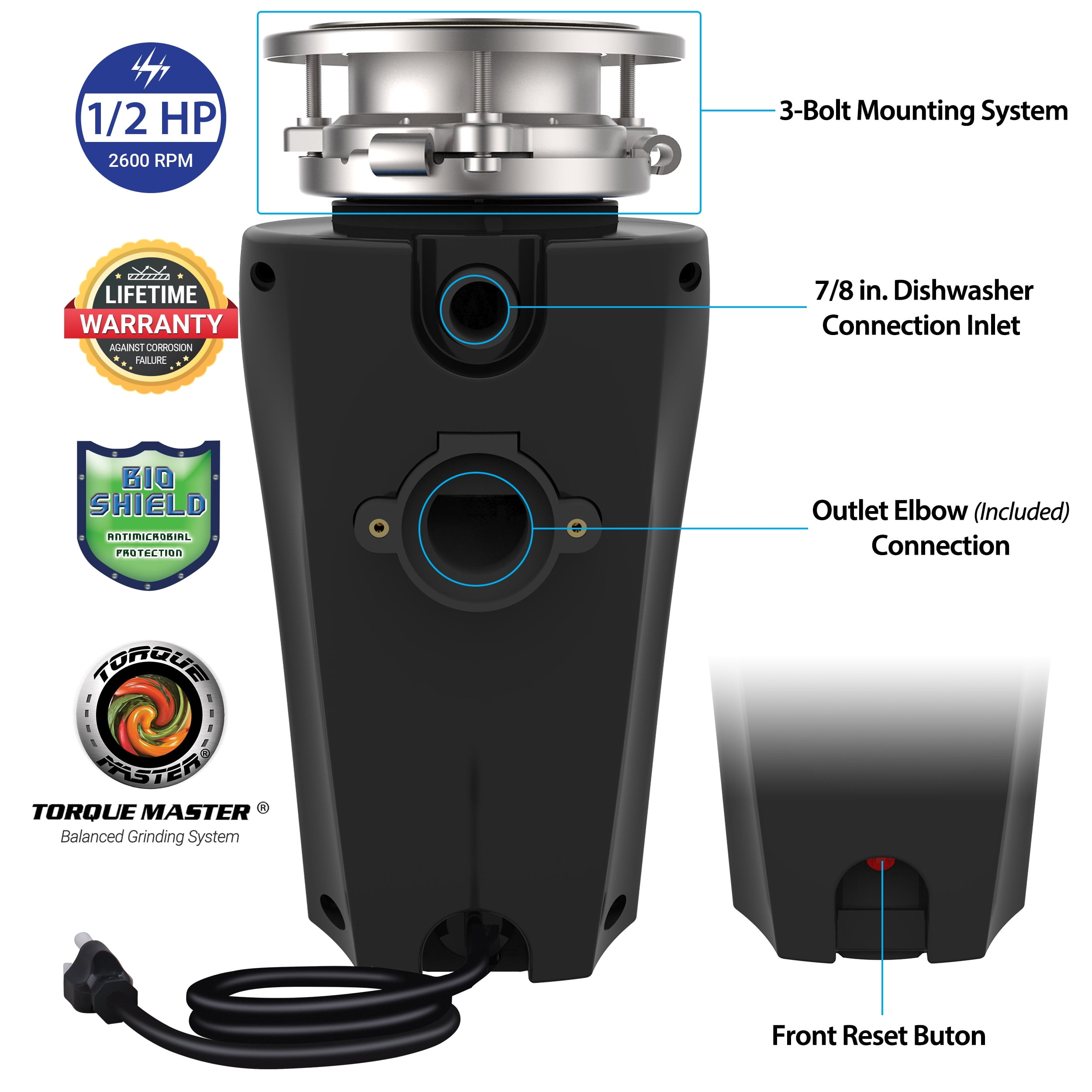 Stainless Steel Sink Flange Attached 3 Ft Power Cord Noise Reducing Removable Splash Guard Plastic Stopper Drain Connection Kit 2600 RPM 110V Continuous Feed Universal 3-Bolt Mounting Waste Load Capacity: Standard 29 oz Dimensions: 5.2 x 12.9″ (LxH) Additional Features Torque Master Balanced Grinding System – Superior Torque, No Jams, Minimal Vibration and Rattle Bio-Shield Anti-Microbial Odor and Bacteria Protection Compact Shell for Space-Saving Convenience All Stainless Steel Grinding Parts – Corrosion Resistant Quiet Motor