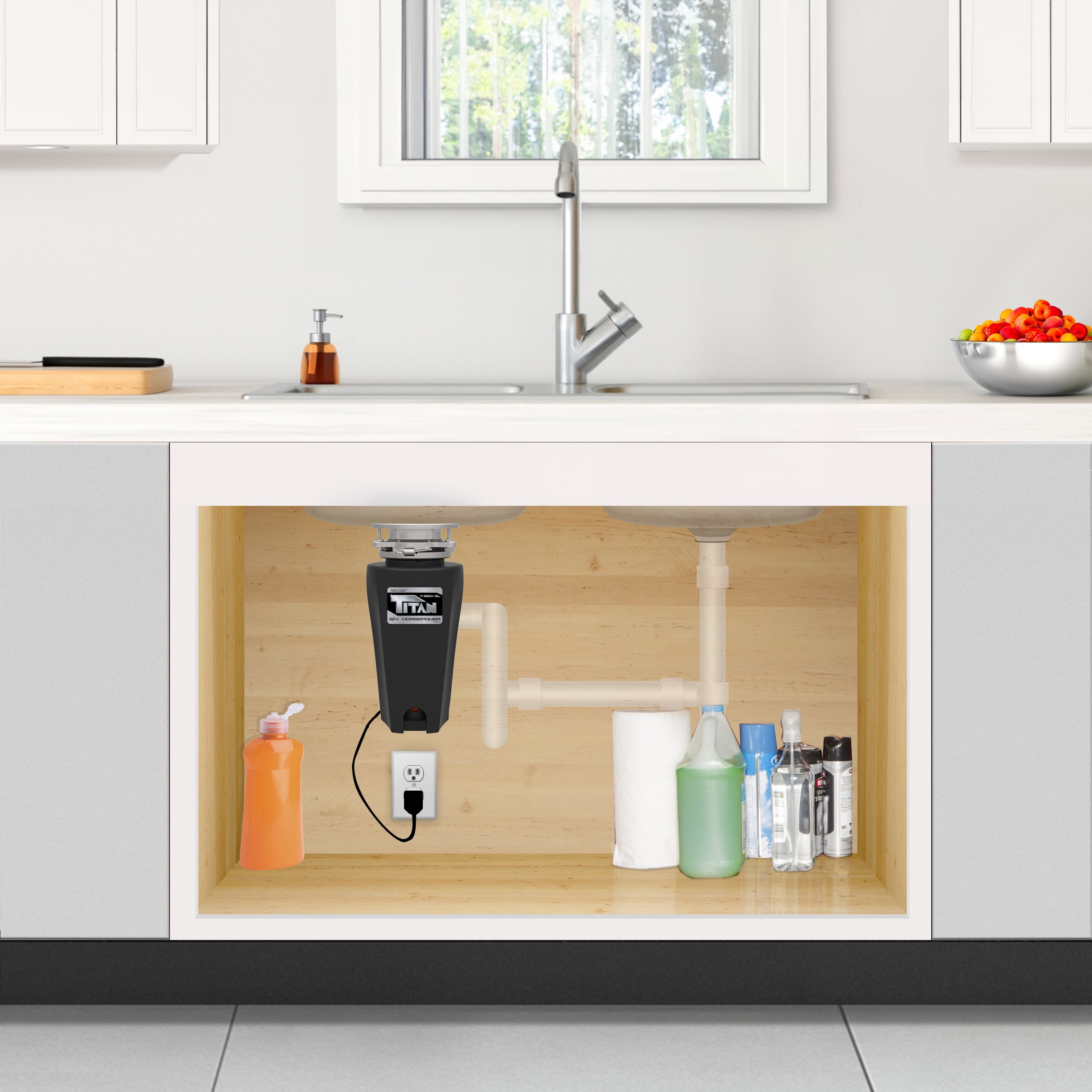 The Titan Food Waste Garbage Disposal is designed to make meal preparation and cleanup easier than ever before. This 3/4 horsepower slim-line disposer will grind through coffee grounds, the toughest vegetable scraps, peelings and small bones at 2700 RPM. Featuring a permanent magnet motor that reaches full torque at startup, the titan disposal eliminates jams and operates quietly to maintain a peaceful kitchen environment. The compact shell makes it easy to fit this disposal in any sink cabinet space, while leaving plenty of space for cleaning supplies. Experience convenience and superior performance with the Titan food waste disposer.