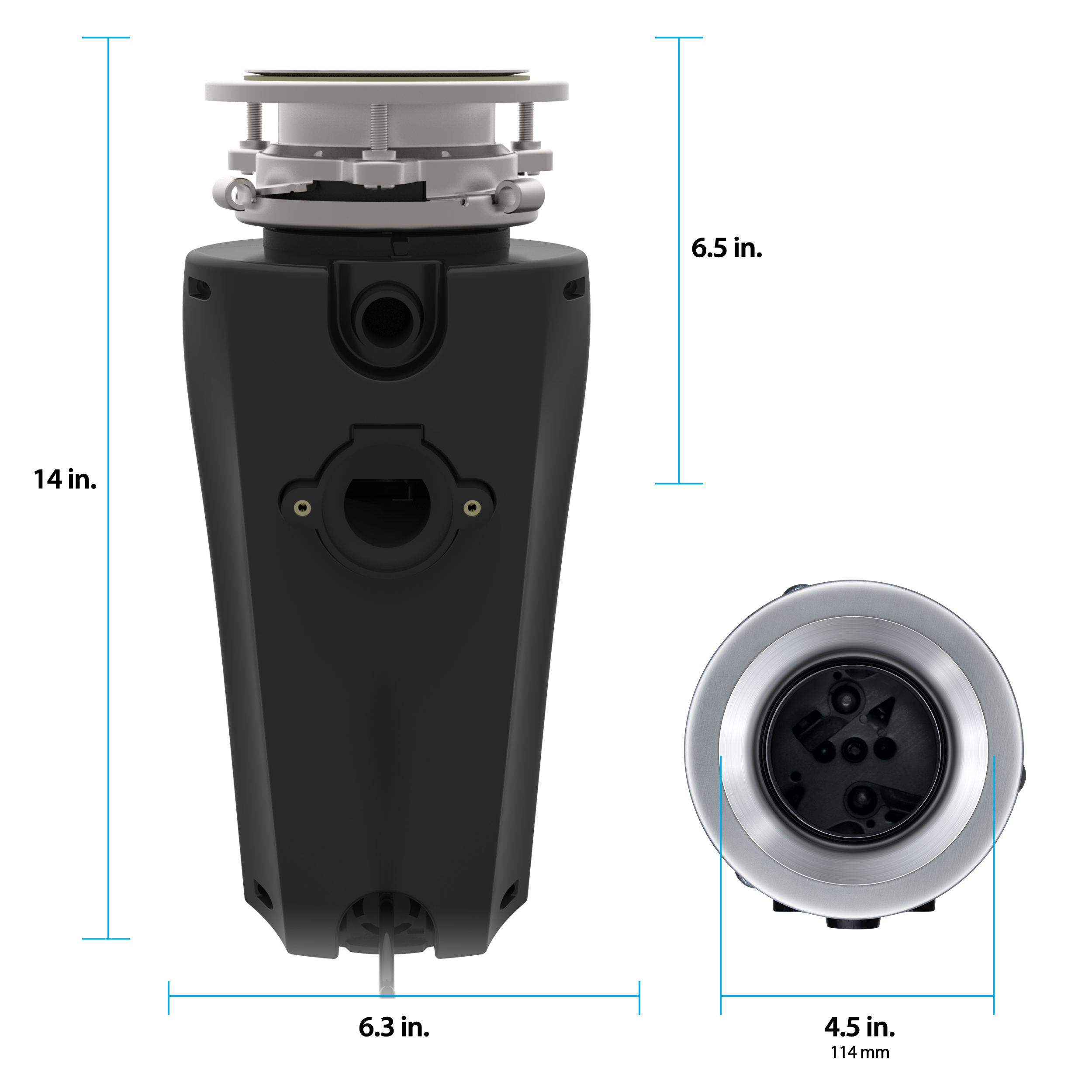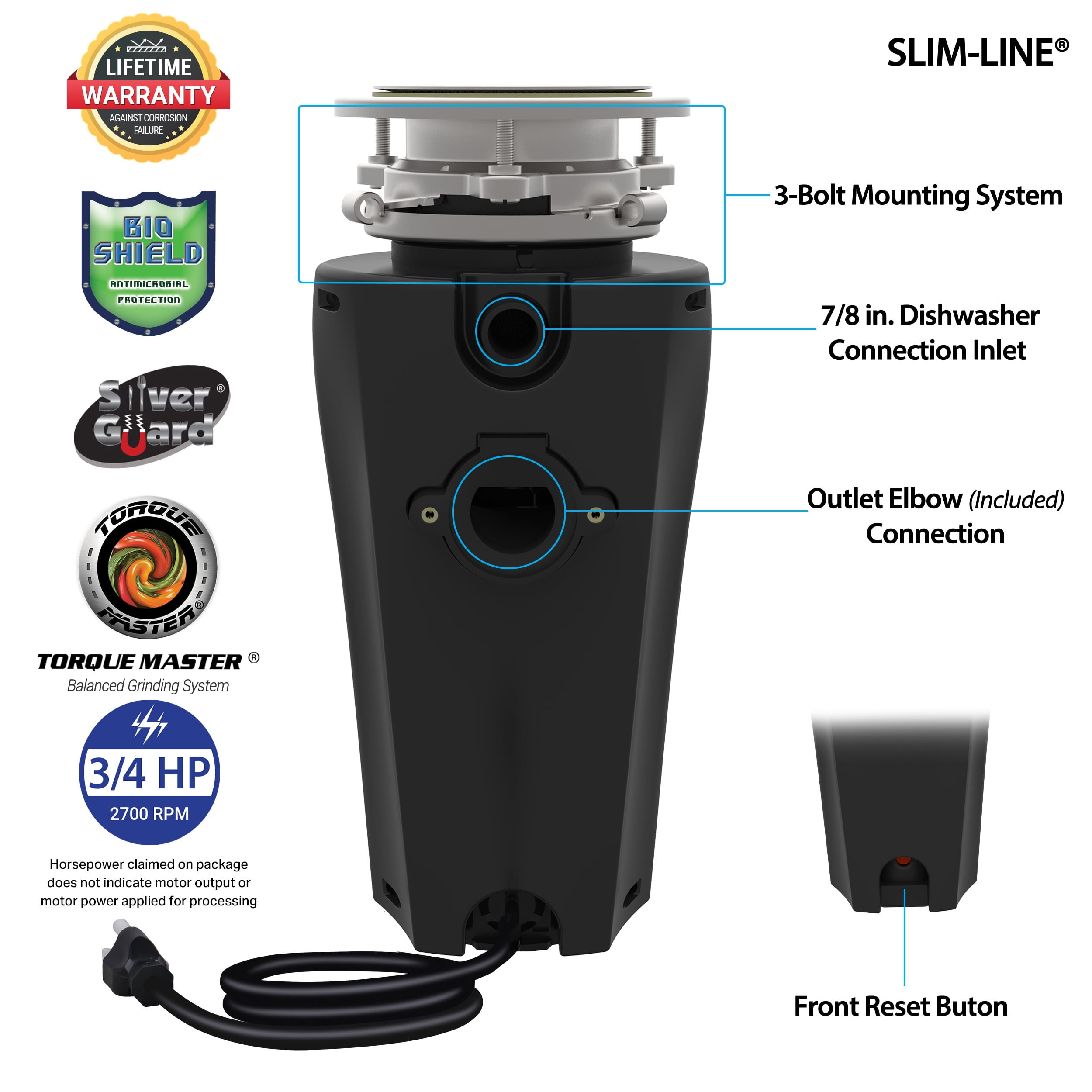 Stainless Steel Sink Flange and Stopper Attached 3 Ft Power Cord Sound Dampening Removable Splash Guard Drain Connection Kit 2700 RPM 110V/120V Standard 29oz Load Capacity Continuous Feed Universal 3-Bolt Mount Assembly Dimensions: 5.2″ x 14.2″ (LxH) Additional Features Torque Master Balanced Grinding System – Superior Torque, No Jams, Minimal Vibration and Rattle Compact/Lightweight Shell for Space-Saving Convenience All Stainless Steel Grinding Parts – Corrosion Resistant Bio-Shield Anti-Microbial Odor and Bacteria Protection Quiet Motor