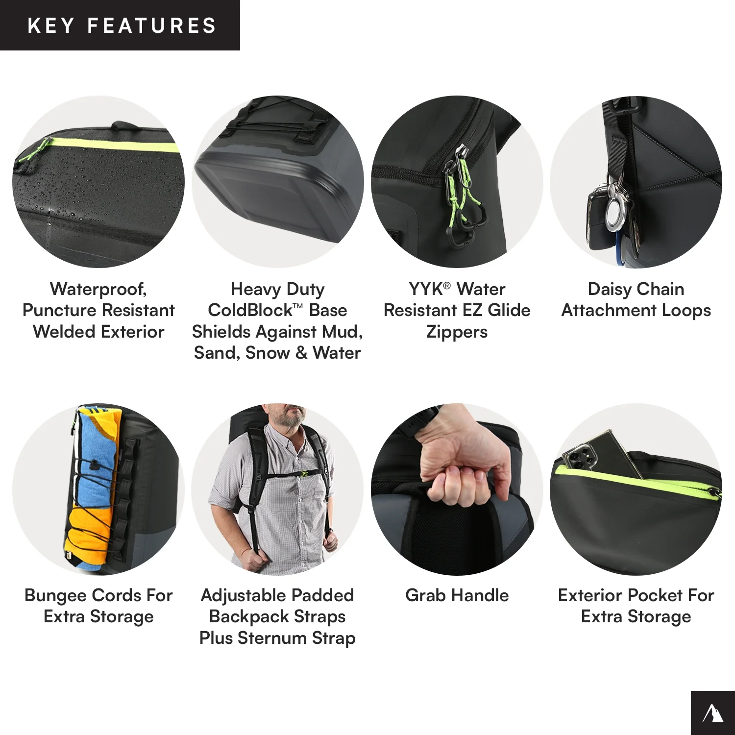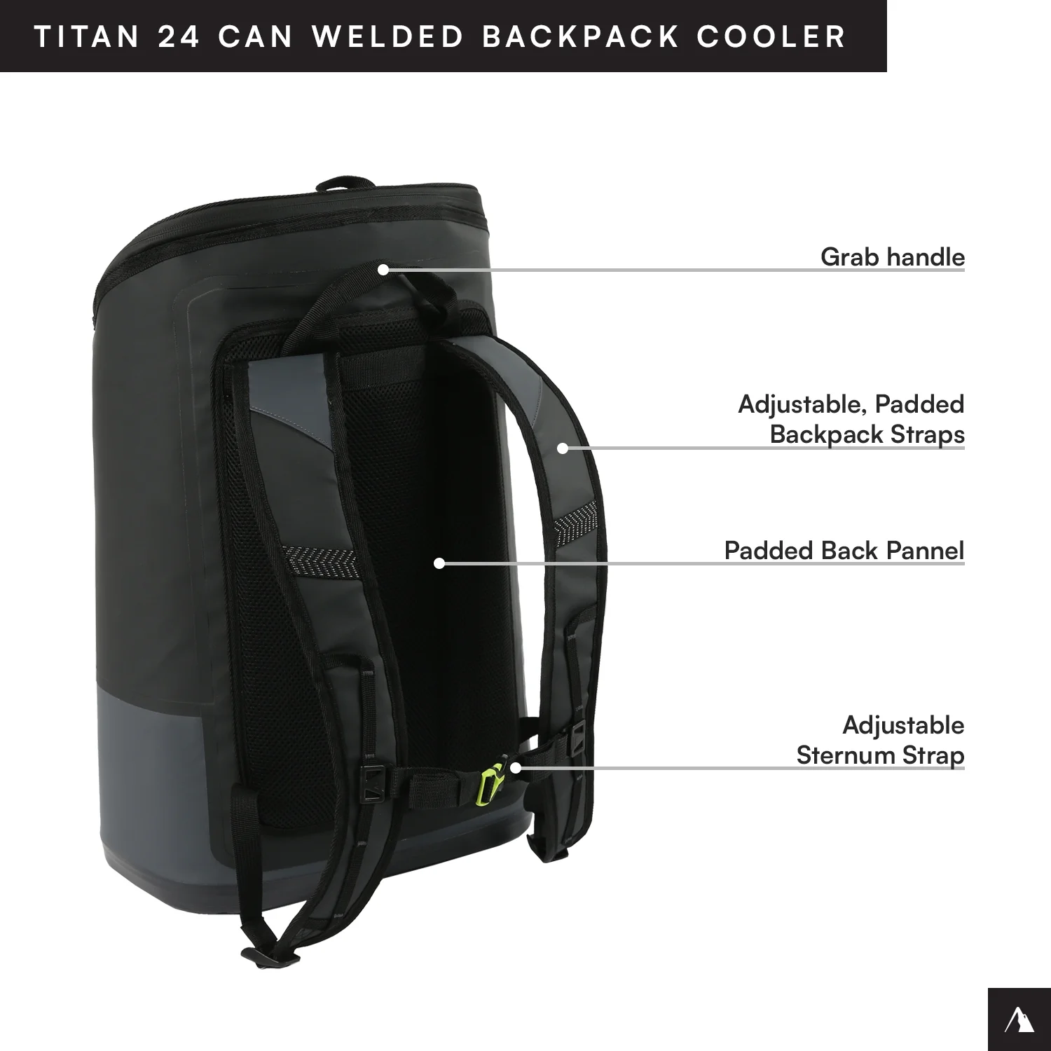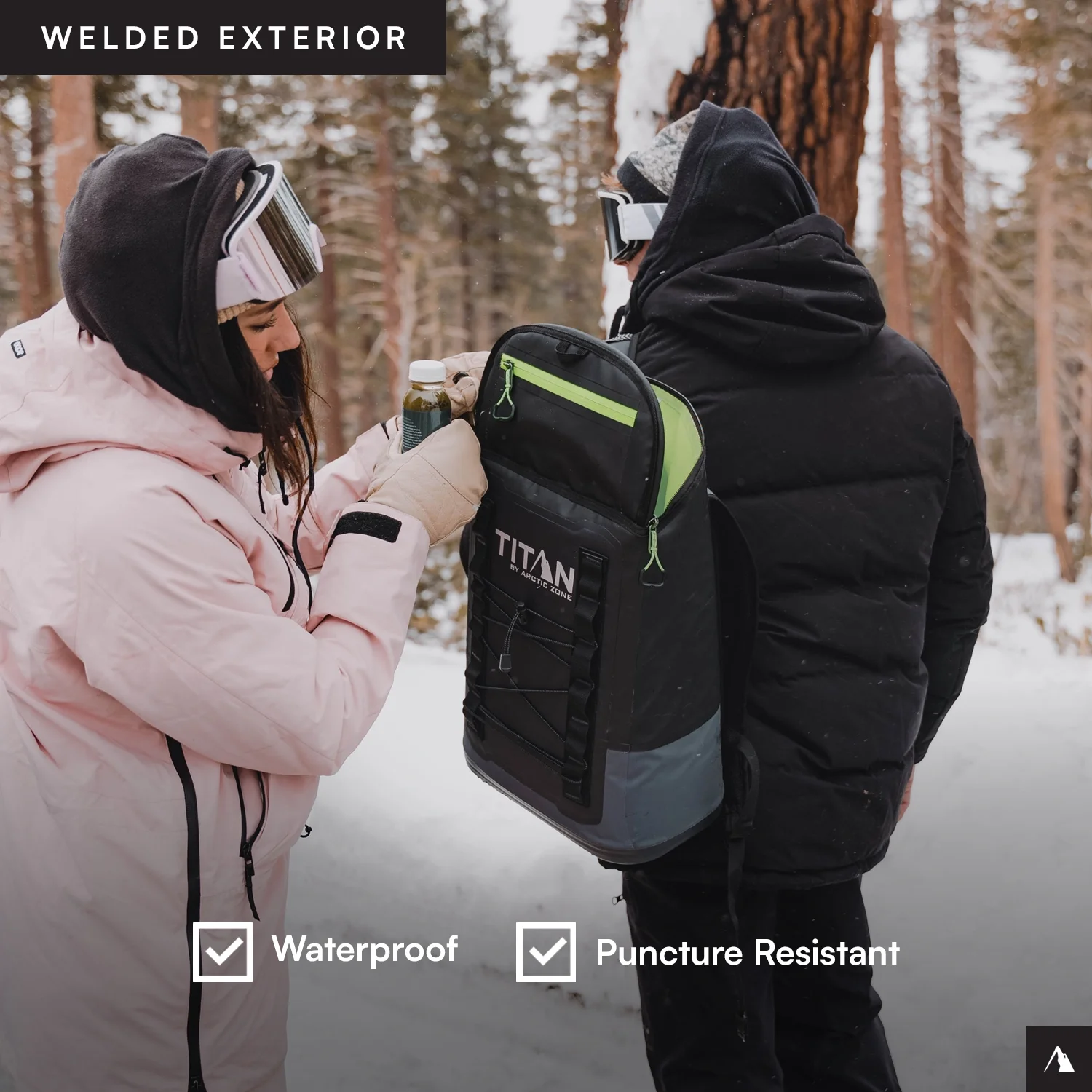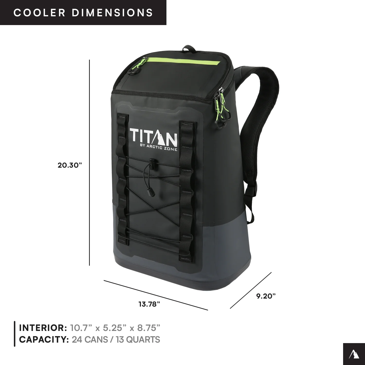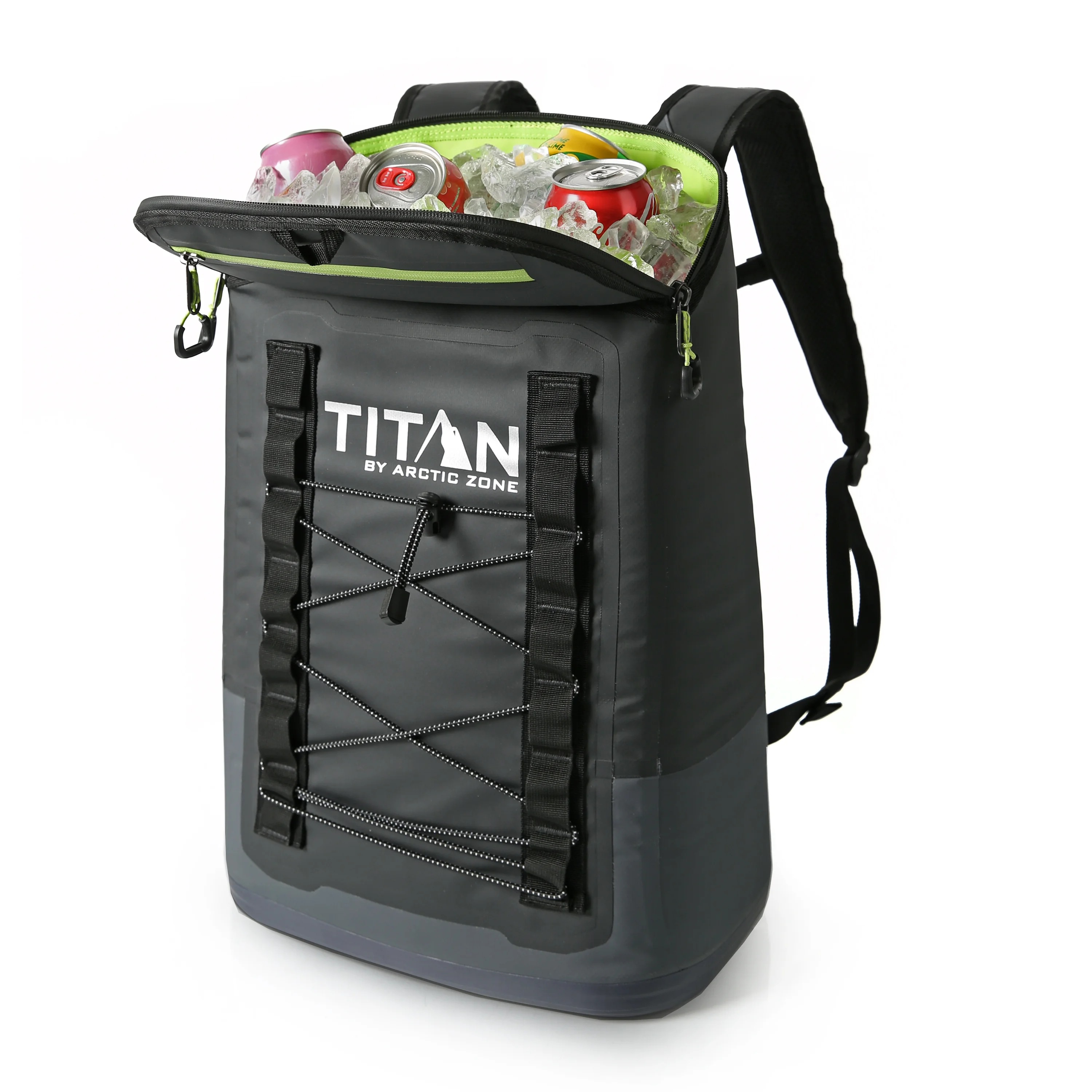 Titan by ArticZone Welded cooler backpack with heavy duty, waterproof, ColdBlock base to shield against mud, sand, snow, and water Capacity of 14.8 qts holds up to 24 cans; Dimensions: 10.13 x 20.3 x 13.78″; Weight (empty): 0.66 lbs Deep Freeze Performance Insulation with radiant heat barrier locks in the cold Ultra Safe leak proof interior lining with Microban helps to protect against bacterial odors and stains EZ glide zippers are YKK water resistant Adjustable padded backpack straps and grab handle for versatile carry options Padded back panel and adjustable sternum strap for comfortable carrying Exterior zippered pocket to secure your essentials Daisy chain loops to hang keys, water bottles, and more Puncture and U.V. ray resistant