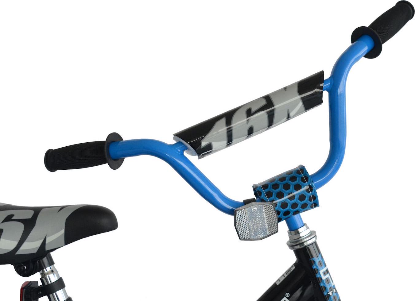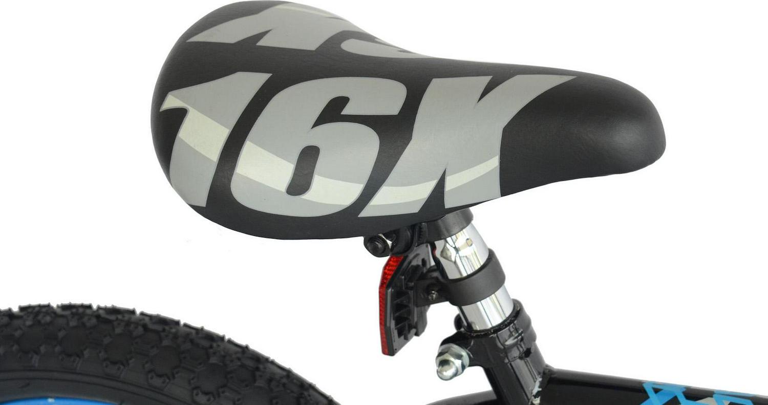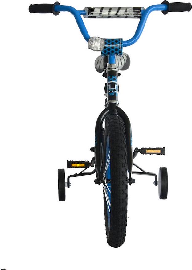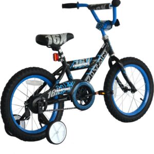 – Black 16-inch boys BMX bike with training wheels. Includes handlebar pads for your child’s protection