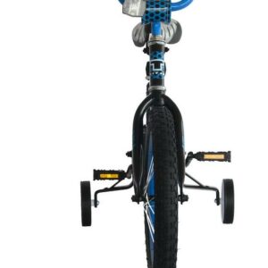16″Boys BMX bicycle, 10″ steel frame. Includes training wheels, training wheel brackets and chain guard black front fork and stem, blue handlebars. Also includes black seat, rubber tires, black handlebar grips, handlebar pad for your child’s protection. It arrive 90% assembled and requires light assembly. For ages 3-7. Stand over height is 18″.