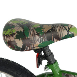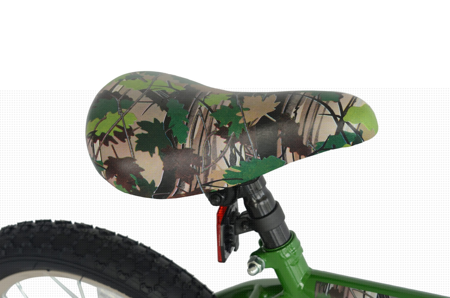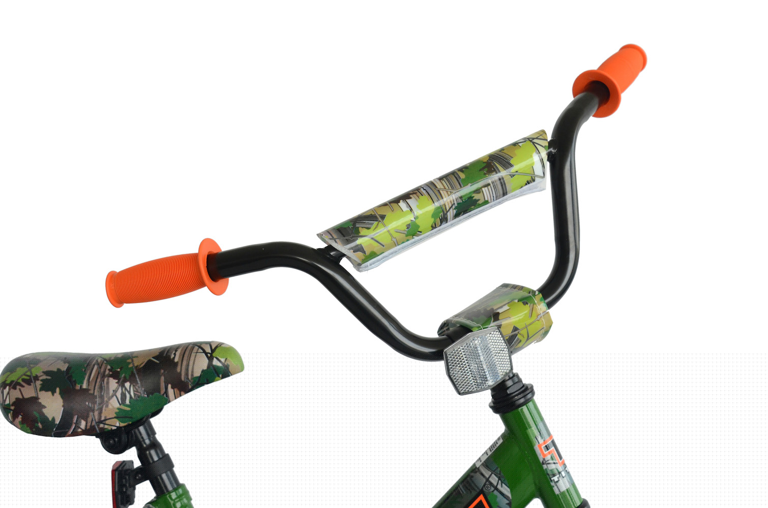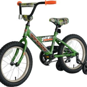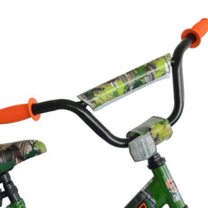 16″Boys BMX bicycle, 10″ steel frame. Includes training wheels, training wheel brackets and chain guard, green front fork and stem, black handlebars. Also includes camo print seat, rubber tires, orange handlebar grips, camo print handlebar pad for your child’s protection. It arrives 90% assembled and requires light assembly. For ages 3-7. Stand over height is 18″