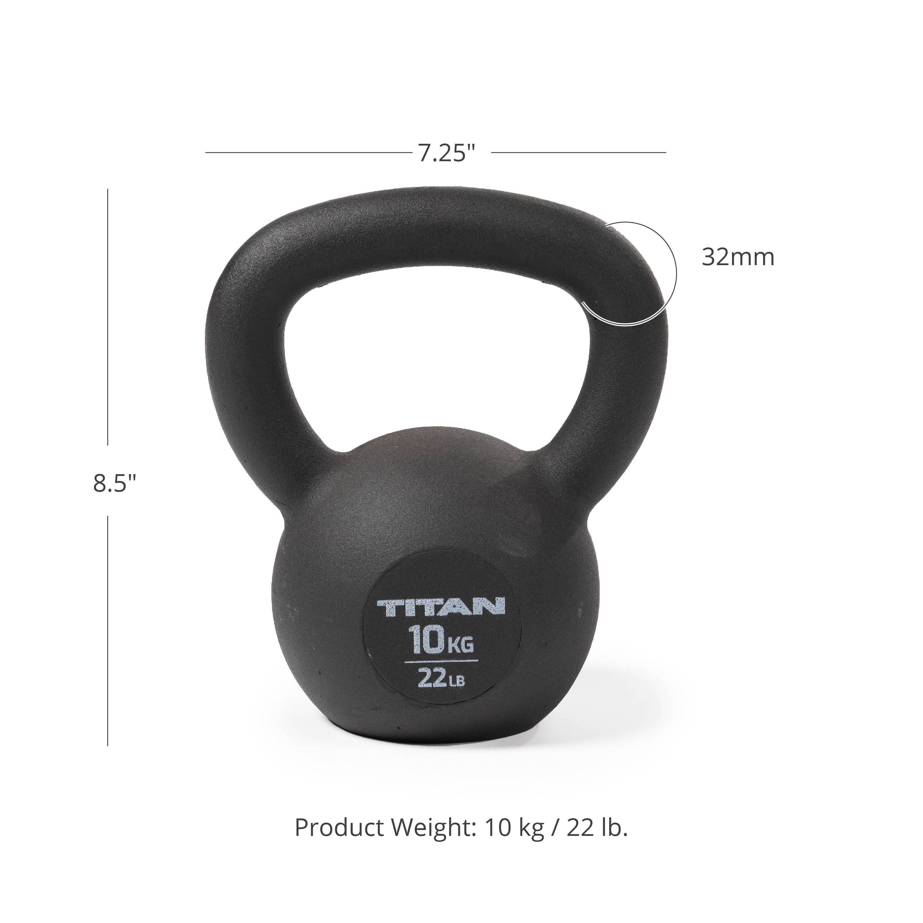 SOLID CAST IRON: The Kettlebells are cast in a single solid piece, creating a stronger, generous wide handle. The base of each kettlebell is machined flat, so it sits on the floor and does not wobble. MULTIPLE WEIGHT OPTIONS: The single-piece casting powder-coated black textured kettlebells are available from 4 KG (9-pounds) up to 32 KG (70-pounds) and are sold individually. FREE WEIGHTS FOR STRENGTH TRAINING: Kettlebells allow you to target a wide range of muscle groups, giving you a full-body workout. Use these kettlebells to perform swings, deadlifts, squats, get-ups, snatches, and other athletic or cross-training exercises. DURABLE CONSTRUCTION: Each kettlebell is well-formed, balanced, and features an easy-to-grip handle for a comfortable and non-slip grip. The finished texture holds chalk well but provides enough texture that chalk is not needed. DIMENSIONS: The 10 KG or 22 LB Kettlebell measures 8.5-inches tall with a 3.25-inch base. The smooth handle provides a 32 mm diameter hold.
