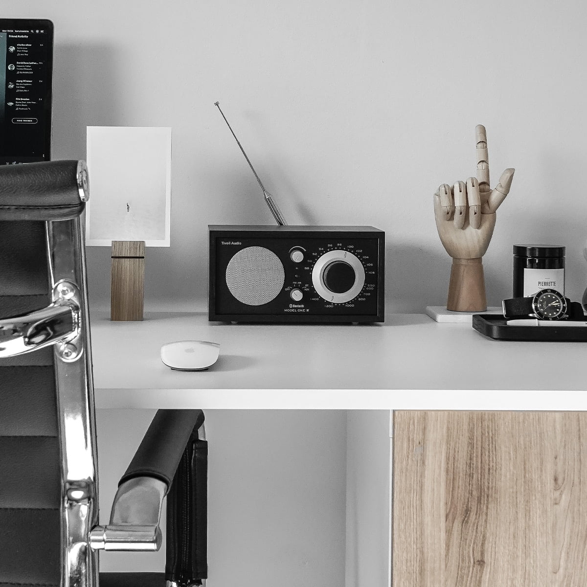 Imagine The Ideal Radio With a tuner that brings clarity to many of the weakest stations and Bluetooth the Model One radio begins with a handmade wood cabinet that is both beautiful and the ideal acoustically inert housing. With just three knobs it is the antithesis of today’s ever more complex electronic products. However behind the Model One’s simple appearance hides a multitude of technology facilitating higher sound reproduction and better reception over anything else near it in size. Features Classic vintage minimalist styling with a beautiful wood veneer cabinet No complicated set-up just plug and play Low-to-no noise interference with other wireless devices Listen your way with sensitive AM/FM turner auxiliary/headphone input and Bluetooth® pairing Featuring a compact but powerful 3-inch full range long-throw speaker 30 ft reception range Exceptional High Fidelity sound
