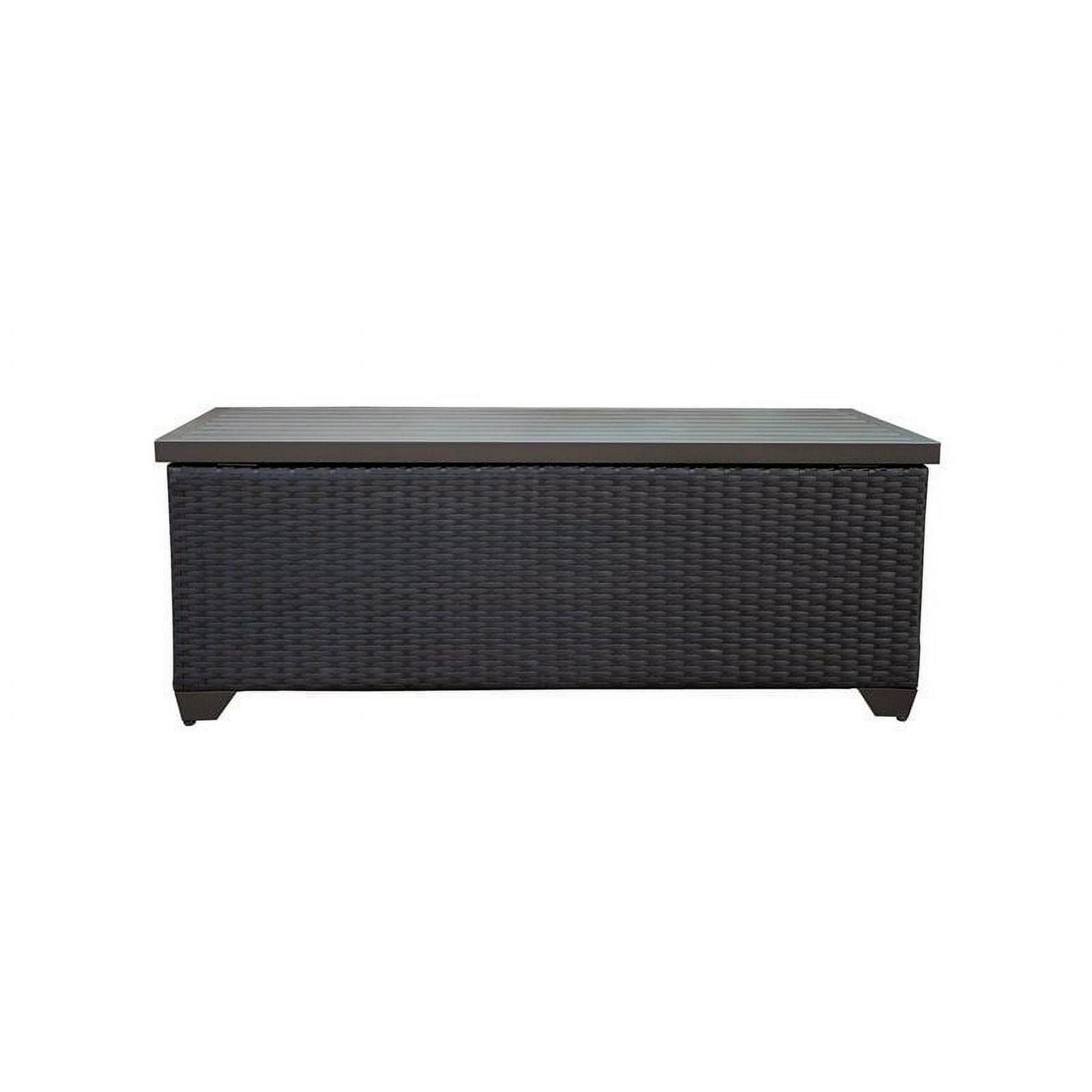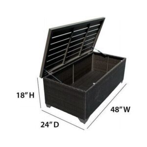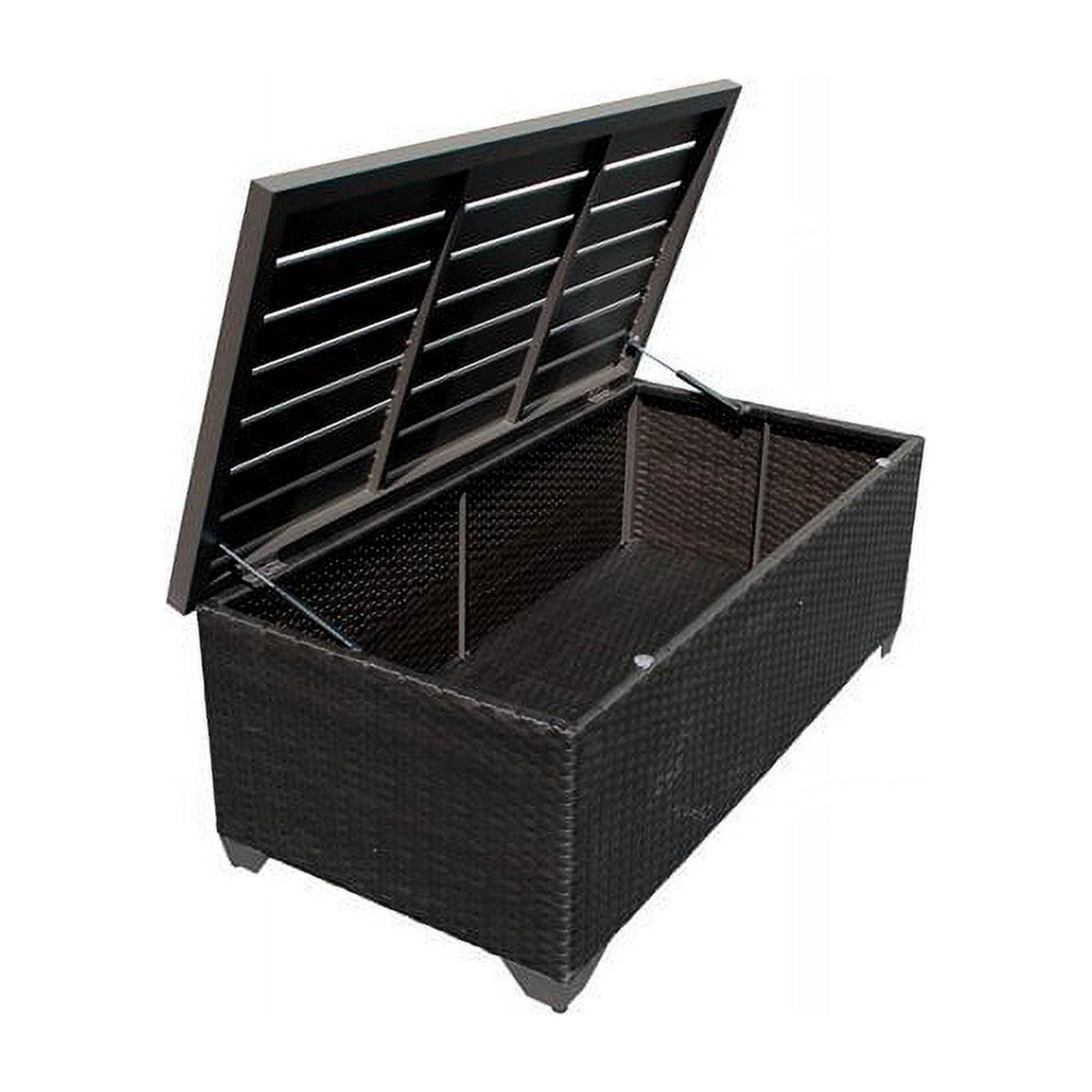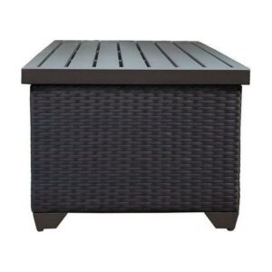 Add storage and style to your patio or deck with the TK Classics Barbados Outdoor Storage Coffee Table. Made to last, this coffee table has a rust-resistant aluminum frame covered in custom, hand-woven, all-weather, high-density polyethylene wicker finished in a rich Espresso. The durable tabletop is crafted from powder-coated, cast aluminum and opens to reveal a spacious storage area that can be used for everything from blankets to toys to gardening supplies. Its no sag wicker bottom has extra flexible strapping to provide long-lasting suspension while the feet feature height adjusters for uneven surfaces that won t mar your patio or deck. A great addition to your patio or deck, you ll love the modern beauty and functionality of this coffee table.