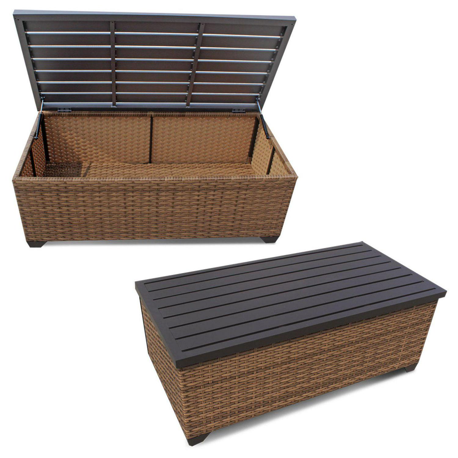 Keep your patio neat and clean without sacrificing on style with the TK Classics Laguna Outdoor Storage Coffee Table. Warm and inviting, this coffee table makes it simple to ensure your backyard always looks great. Made to last, this coffee table has a rust-resistant aluminum frame covered in custom, hand-woven, all-weather, high-density polyethylene wicker finished in Caramel. The durable tabletop is crafted from powder-coated, cast aluminum and opens to reveal a spacious storage area that can be used for everything from blankets to toys to gardening supplies. Its no sag wicker bottom has extra flexible strapping to provide long-lasting suspension while the feet feature height adjusters for uneven surfaces that won t mar your patio or deck. The perfect addition to your patio or deck, you ll love the modern beauty and functionality of this coffee table.