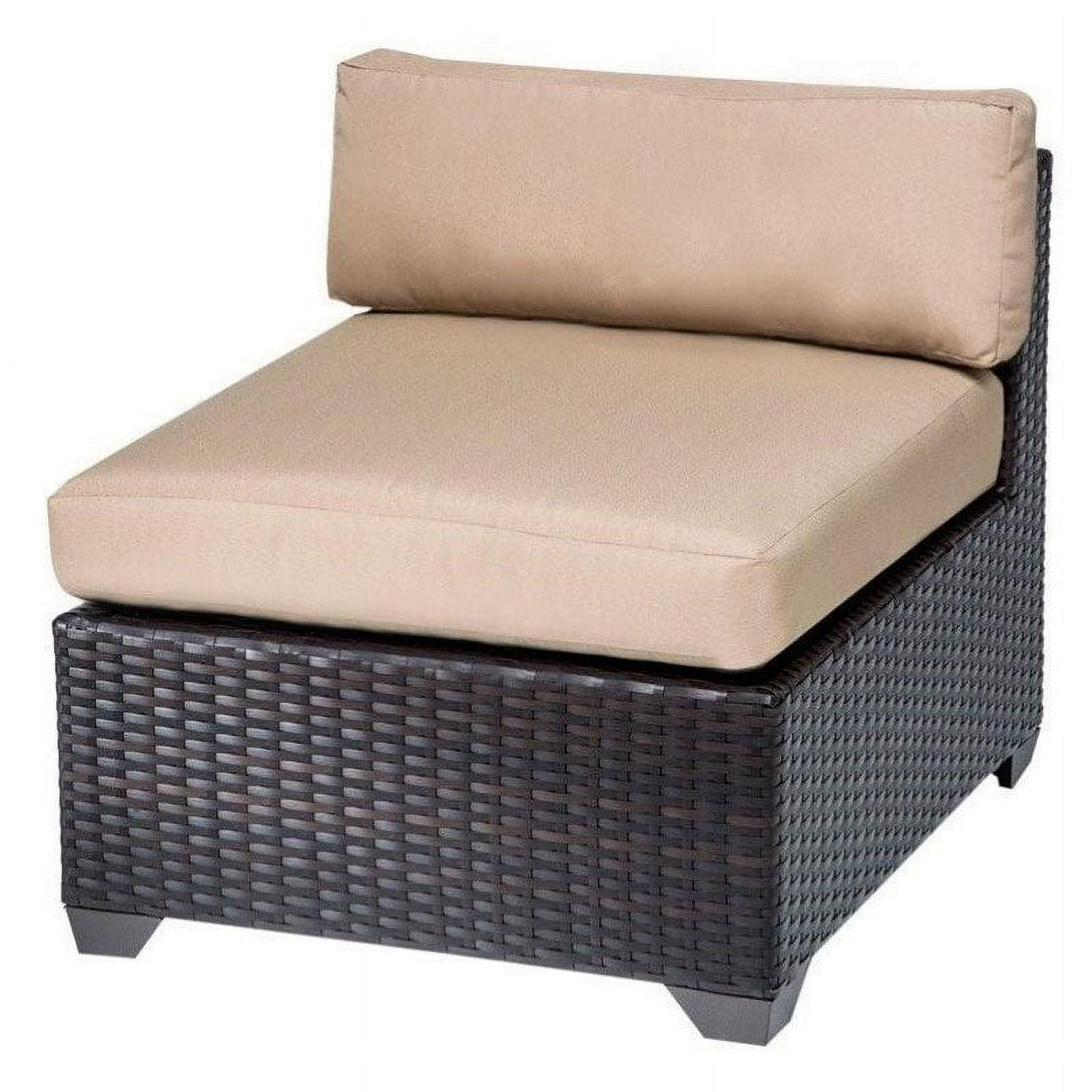 With its contemporary design and comfortable frames, the Belle Collection is perfect for any outdoor location. This affordable modular set can be configured to fit any outdoor living space. This collection is great if you have a smaller space and want to maximize your seating. Each piece is crafted with premium high-density polyethylene resin wicker that s hand-woven over durable, non-corrosive aluminum frames to create furniture that will withstand the elements season after season.FABRIC WARRANTY – 2 Year coverage against fadingCUSHIONS – Thick cushions for a luxurious look and feelCUSHION COVERS – Washable and zippered for easy cleaning (air dry only)FEET LEVELERS – Height adjusters for uneven surfaces that won t mar your patio or deckTABLE TOPS – Cast aluminum with a durable powder coated finishFULLY ASSEMBLED – Ready to use and enjoy Custom hand woven all-weather, high density, PE (polyethylene) wicker Strong rust resistant, powder coated aluminum frame for maximum durability Commercial grade construction No Sag solid wicker bottoms with extra flexible strapping providing long-lasting suspension Perfect for outdoor use in all climates 3 Year Manufacturer s Limited Warranty with every set Elegant design includes angled backs Includes seat and plush back pillow for maximum comfort No Sag solid wicker bottoms with extra flexible strapping providing long-lasting suspension New rust-resistant, powder coated feet which are color matched with table topsAll sets will come with Espresso wicker and Wheat covers on the cushions.. Specifications:(1) Belle Armless Sofa – 26.5″W x 31.5″D x 25″H.