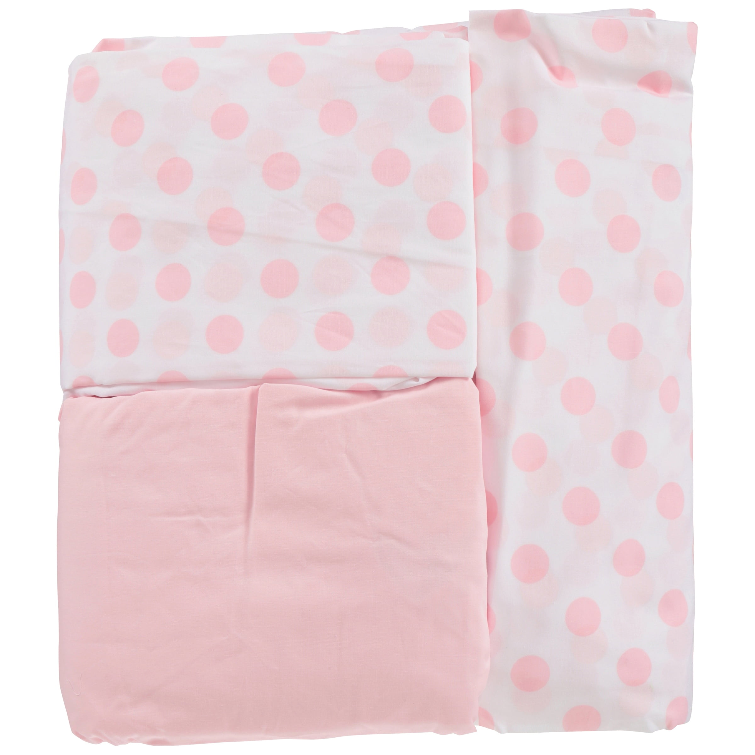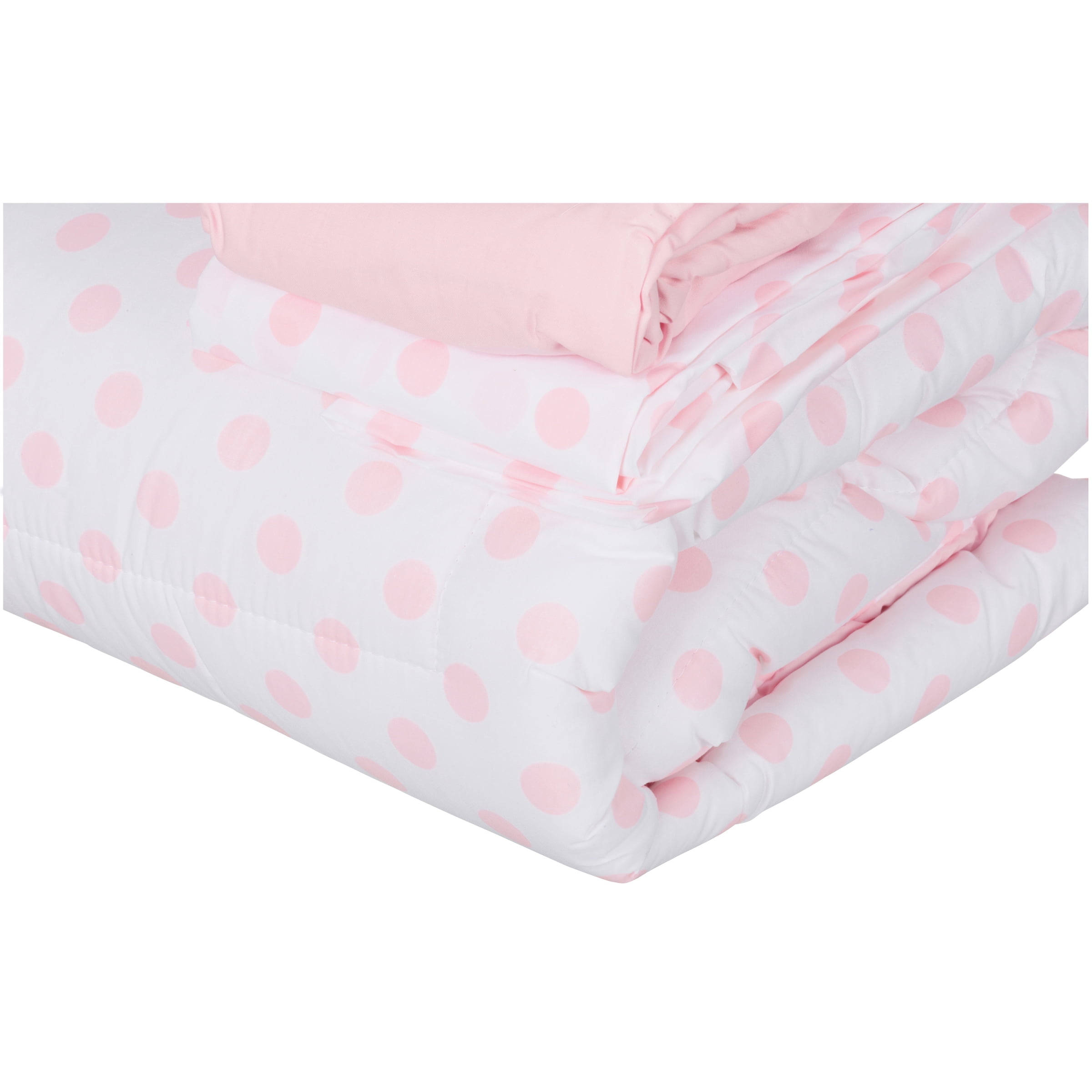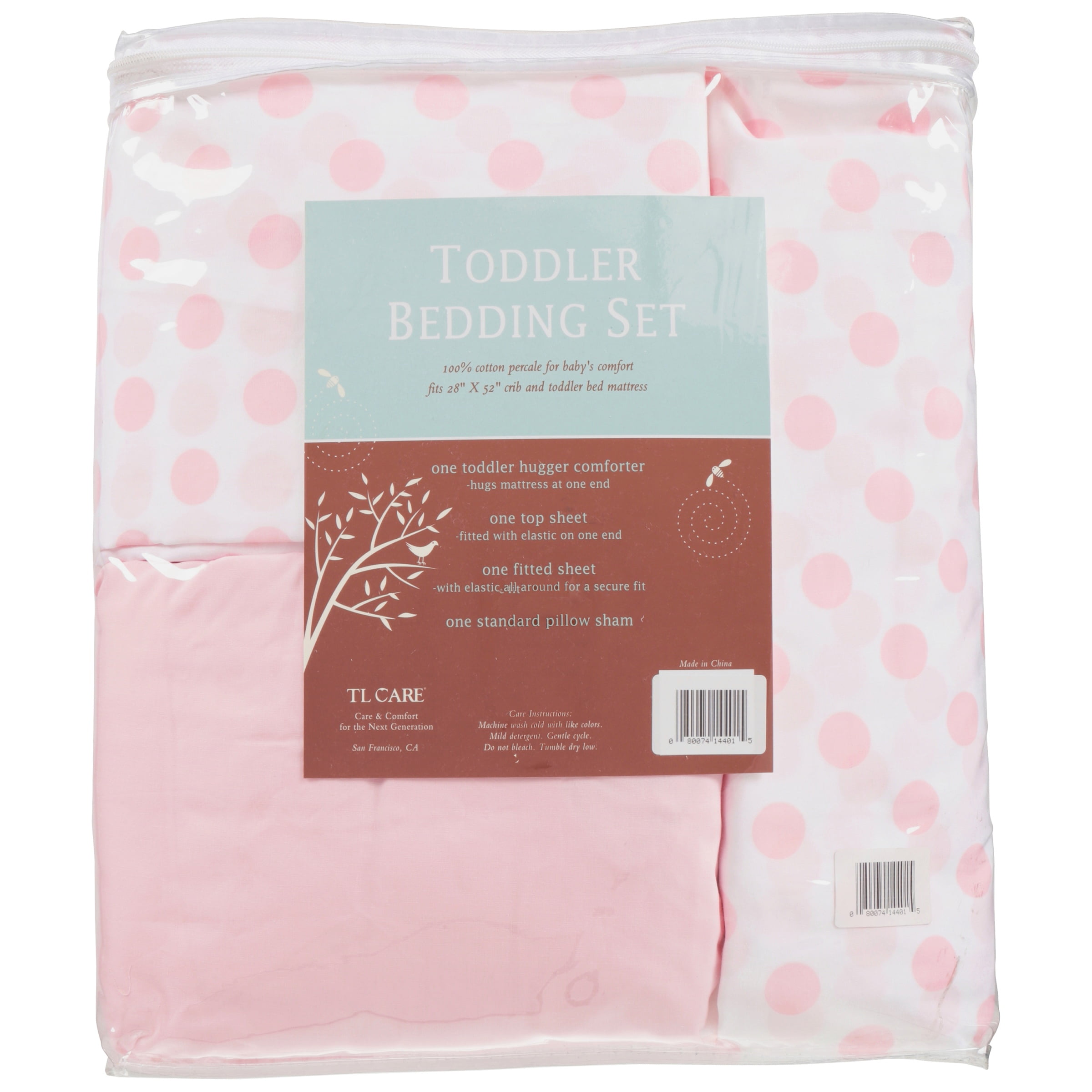 Toddler Bedding Set from TL Care Includes comforter, top sheet, fitted sheet, pillow sham White with light pink polka dots Fits beds that are 28” x 52” Made from 100% cotton Machine Washable