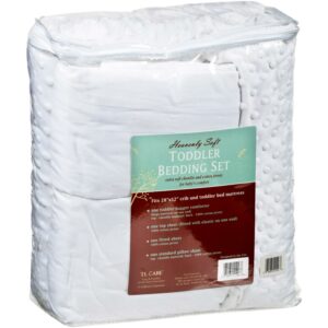 Choose only the best when it comes to your little one with the Heavenly Soft Toddler Bedding Set from TL Care! This bedding set is specifically made for cribs and toddler bed mattresses, and includes 1 toddler hugger comforter, 1 top sheet, 1 fitted sheet, and 1 standard pillow sham. The bedding is made from extra soft chenille and cotton jersey to ensure that your little one is getting the sleep that they need! The set comes in a classic white color that is sure to complement your nursery s style and its premium quality fabric is machine washable for a quick and easy clean. Ensure comfort for your little one today and pick up the Heavenly Soft Toddler Bedding Set from TL Care!
