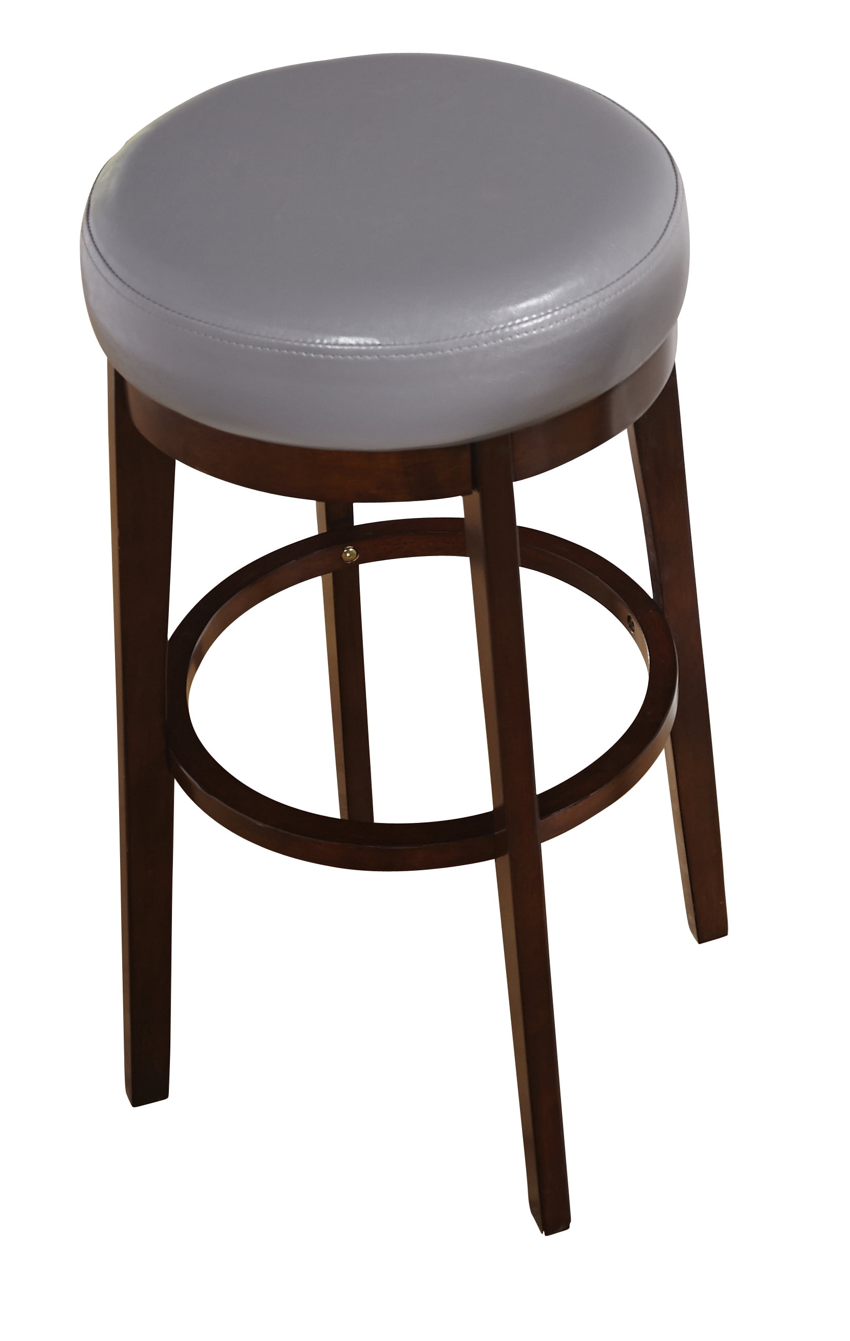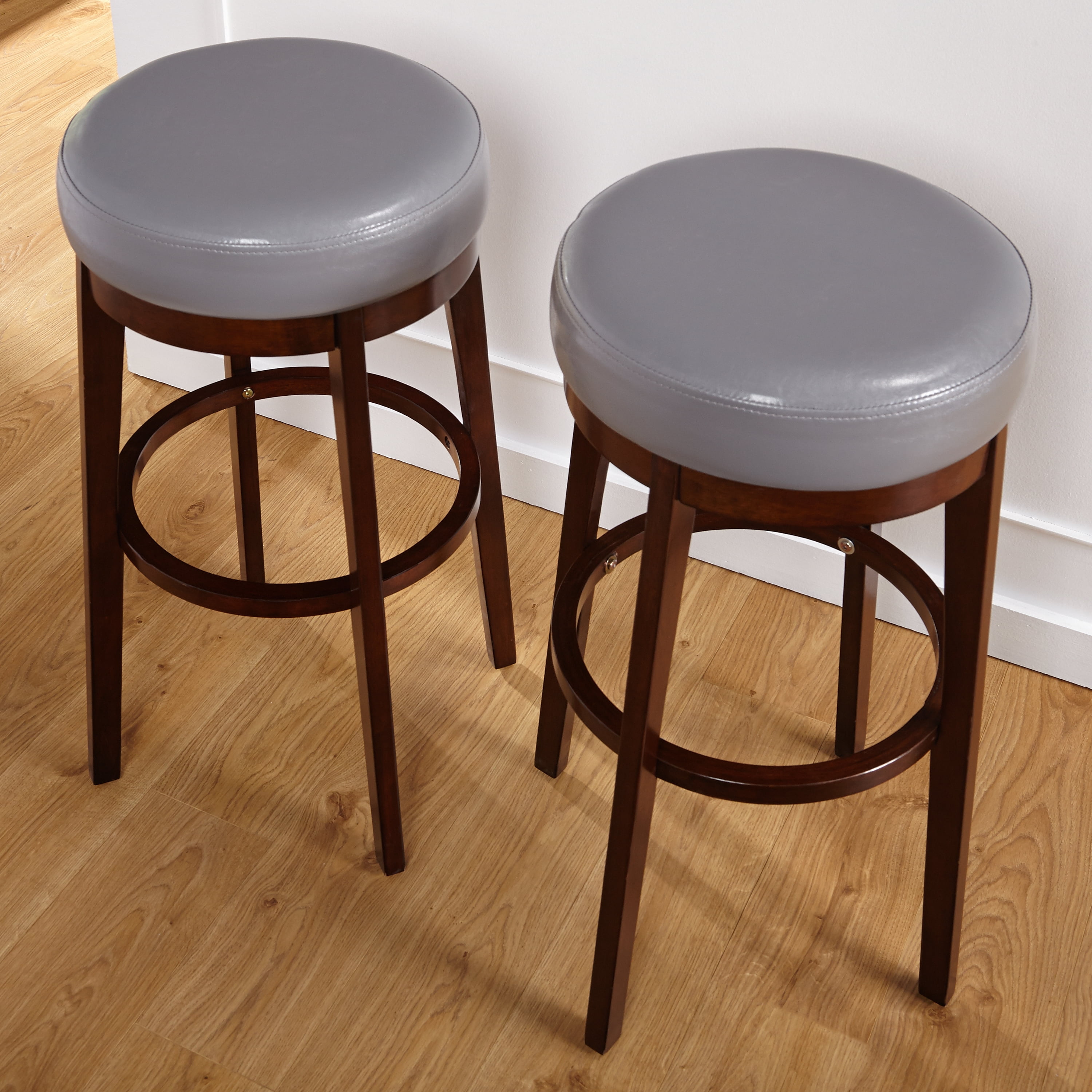 One (1) swivel seat stool Rubber wood base in a rich finish Upholstered in gray faux leather Materials: Rubber wood, Faux leather, Foam Bar height Stool dimensions: 30″H x 15.1 “W x 15.1 “D Seat dimensions: 15.1 “W x 15.1 “D Foot Ring for stability and added comfort For indoor use only Requires some assembly.
