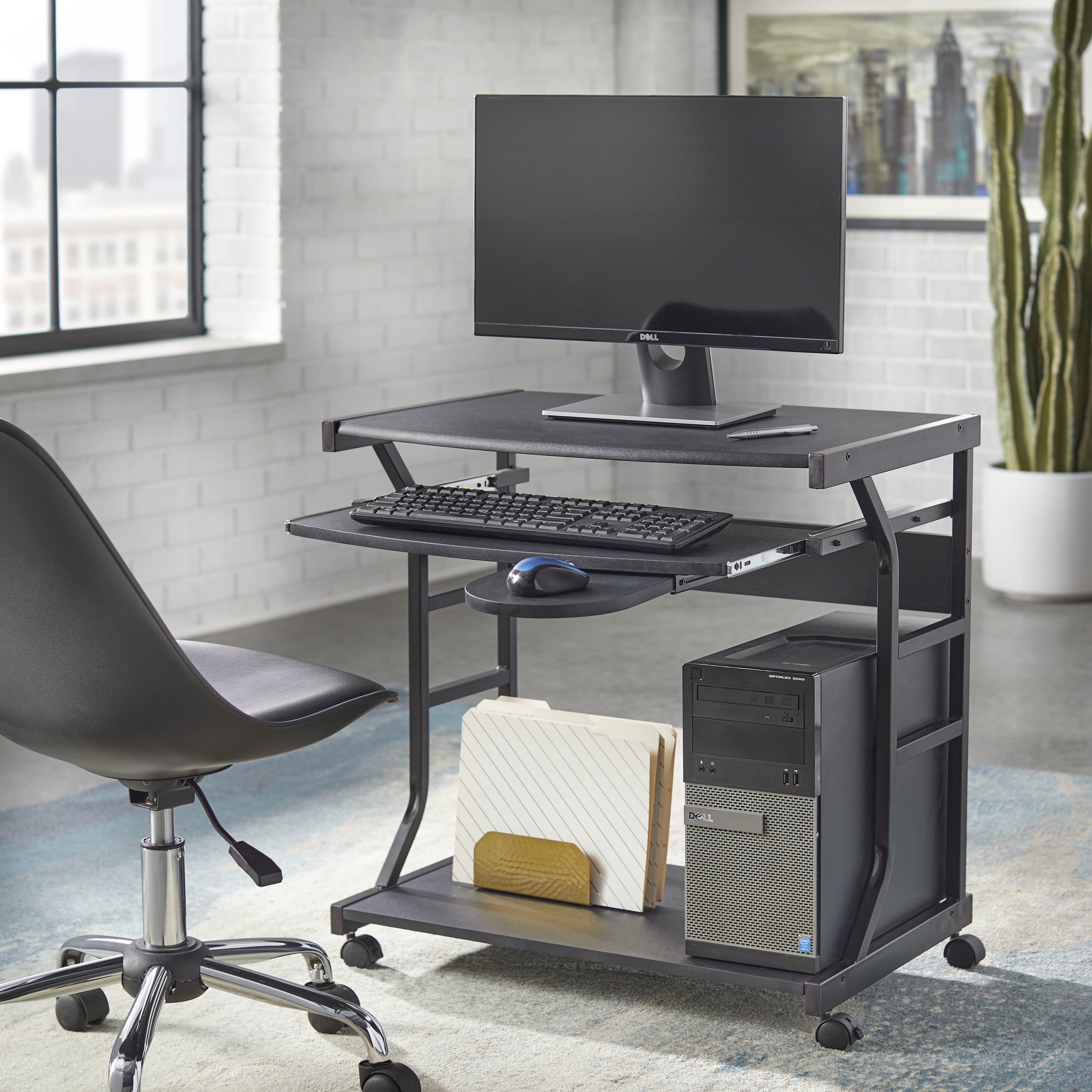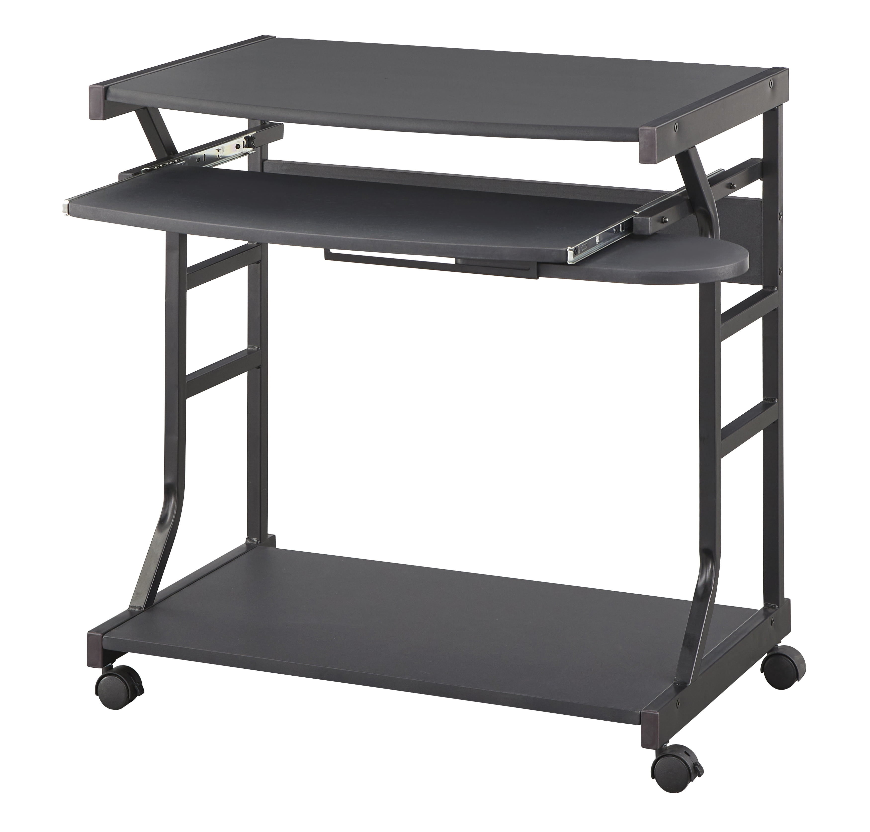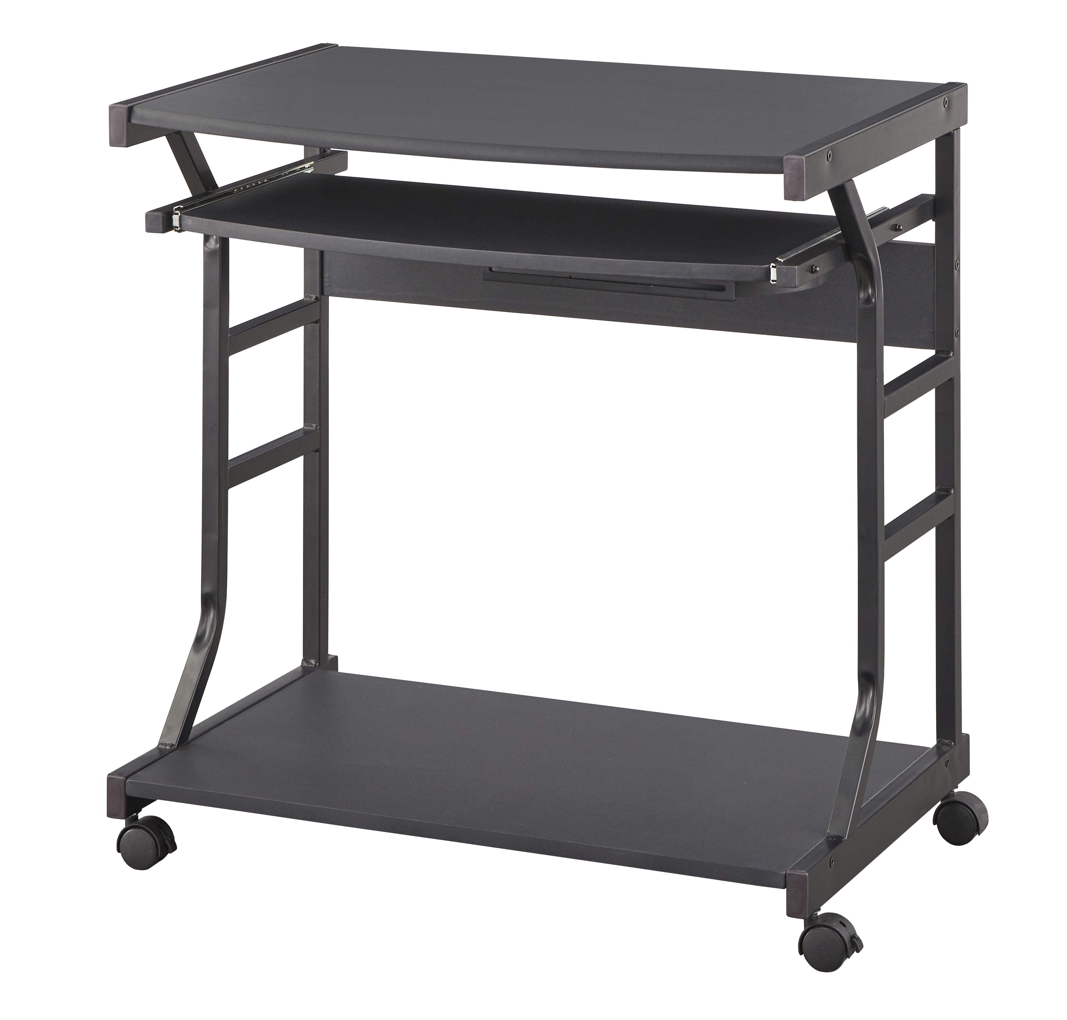 TMS Berkeley Rolling Computer Workstation Desk, Black Finish Includes: one (1) computer desk Contemporary style works well in many room interiors Compact size is perfect for smaller spaces Open design Features a sliding keyboard shelf and mouse surface Castor wheels for easy mobility Black finish Ships in one (1) carton, assembly required Constructed with stamped PVC, powder coated steel frame, and MDF Desk dimensions: 28 inches high x 19.5 inches wide x 27.5 inches long
