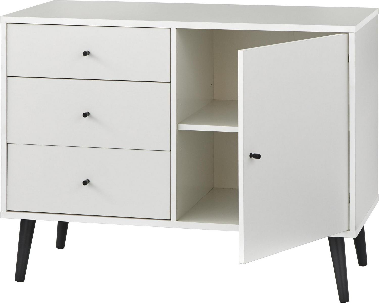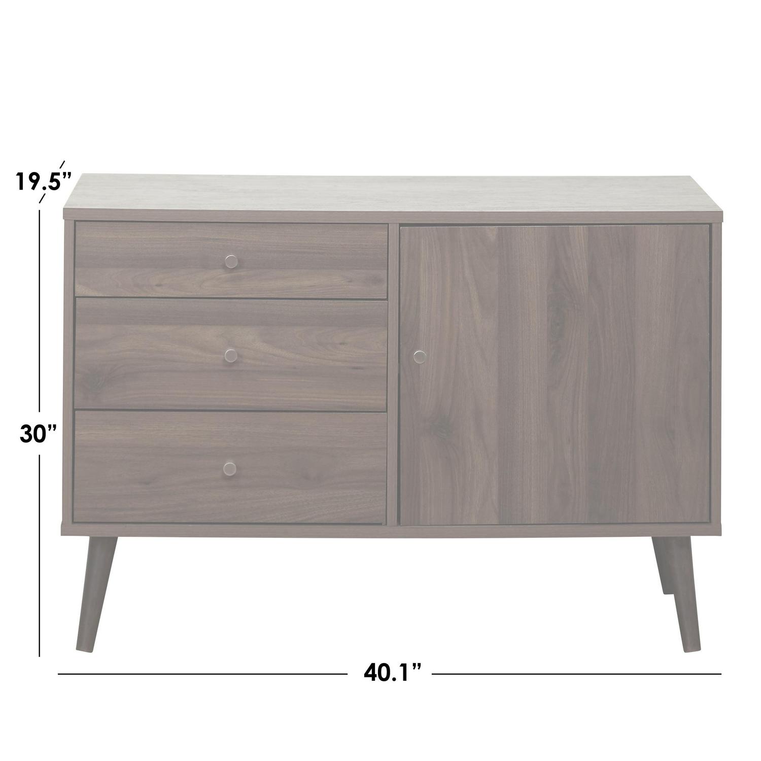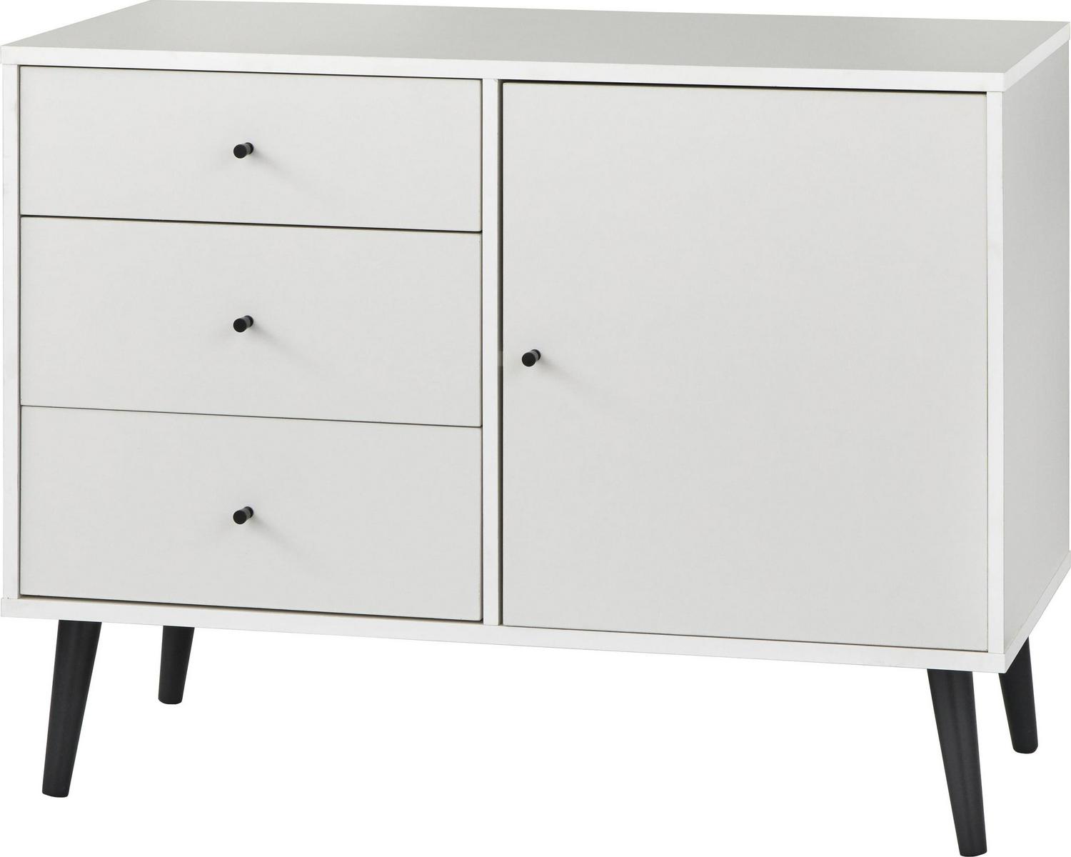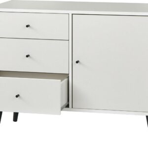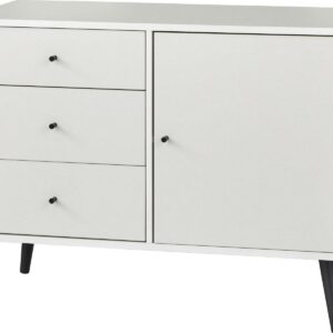 The Carroll Mid-Century Buffet is the essential storage cabinet for any dining room area. Mid-Century inspired styling with sleek slim lines, this cabinet is skillfully crafted with black solid tapered wood legs and durable laminated particle board, featuring a striking white finish accented with contrasting black knobs. A lovely addition to any dining room, the Carroll Buffett offers three drawers along for organizing flatware, cutlery, and table linens along with a closed door cabinet, which is ideal for storing all your entertaining essentials such as glassware, wine accessories and more. Complete with an interior adjustable shelf, this cabinet is so versatile it may also be used as a TV stand, living room credenza or a kitchen sideboard. Truly, this buffet is the perfect side storage piece and complement to any room. Assembly required.