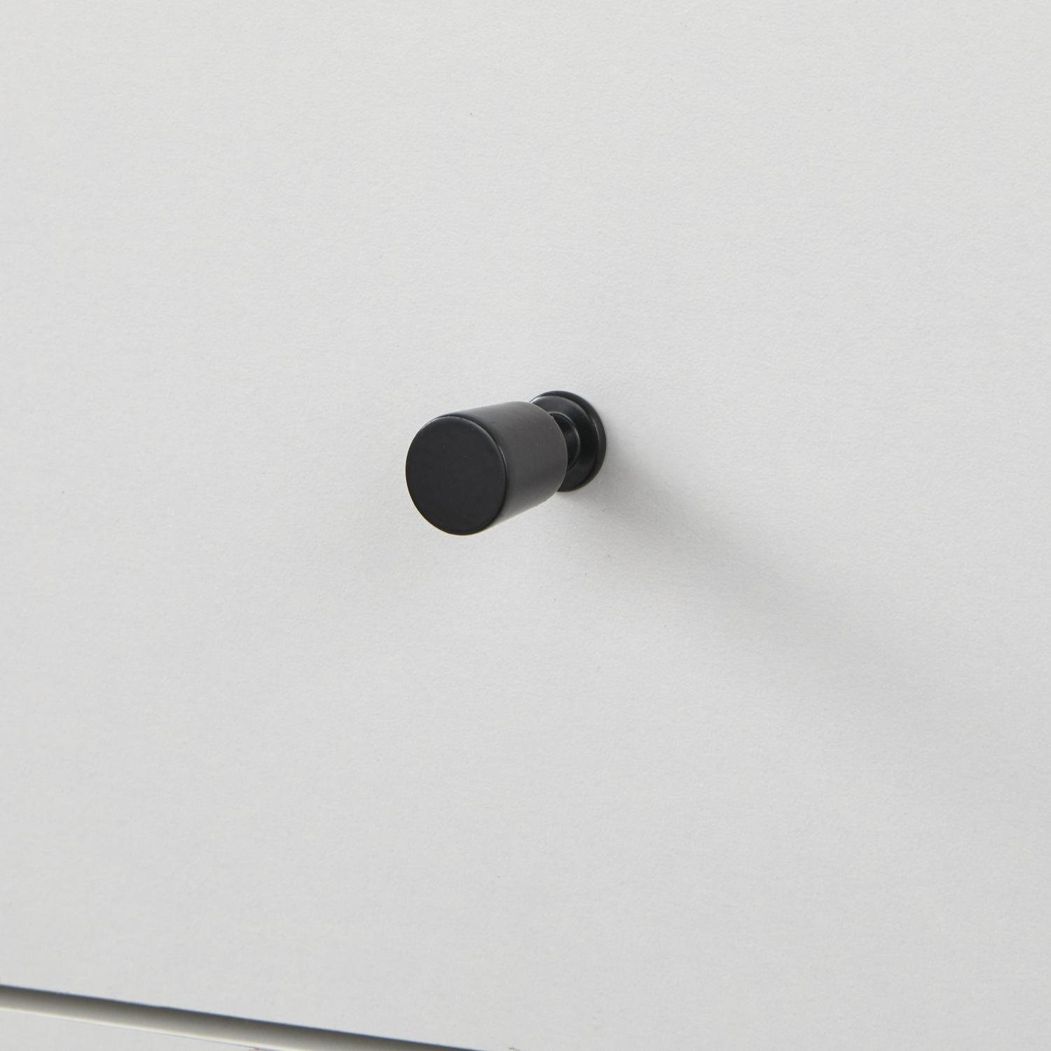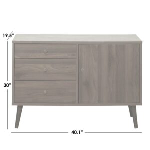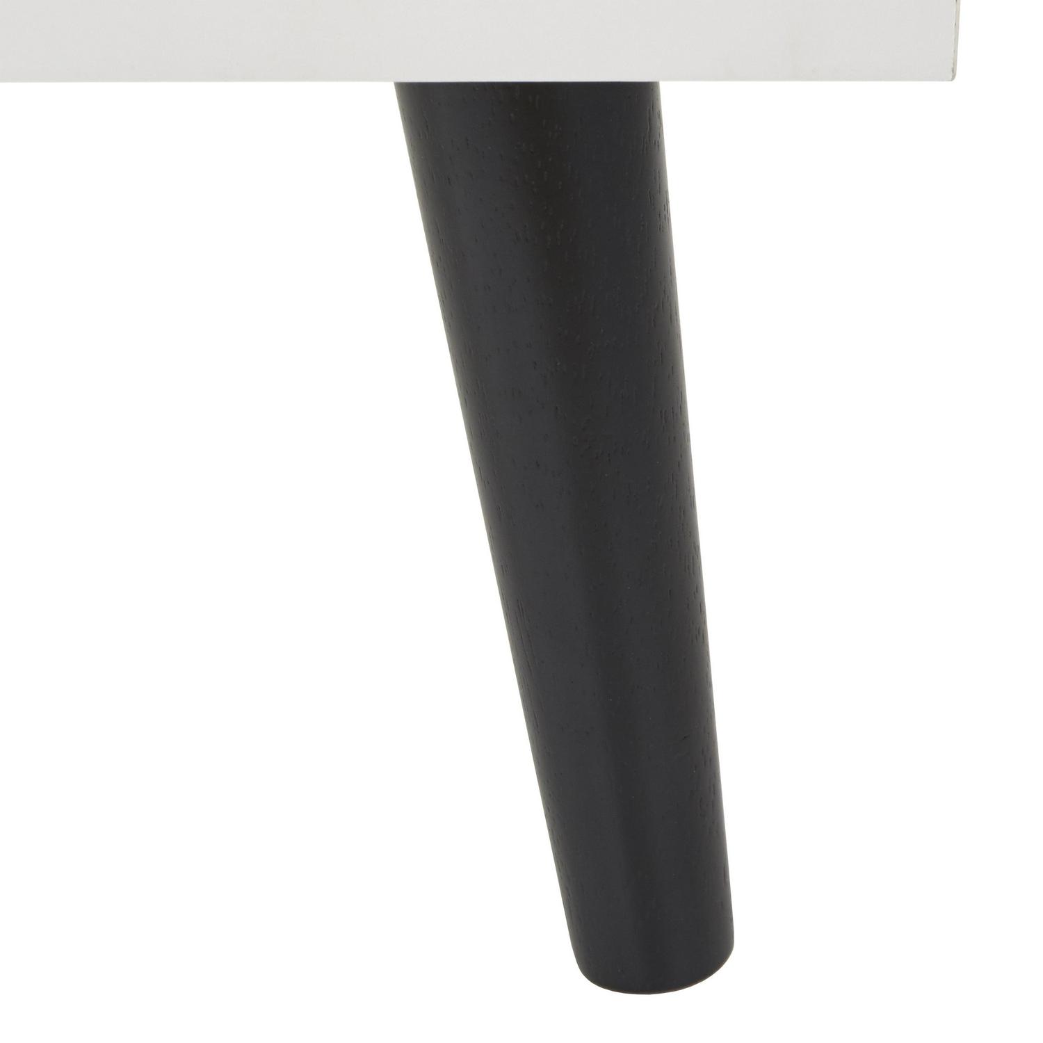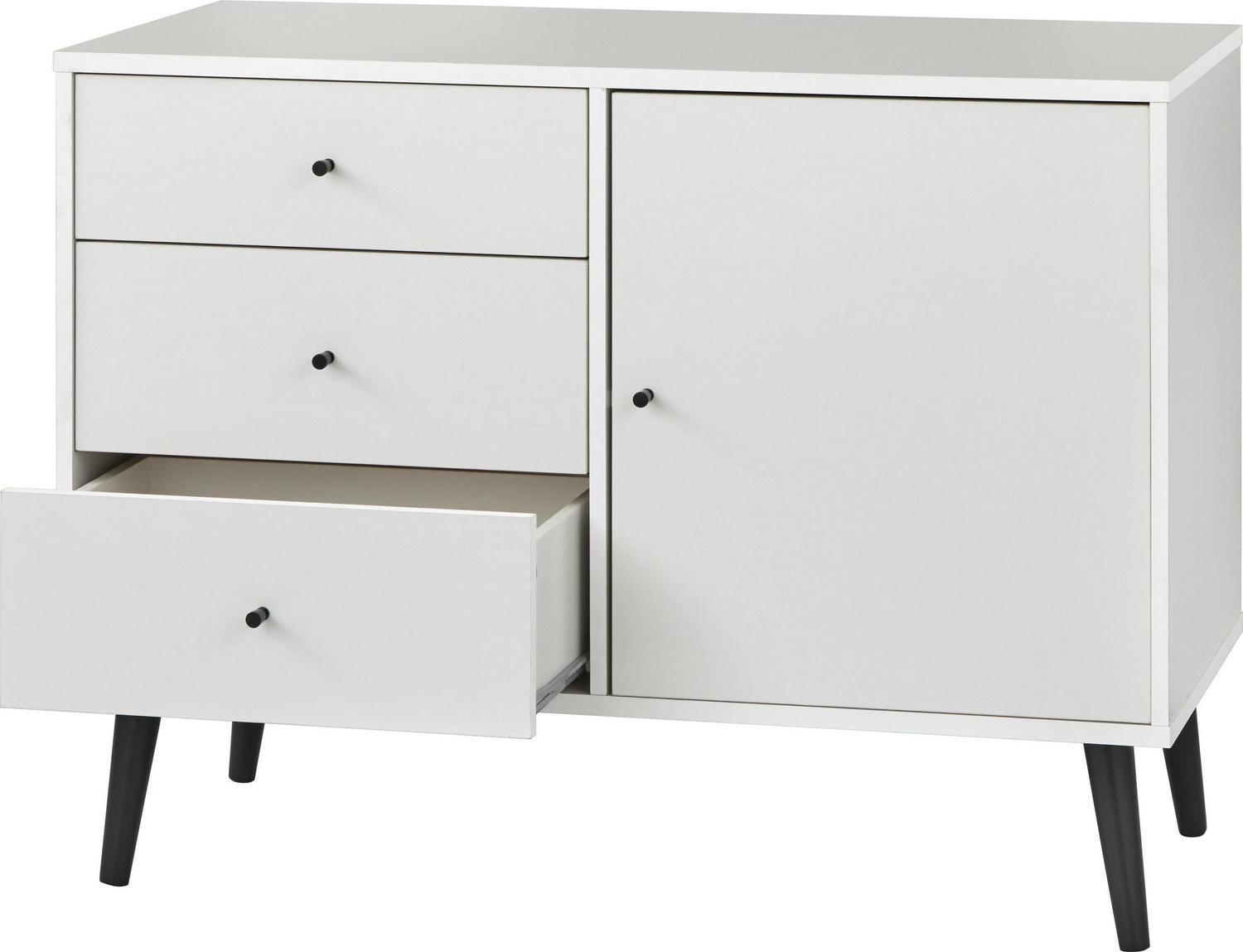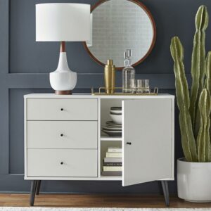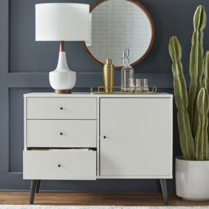The Carroll Mid-Century Buffet is the essential storage cabinet for any dining room area. Mid-Century inspired styling with sleek slim lines, this cabinet is skillfully crafted with black solid tapered wood legs and durable laminated particle board, featuring a striking white finish accented with contrasting black knobs. A lovely addition to any dining room, the Carroll Buffett offers three drawers along for organizing flatware, cutlery, and table linens along with a closed door cabinet, which is ideal for storing all your entertaining essentials such as glassware, wine accessories and more. Complete with an interior adjustable shelf, this cabinet is so versatile it may also be used as a TV stand, living room credenza or a kitchen sideboard. Truly, this buffet is the perfect side storage piece and complement to any room. Assembly required.