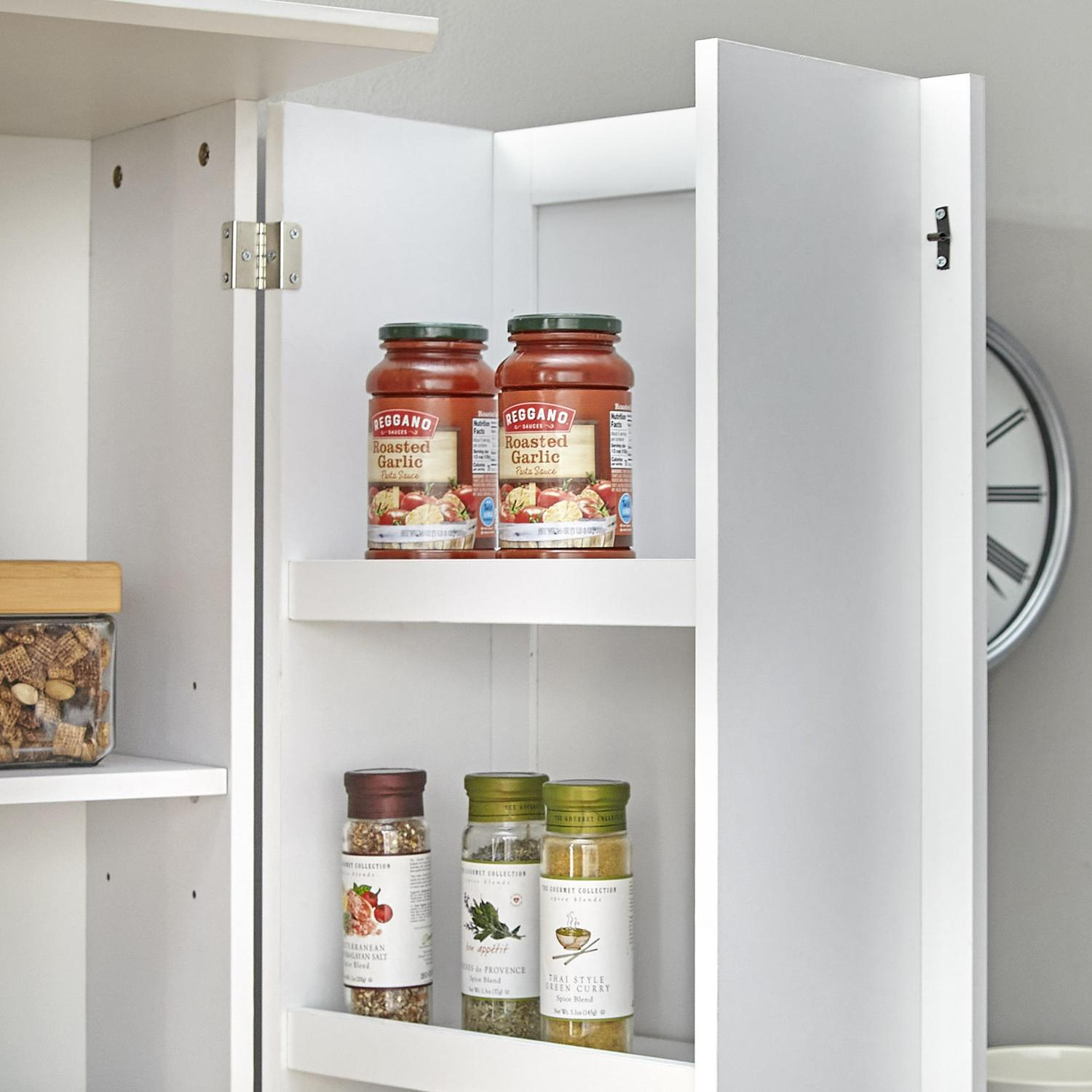 The Clarkson Tall Pantry from TMS is an organizing essential for any kitchen or dining area space. This almost 6′ tall cabinet is cleverly designed with added storage space built into the right-hand door. Perfect additional shelf space to store all your dry goods with two columns of adjustable shelves allowing space for various sized items. Constructed of sturdy particleboard in an attractive clean line modern farmhouse style, this White finished cabinet coordinates easily with many styles of room interiors.