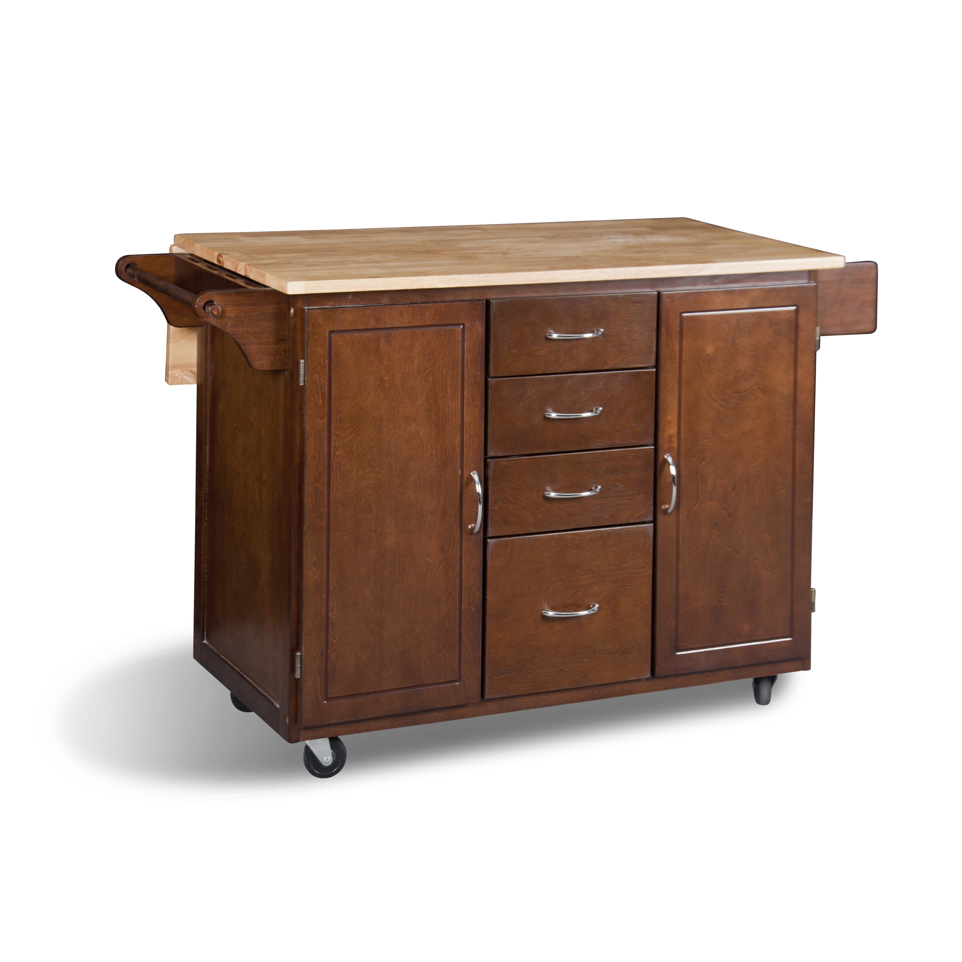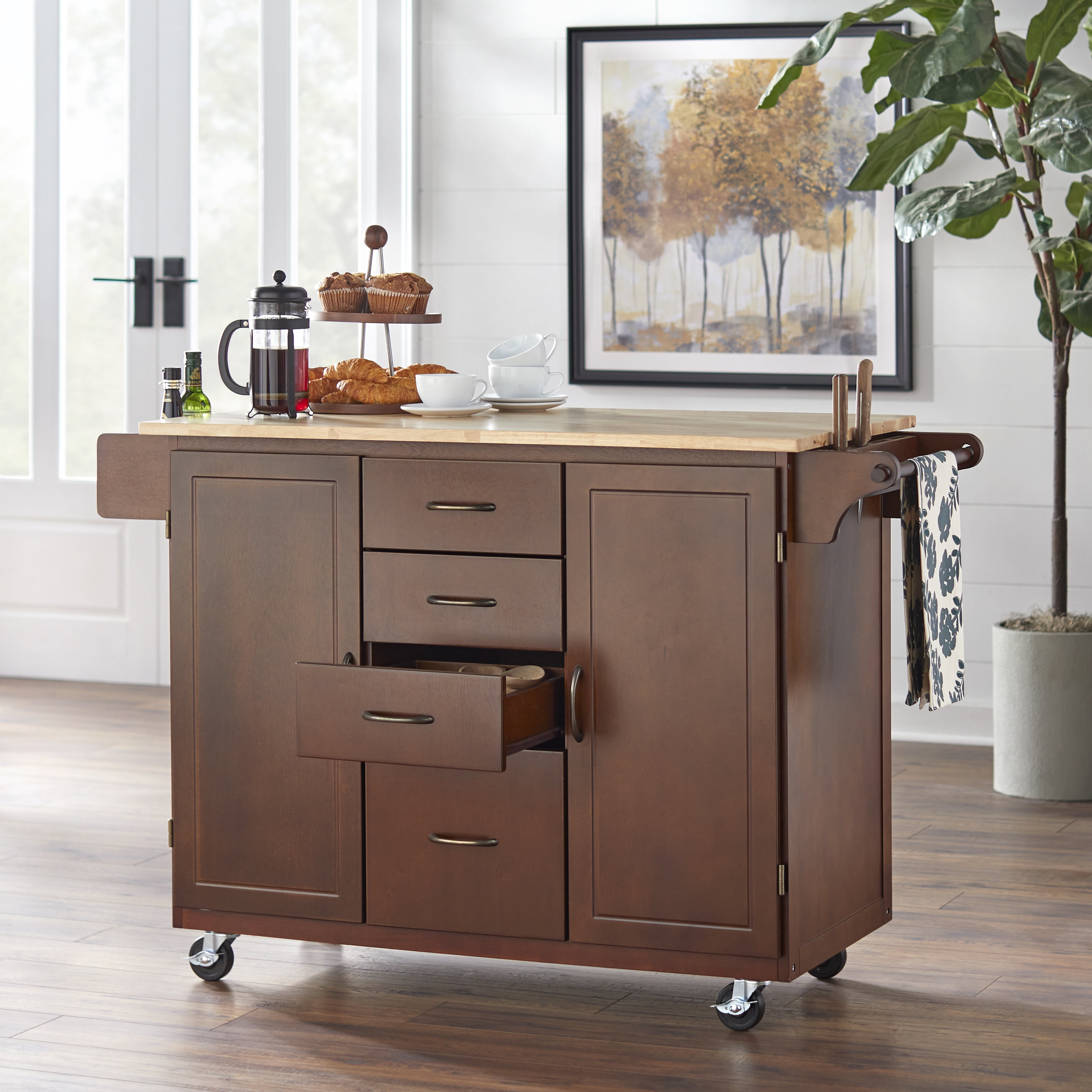 Country-style design Materials: rubber wood top, MDF with veneer and metal Available in White or Espresso finishes Natural wood top 4 utility drawers 2 door storage cabinets with an adjustable shelf Features a knife block and towel bar on one side and a spice rack on the other 4 casters: 2 with front locking Overall dimensions: 35.75″ H x 54.5″ W x 22.5″ L Top 3 drawers dimension: 3.4″ H x 11″ W x 13.25″ L Lowest drawer dimension: 7.25″ H x 11″ W x 13.25″ L Cabinet dimension: 30″ H x 13″ W x 19.1″ L Assembly required Product Weight: 109 lbs.