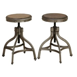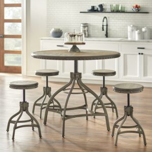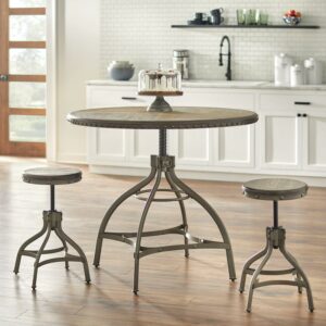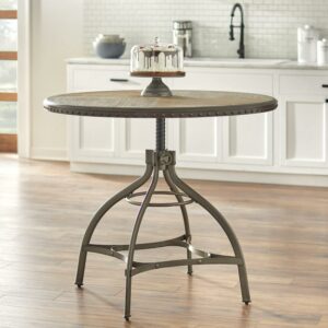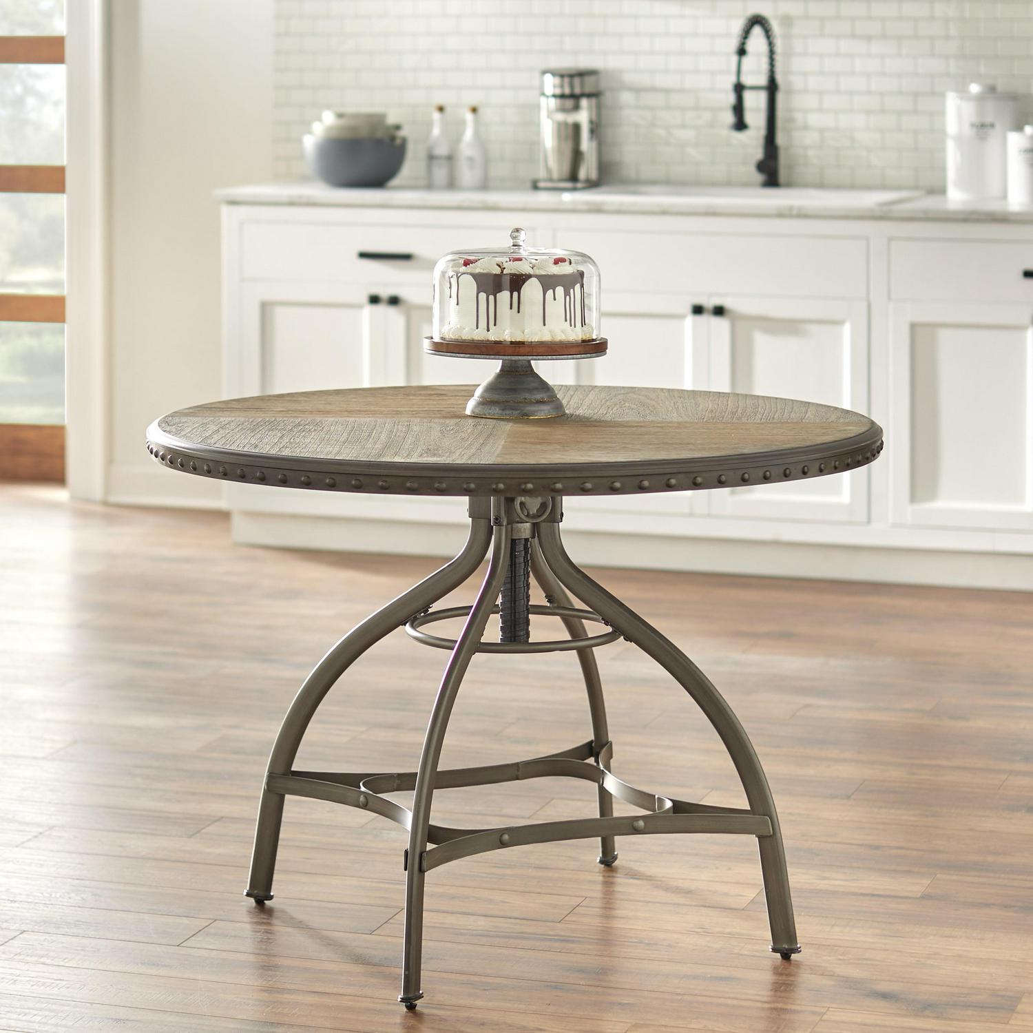 The Decker Adjustable Height Dining Table brings an industrial chic vibe into your dining room. The round weathered tabletop is made of engineered wood and adjusts up or down for a customized fit. Featuring a curved metal frame, detailed with large nail head trim are finished in distressed pewter which enhances the vintage appeal of this dining table.