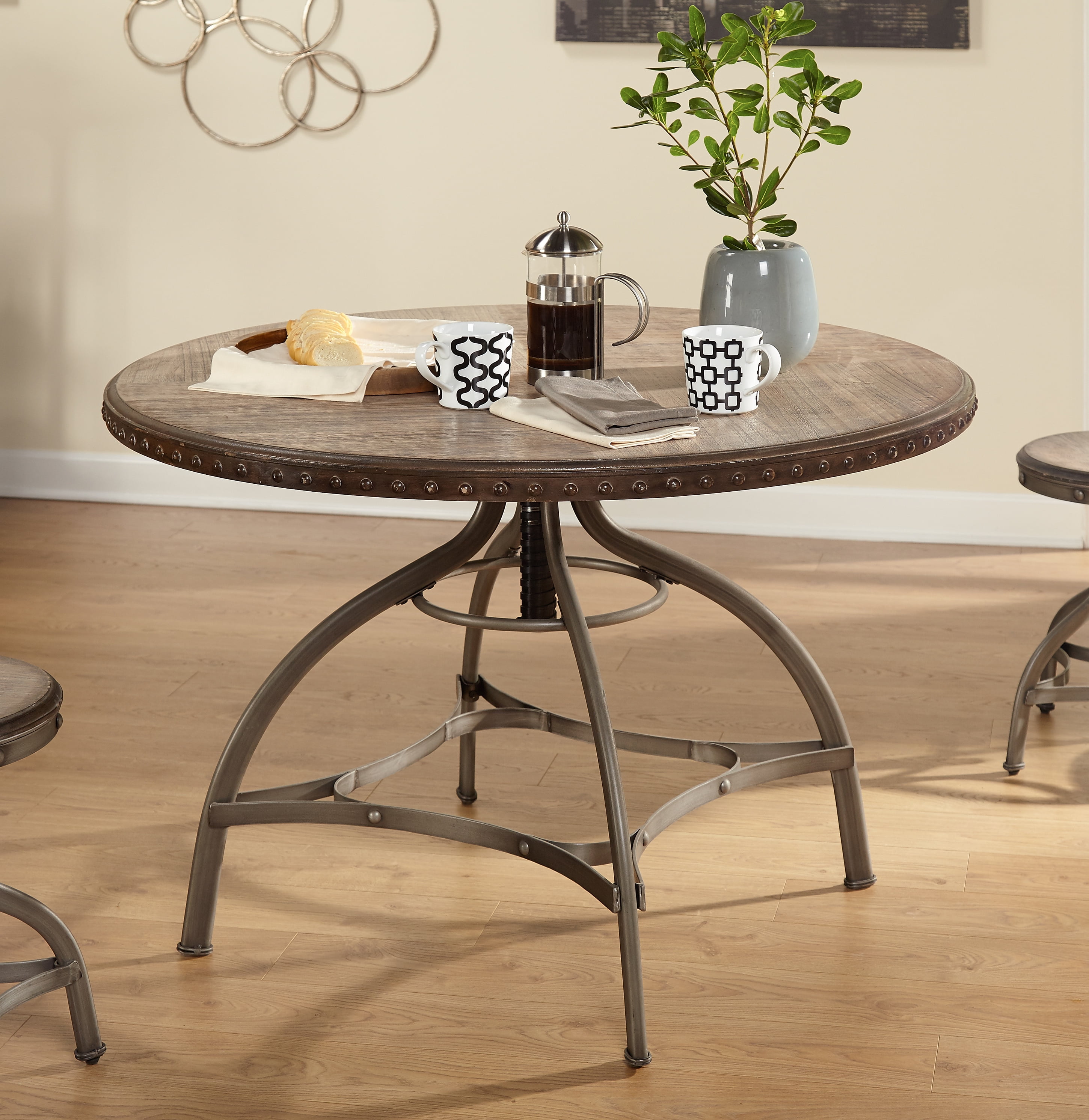 Bring a taste of old-world industrial style to your space with the Decker Adjustable Height Swivel Barstool from TMS. This two-piece stool set is inspired by turn-of-the-the-century design with seat tops that are crafted with wood veneers in a distressed finish. They feature a hand-brushed metal frame with detailed nail head trimmed seat edging, giving these stools an industrial rustic style. The added unique feature of these stools is their ability to adjust up and down providing versatility for various sized table heights along with a convenient easy swivel function.