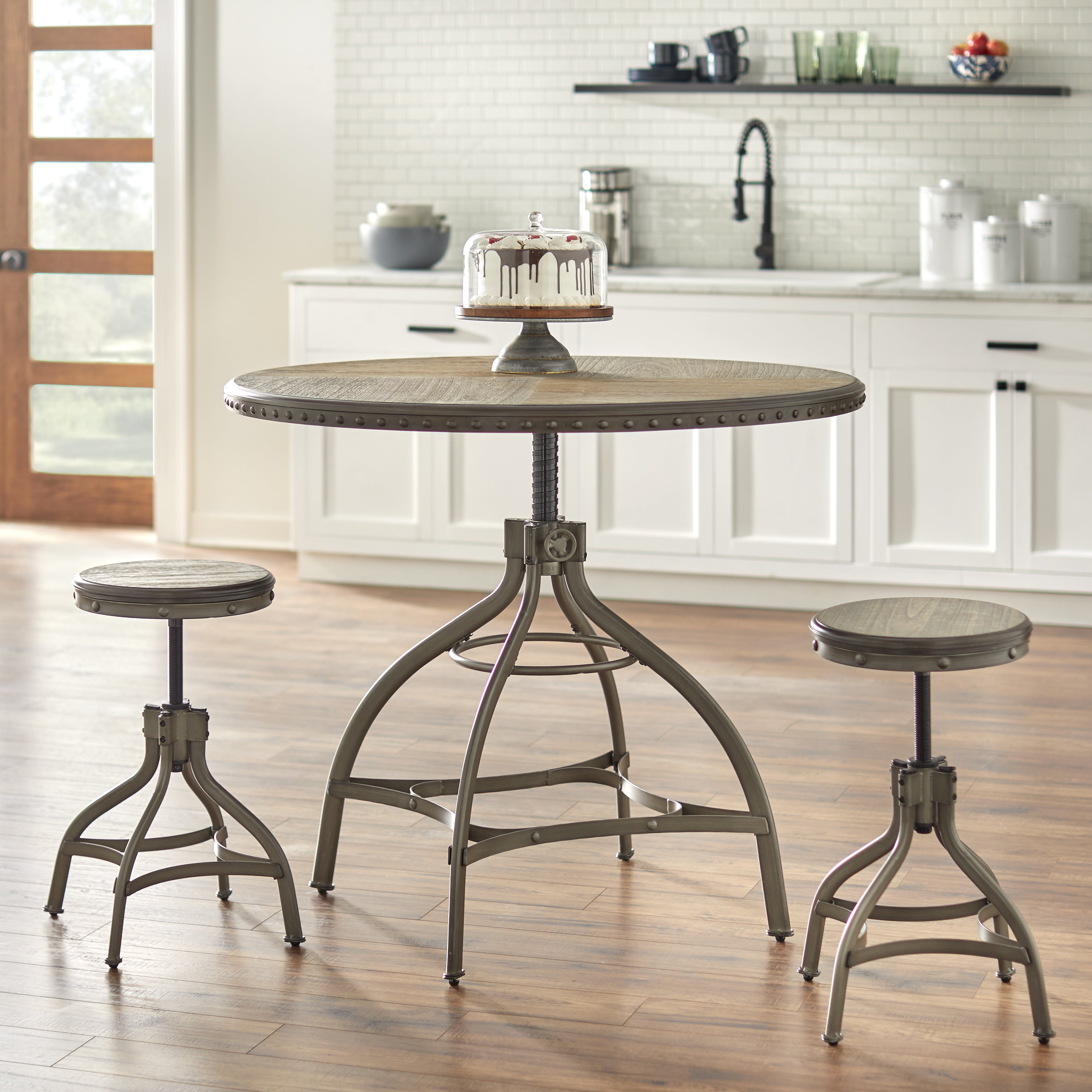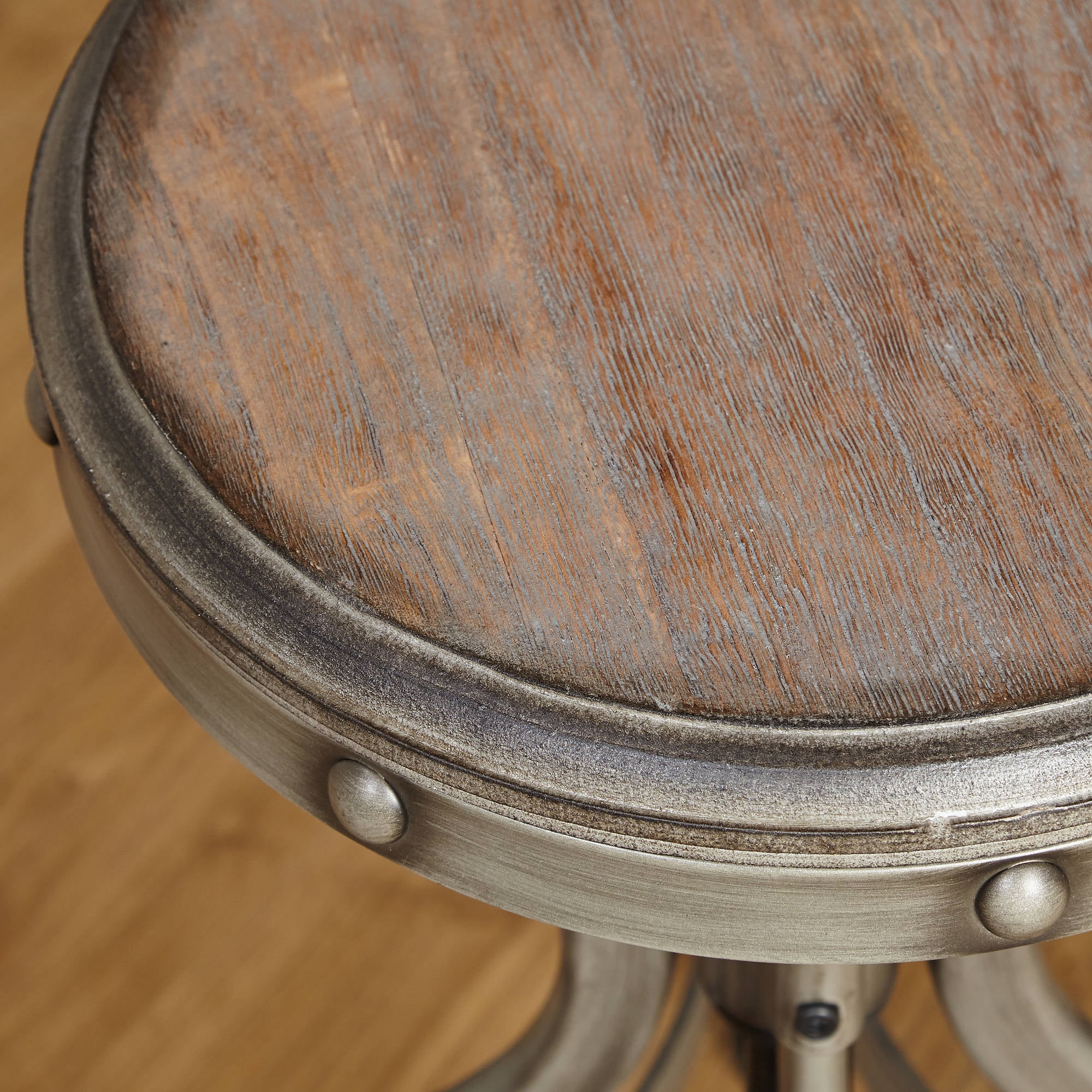 Includes: 2 stools Finish: Wood is a natural reclaimed look finish and the metal is pewter silver with a slightly distressed brush finish Nail head trims Materials: MDF with veneer, metal with a hand brush Adjustable height swivel stools Stool dimensions: 20″ to 25.5″ H x 20.5″ W x 20.5″ D Seat dimensions: 14″ W x 14″ D Seat height: 20″ up to 25.5″ Assembly required Ships in 1 box For Indoor Use Only