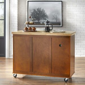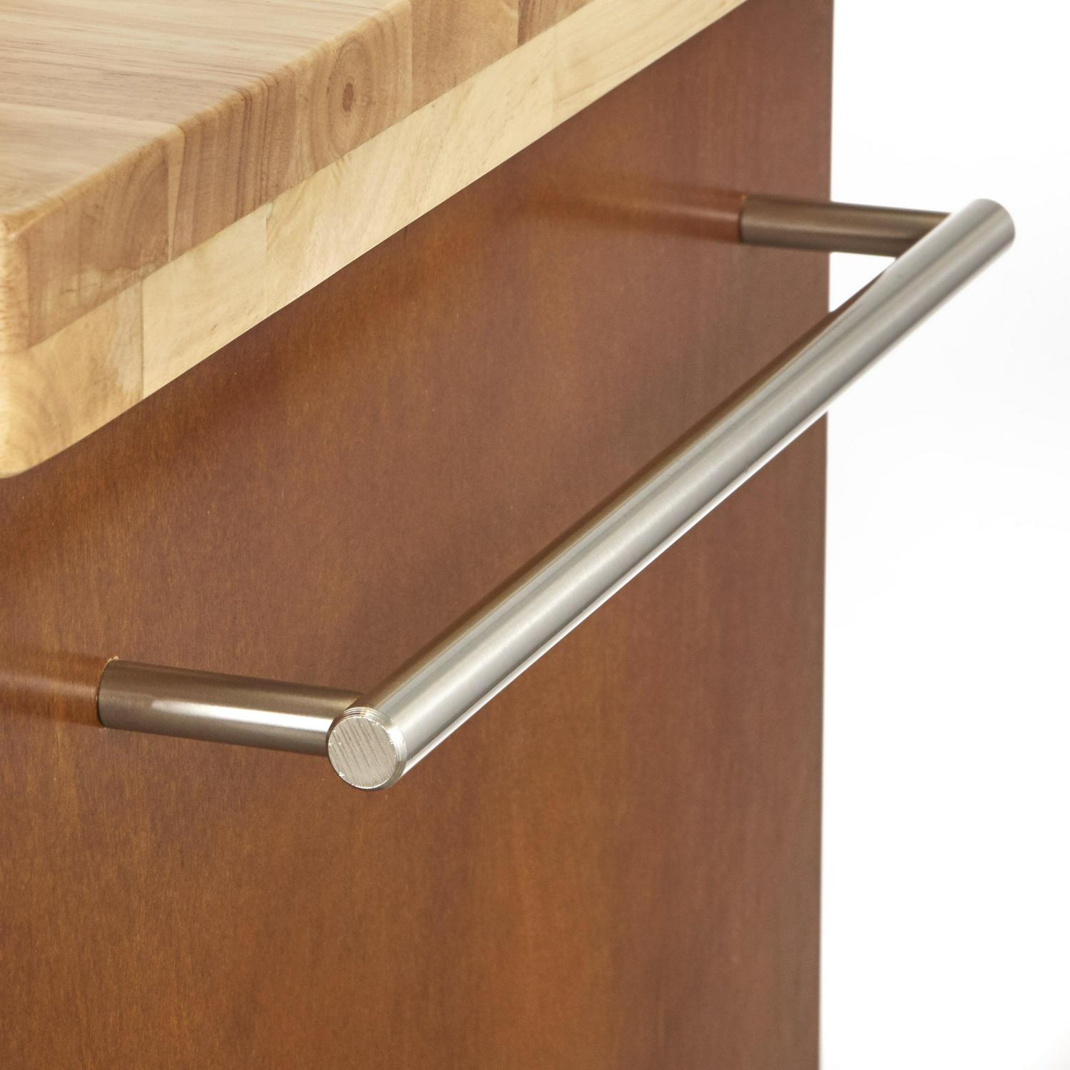 The Galvin Microwave Kitchen Cart by TMS is a modern rolling cart and a lifesaver in the kitchen. Maximize limited counter space with the addition of this cart providing space for your microwave, ample surface top for meal prep along with a conveniently located side cabinet towel rack. The cart features seven open compartments, including one large shelf for your microwave, with an opening in back for management of your cords to pass through. The cabinet features an adjustable shelf, providing additional room for storing essential kitchen items. Open compartments offer ideal storage for linens, serving pieces, glassware while the closed cabinet provides added space for dishware, small appliances, or pantry type items. Two of the four wheels are lockable, allowing for easy mobility as well as keeping the cart in place when needed. Crafted of durable medium density fiberboard, this versatile cart is finished in a warm walnut and topped with a solid rubber wood surface in a natural finish. Assembly required.