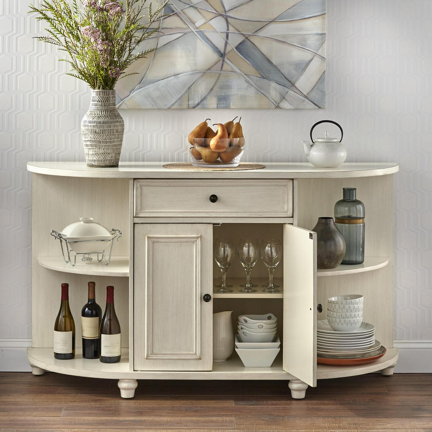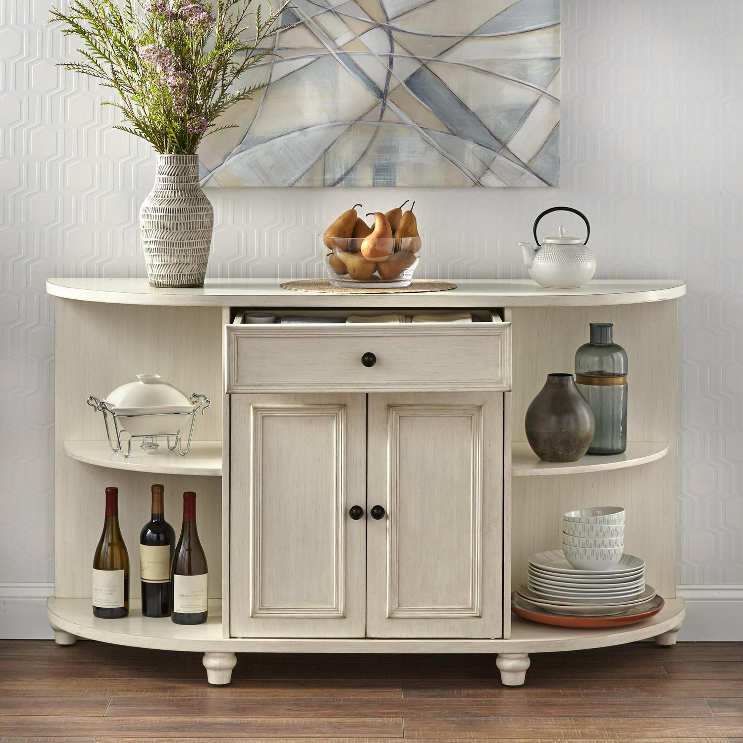 Give your kitchen farmhouse appeal with the Grace Kitchen/Dining Room Sideboard from TMS. This sideboard adds just the right amount of storage and style to your living space. Available in two colors, Antique White, or Antique Blue, making it compatible with almost any interior. This buffet features a closed cabinet along with four open shelves and a stylish curved front. This convenient buffet allows you to store away your dining essentials while adding character to your kitchen or dining room. Made from MDF and Pinewood.
