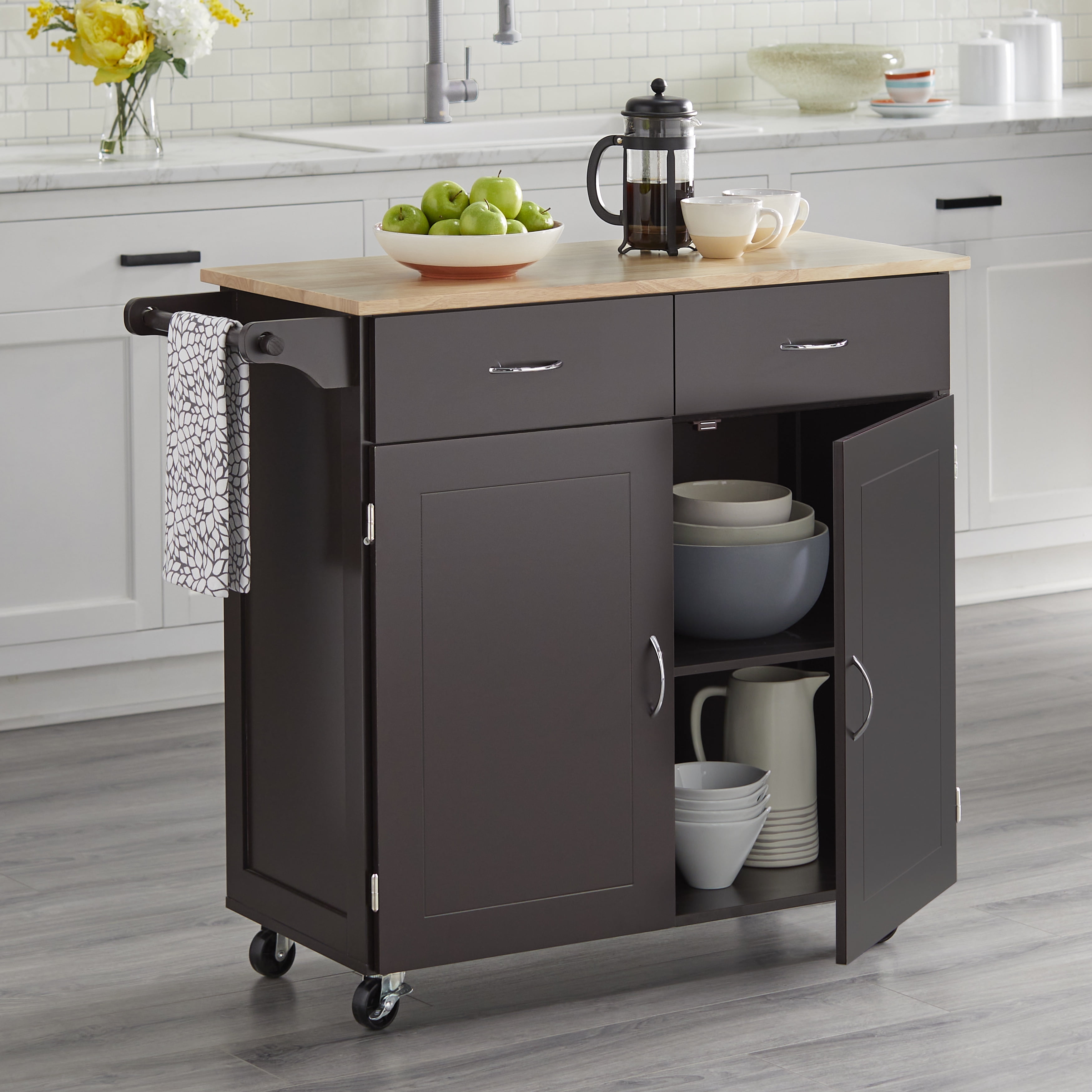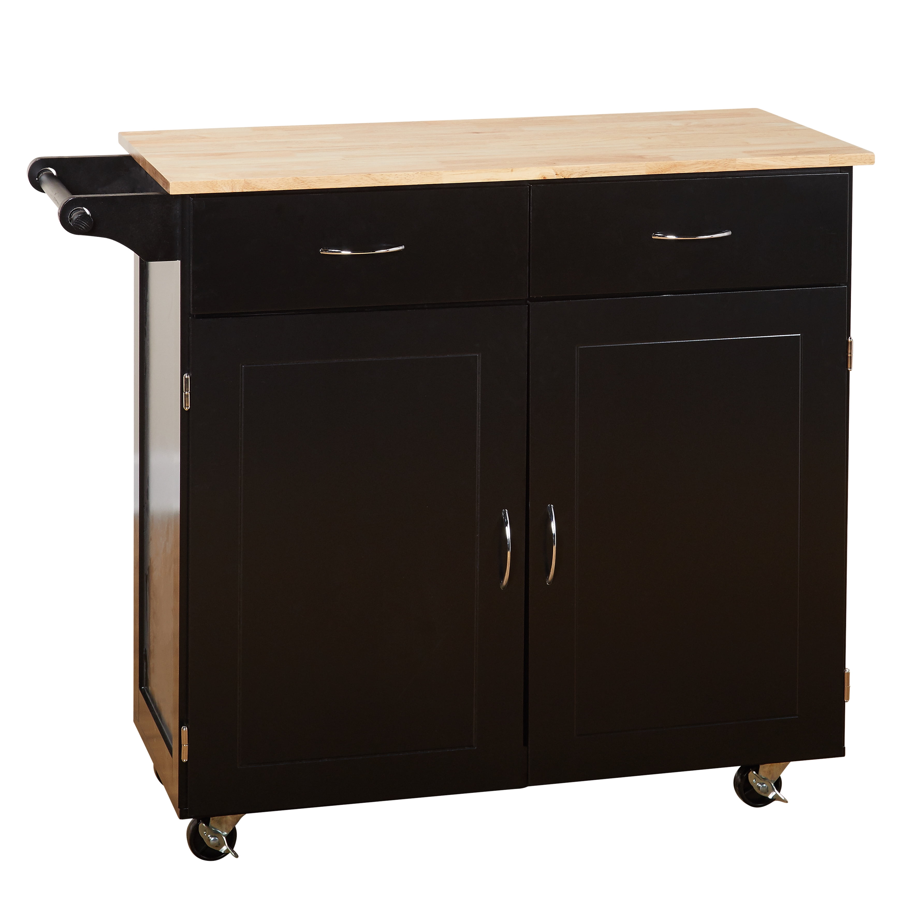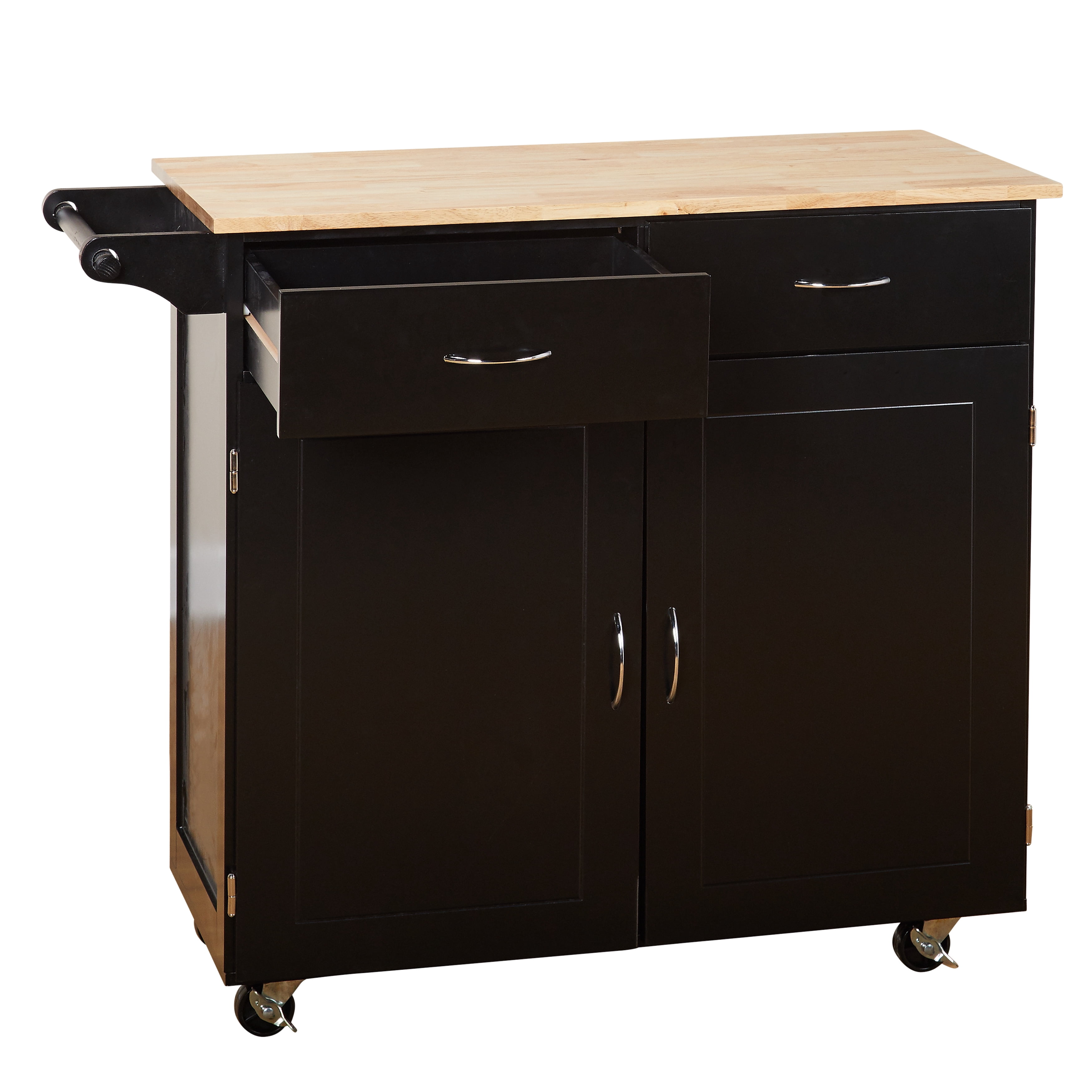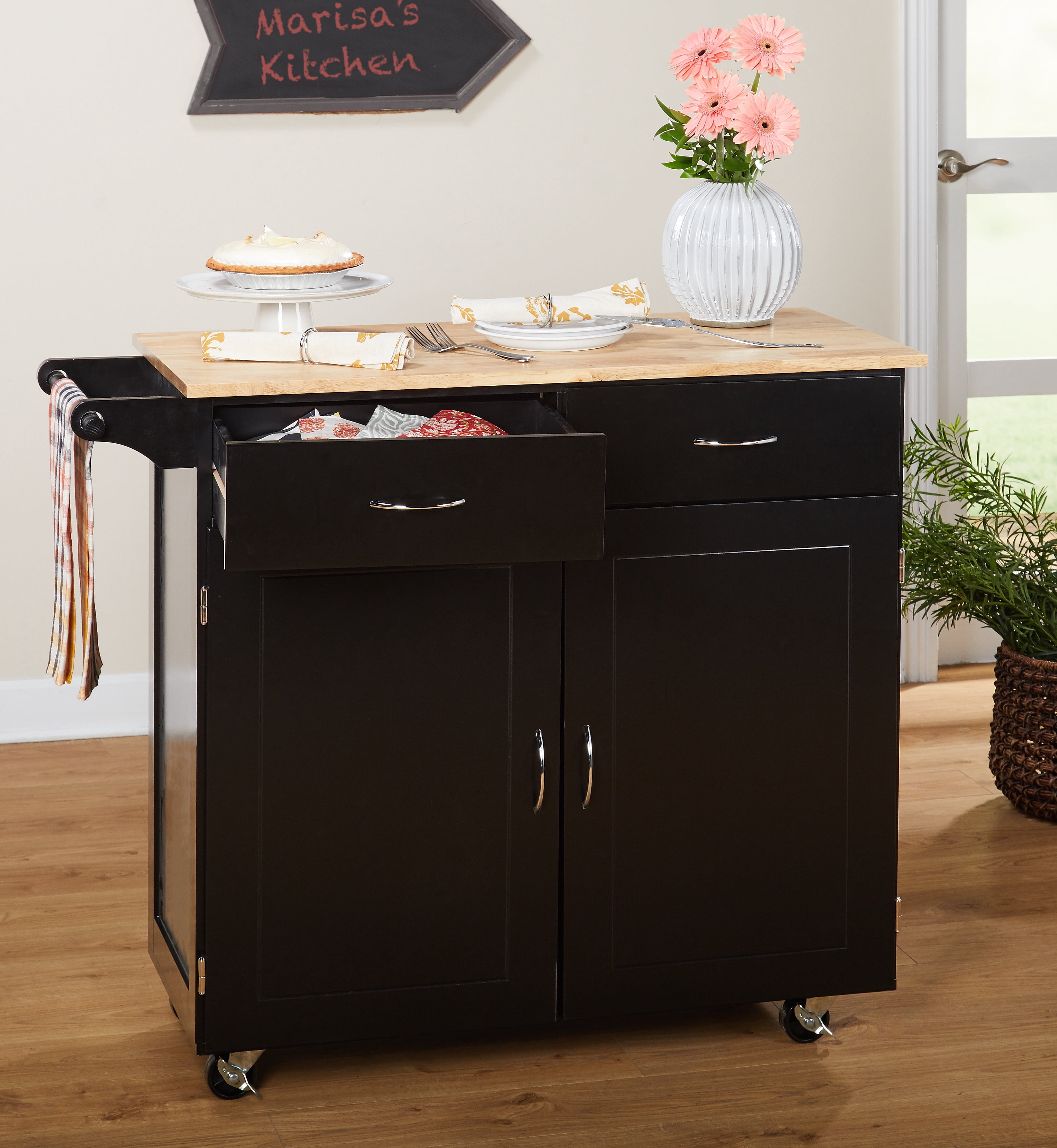 Who wants extra counter space! Now you can have it – without remodeling! The Kitchen Cart with Wooden Top is a clever kitchen helper offering handy storage and the additional workspace you need for baking, chopping, garnishing, pouring, and all the other divine things a kitchen is for. Twin drawers handle utensils, plastic wrap, wine openers, and more. The natural rubberwood top is dense, durable, and beautiful, while the base is finished in a contrasting hue for a two-tone look. The cabinet space can be customized by lifting, lowering, or removing the adjustable shelf to make room for China, stemware, or larger items like your stand mixer, blender, toaster, and more. Requires some assembly.