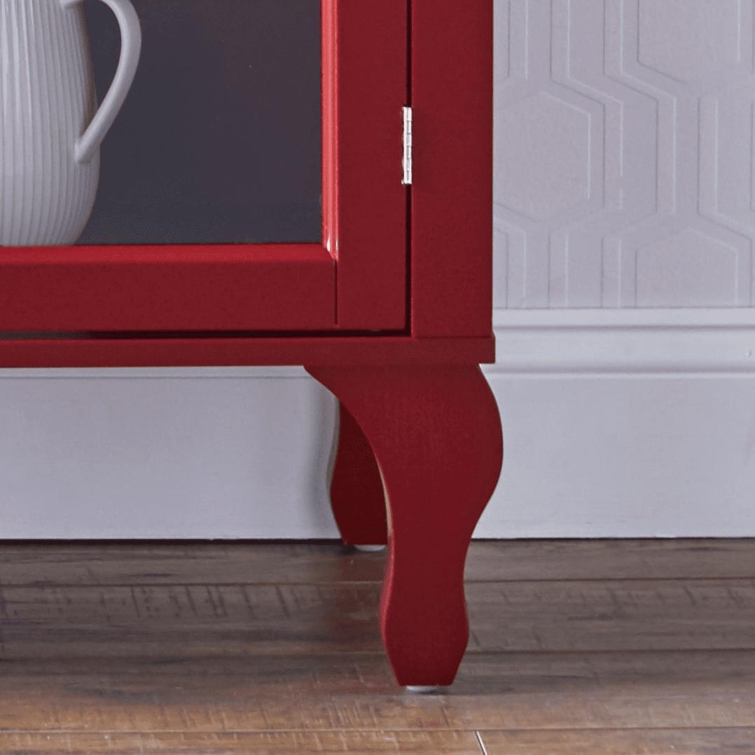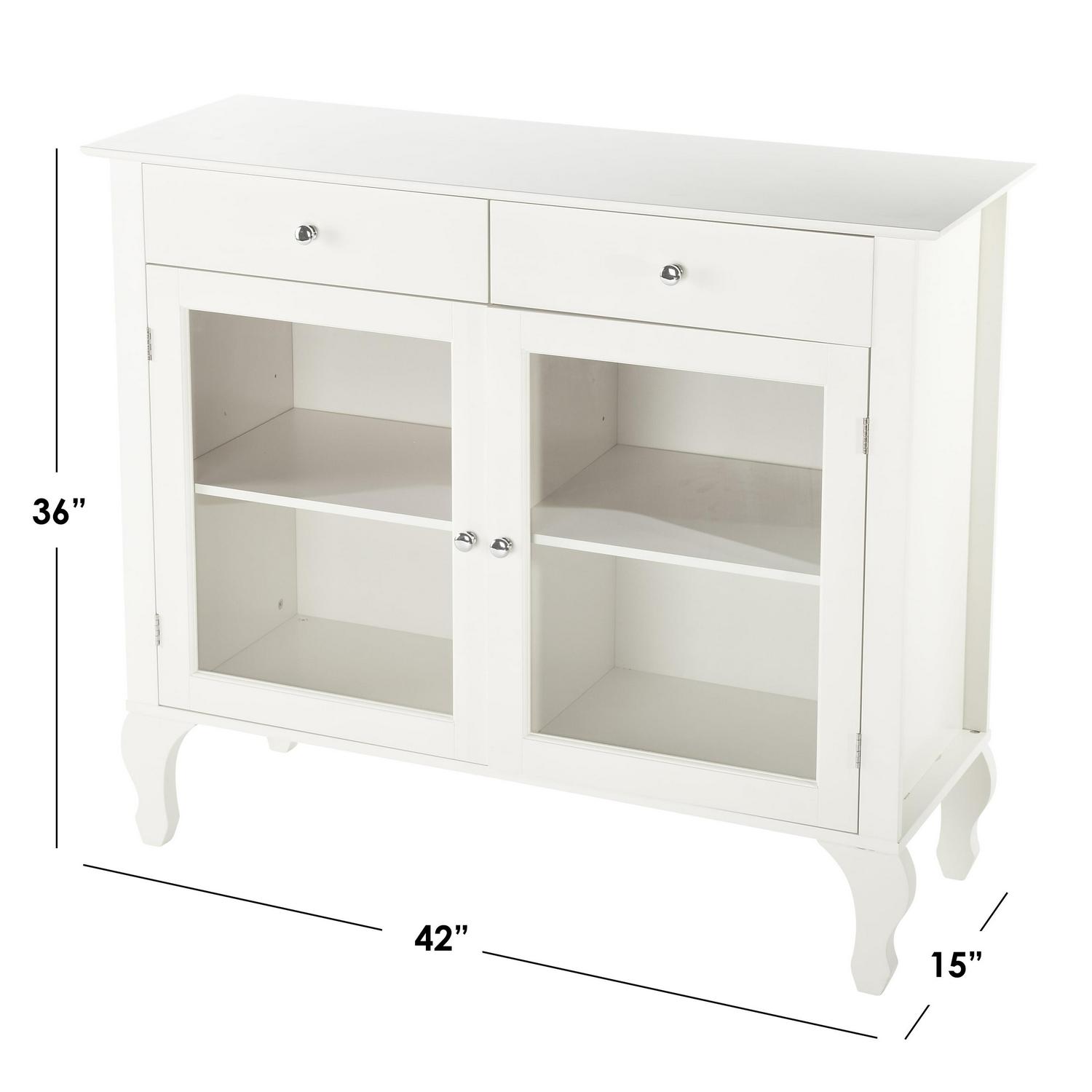 The Layla Buffet rests on petite Queen Anne style legs for a sleek, polished presentation. This storage cabinet has two tempered glass doors opening onto one adjustable shelf. Keep china or glassware on hand in your kitchen or dining area, or use this buffet in your foyer or bedroom to display pottery, art, and collectibles. Two drawers provide concealed storage for small essentials. Requires assembly.