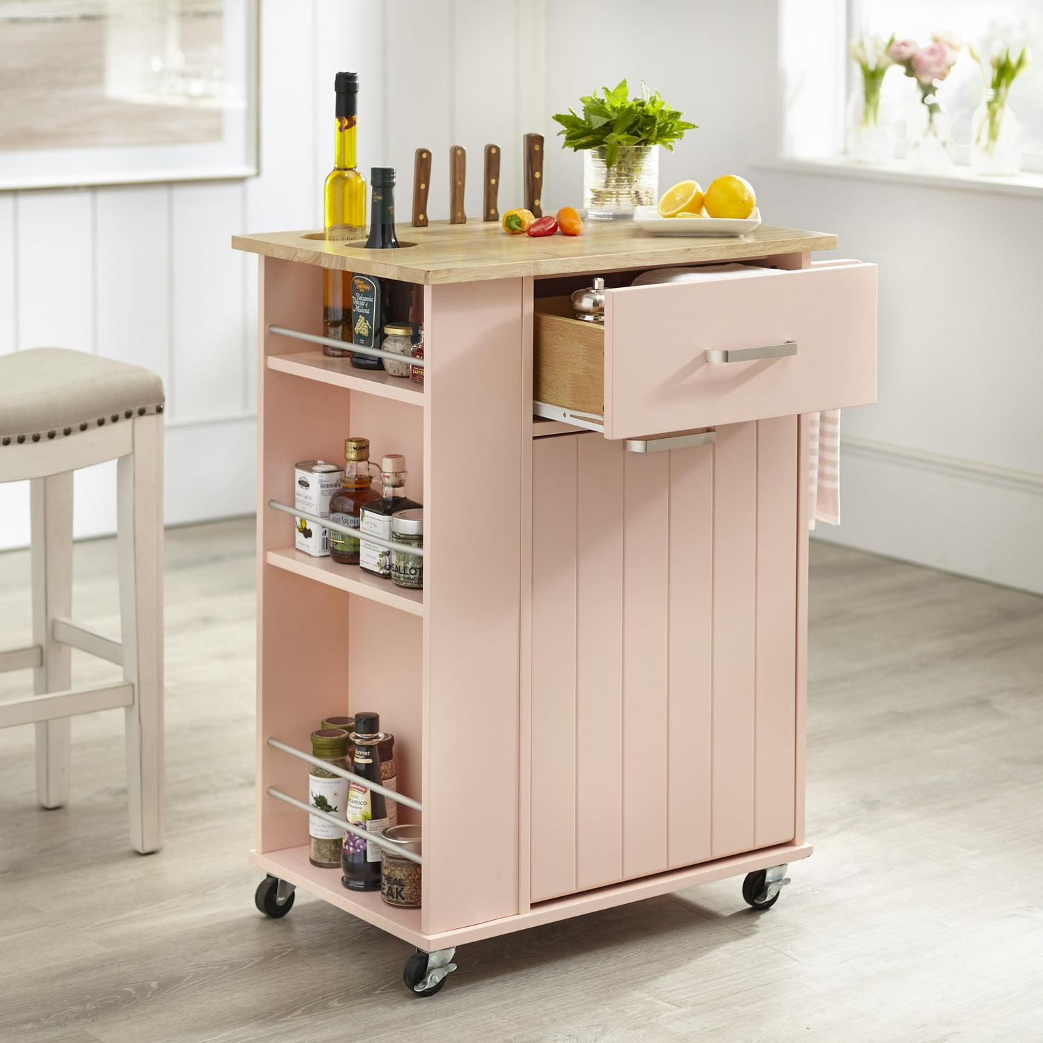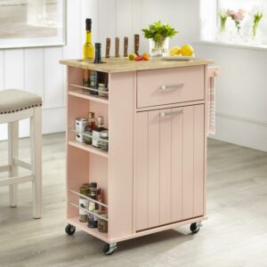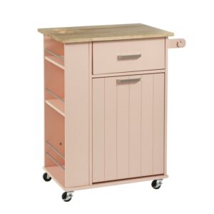 Store all your kitchen essentials in this charming Lima Kitchen cart. Three side shelves and a drawer offer space for spices, cooking tools and more. Pull-out garbage compartment fits a small trash bin (8 gallon). Also features towel rack and casters for mobility. Crafted of sturdy MDF with a solid rubberwood top. Available in your choice of color Blush Pink and White