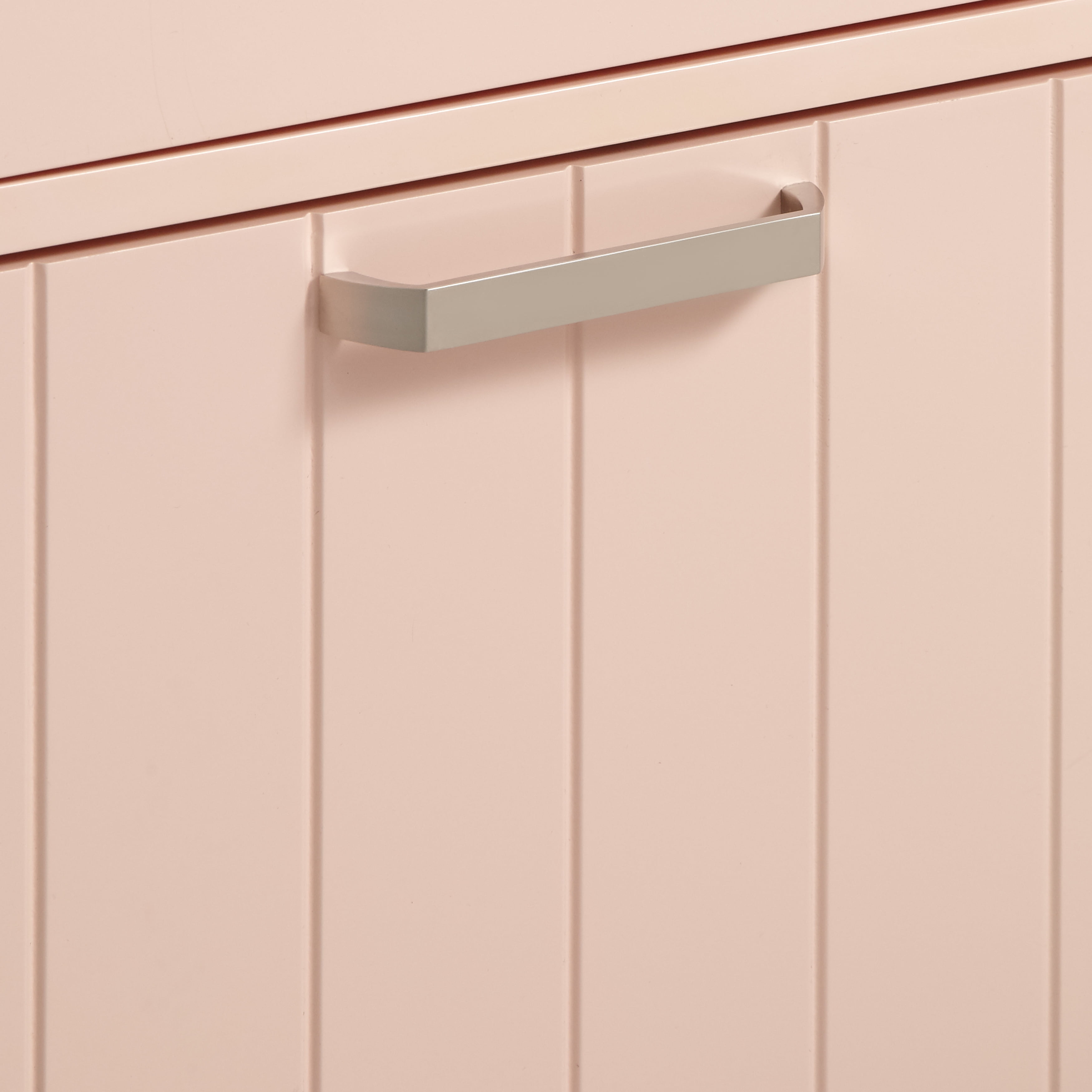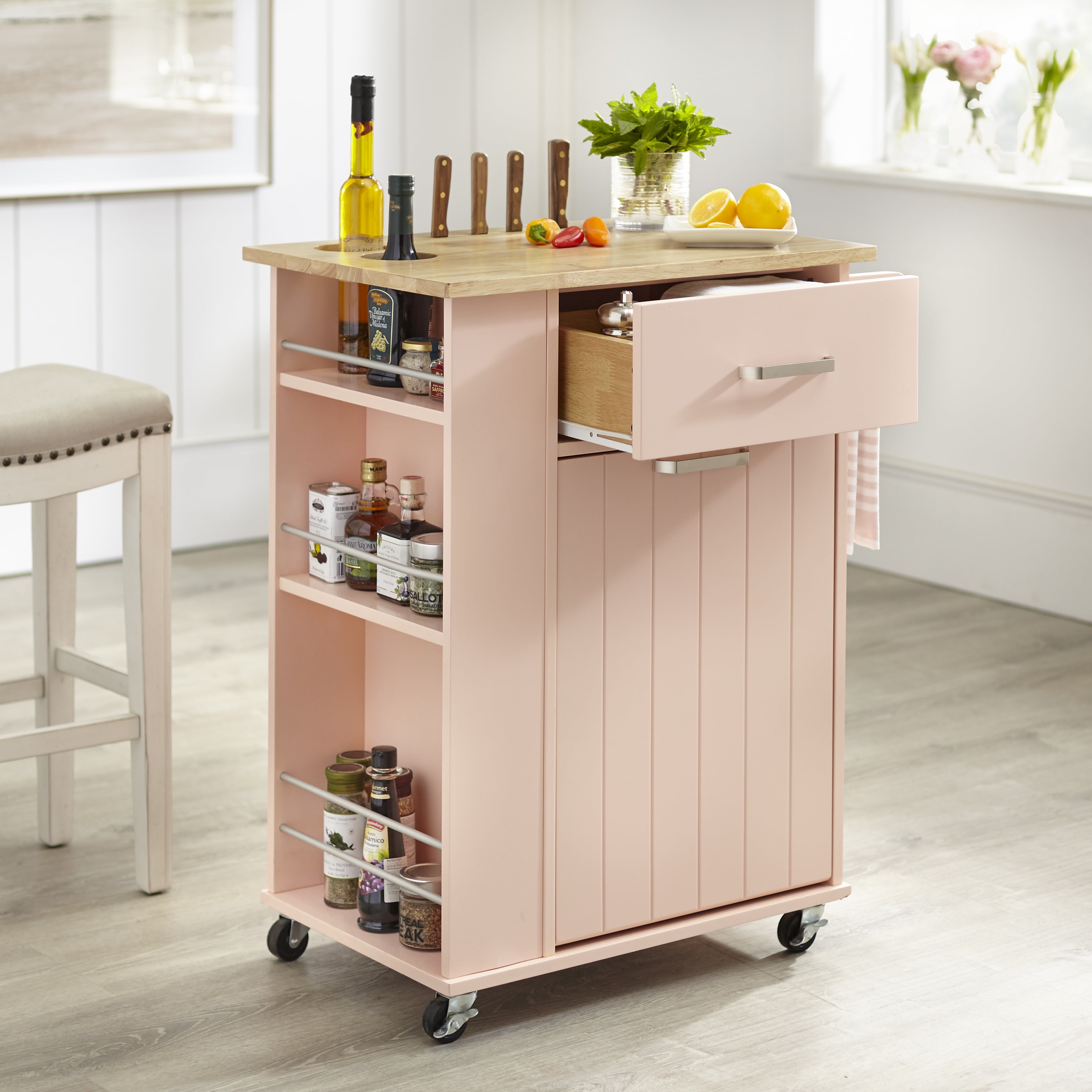 Includes one (1) kitchen cart One (1) drawer Three (3) tiered spice rack and towel bar Rolling castors (two are locking) Beadboard front on trash bin pull-out door Champagne finished pulls Crafted of MDF with solid Rubberwood top Blush Pink, White, Hunter Green or Gray finishes available Ships in one (1) carton Kitchen Cart overall dimensions: 34.4 “H x 28.7 “L x 17.7 “W Table top dimensions: 18 mm thick x 25 “L x 17.75 “W Trash bin dimensions: 15″H x 14.5 “W x 10.25″D (7 gallon) Inside drawer dimensions: 4 “H x 14.5 “L x 10.6 “W Spice rack top shelf dimensions: 5.25 “H x 14.4 “L x 4.9 “W Spice rack middle shelf dimensions: 9.25 “H x 14.4 “L x 4.9 “W Spice rack bottom shelf dimensions: 14.9 “H x 14.4 “L x 4.9 “W Product Weight: 65 lbs.