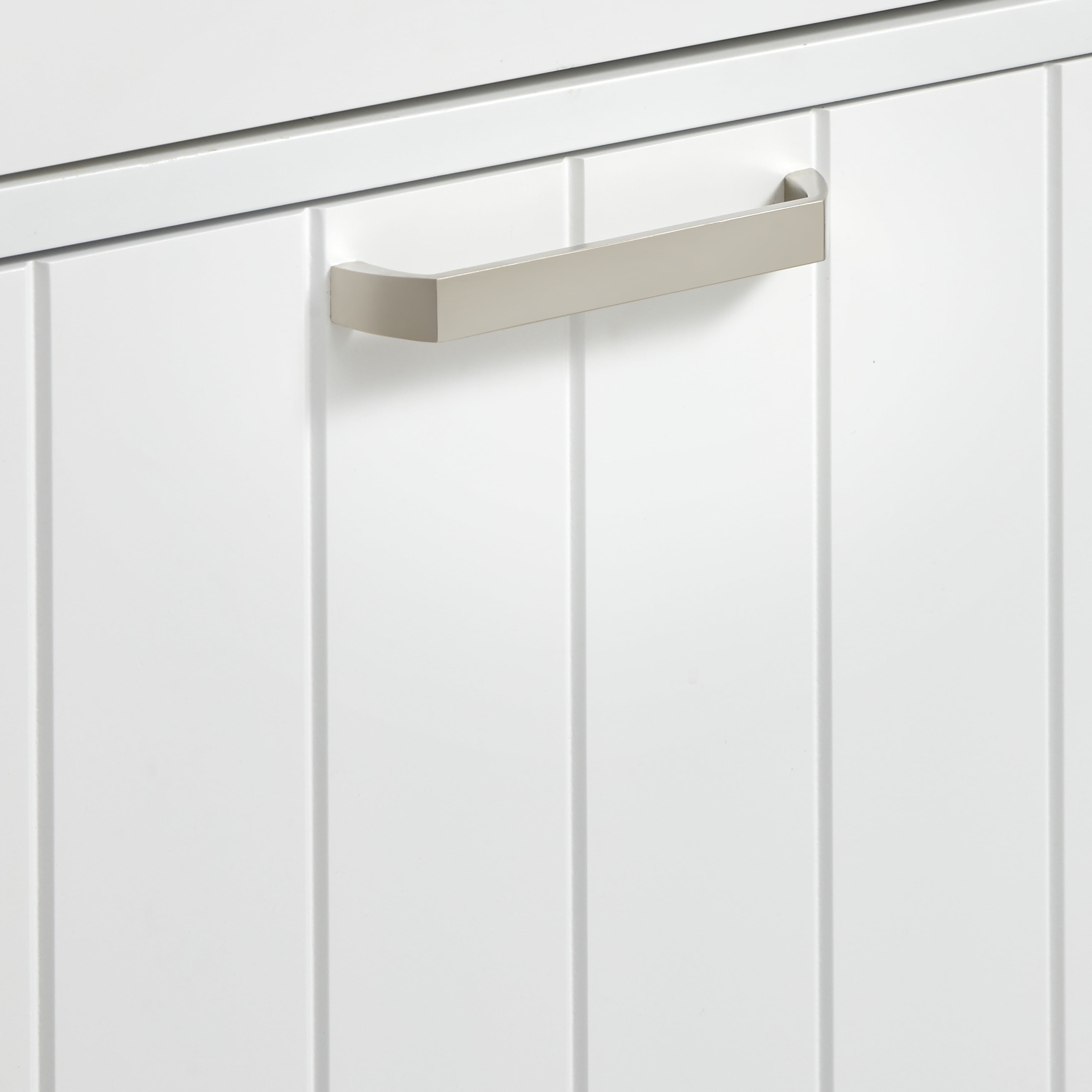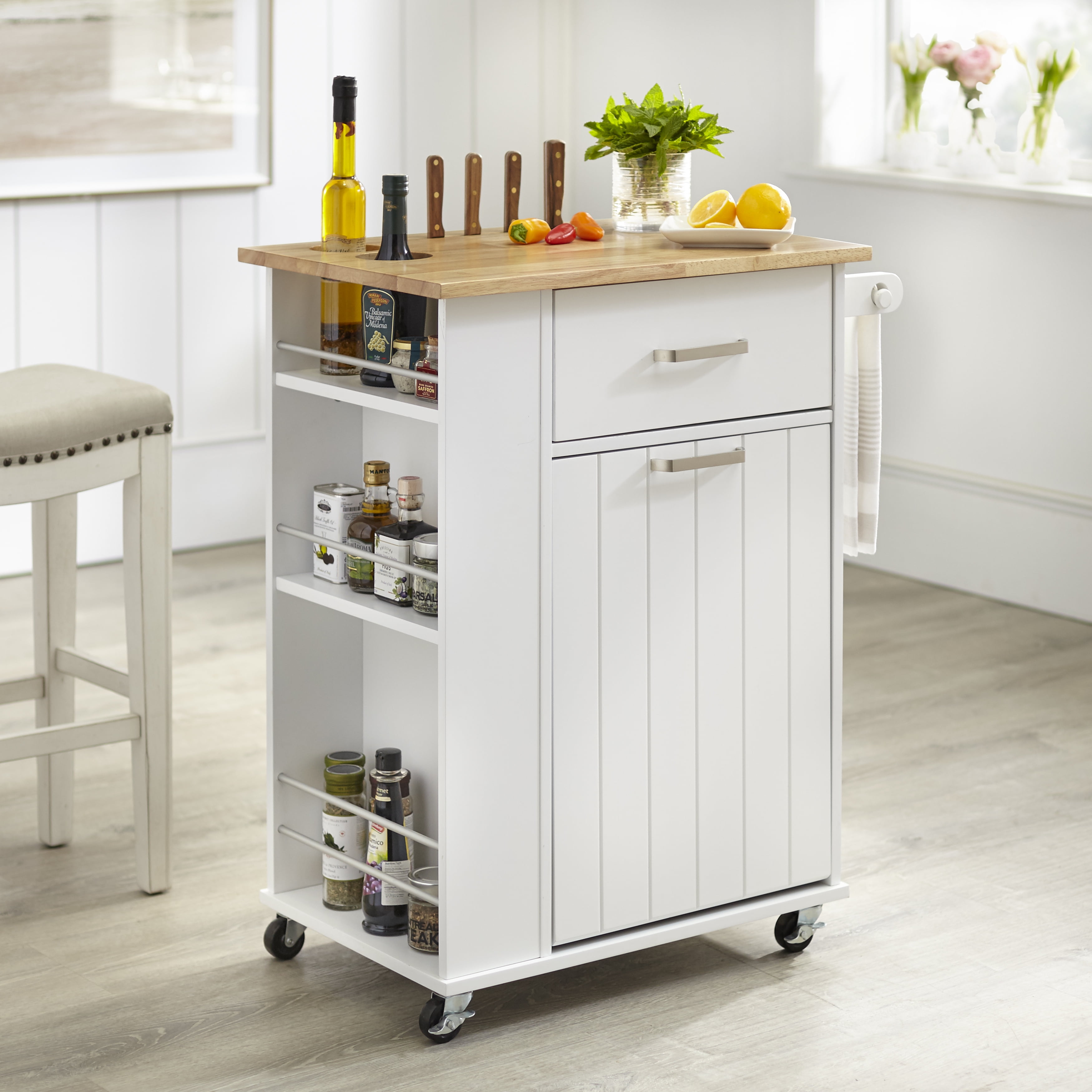 Includes one (1) kitchen cart One (1) drawer Three (3) tiered spice rack and towel bar Rolling castors (two are locking) Beadboard front on trash bin pull-out door Champagne finished pulls Crafted of MDF with solid Rubberwood top Blush Pink, White, Hunter Green or Gray finishes available Ships in one (1) carton Kitchen Cart overall dimensions: 34.4 “H x 28.7 “L x 17.7 “W Table top dimensions: 18 mm thick x 25 “L x 17.75 “W Trash bin dimensions: 15″H x 14.5 “W x 10.25″D (7 gallon) Inside drawer dimensions: 4 “H x 14.5 “L x 10.6 “W Spice rack top shelf dimensions: 5.25 “H x 14.4 “L x 4.9 “W Spice rack middle shelf dimensions: 9.25 “H x 14.4 “L x 4.9 “W Spice rack bottom shelf dimensions: 14.9 “H x 14.4 “L x 4.9 “W Product Weight: 65 lbs.