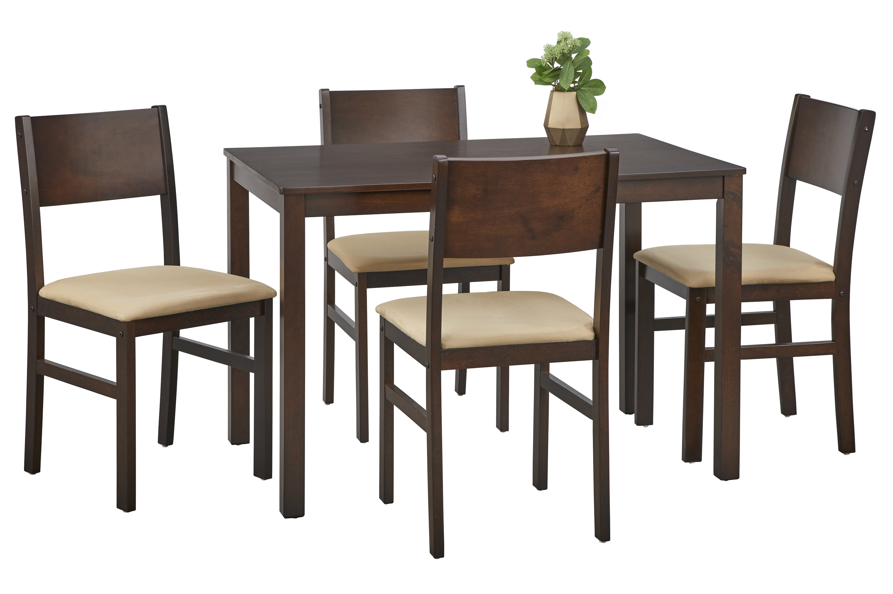 Set includes 1 dining table and 4 dining chairs Materials: Rubberwood, Microfiber, Foam Table dimensions: 43.3″W x 27.5″D x 29.2″H Chair dimensions: 17.32″W x 16.5″D x 33.25″H Requires some assembly For Indoor use only