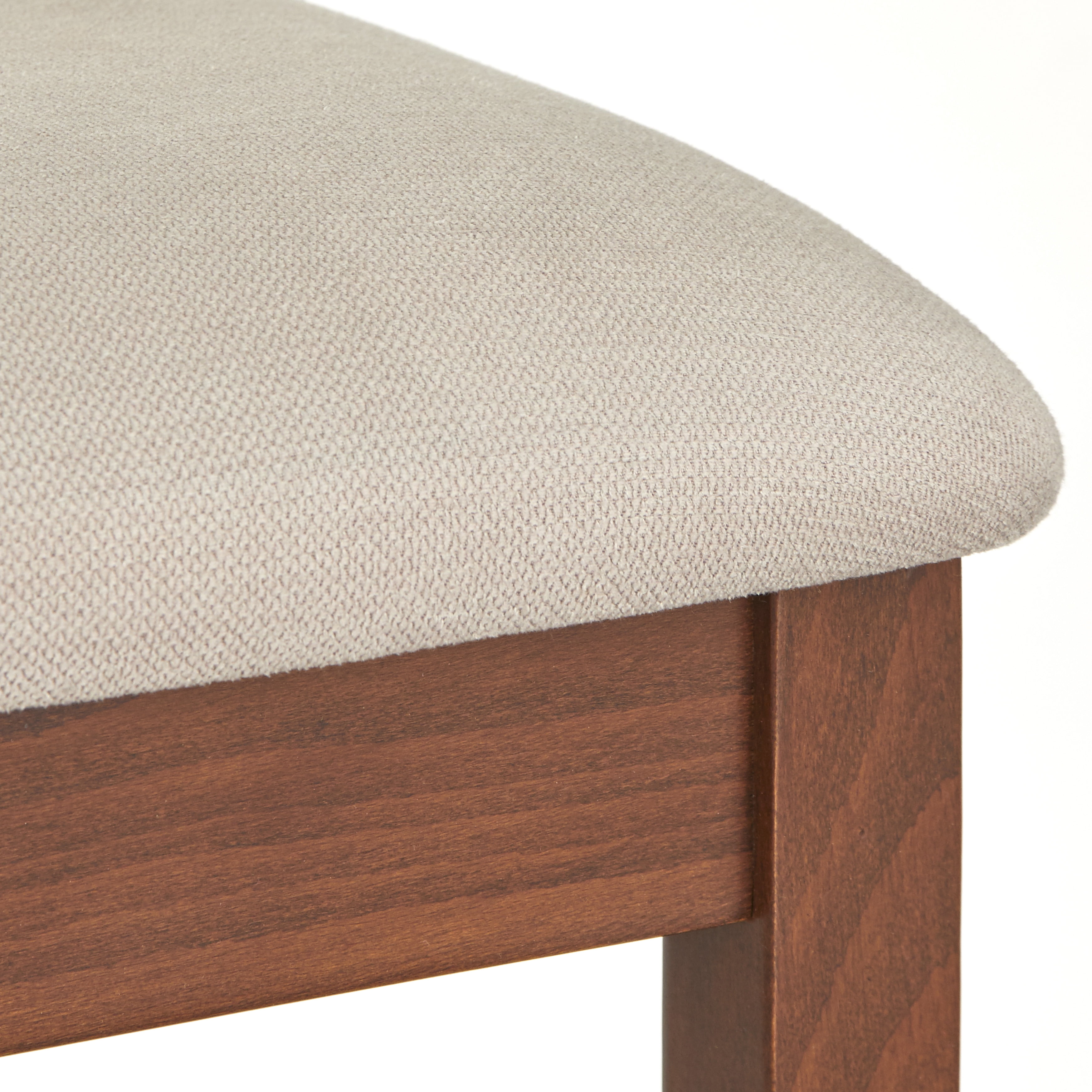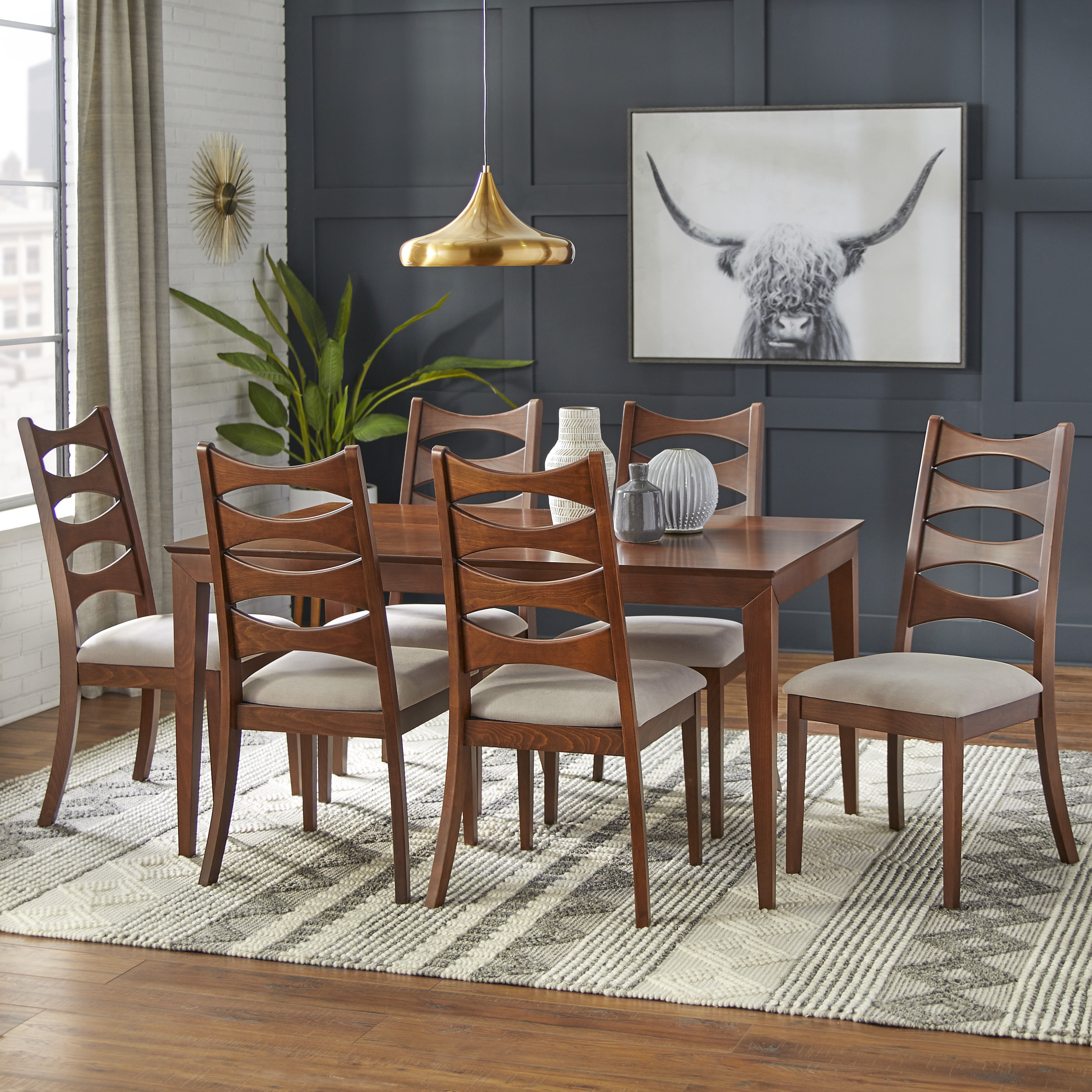 Lydon Dining Chair Includes: two (2) high back dining chairs Mid-Century modern inspired dining chairs Chairs feature a unique cut-out back design Comfortable cushioned upholstered seats Chairs crafted of solid Beech wood, fabric, and foam Upholstered in a soft Light Gray Linen-look fabric Rich walnut finish Ships in one (1) carton, assembly required Chair overall dimensions: 40.8 inches high x 19.1 inches wide x 23.6 inches deep Seat dimensions: 19.5 inches high x 19.1 inches wide x 18 inches deep