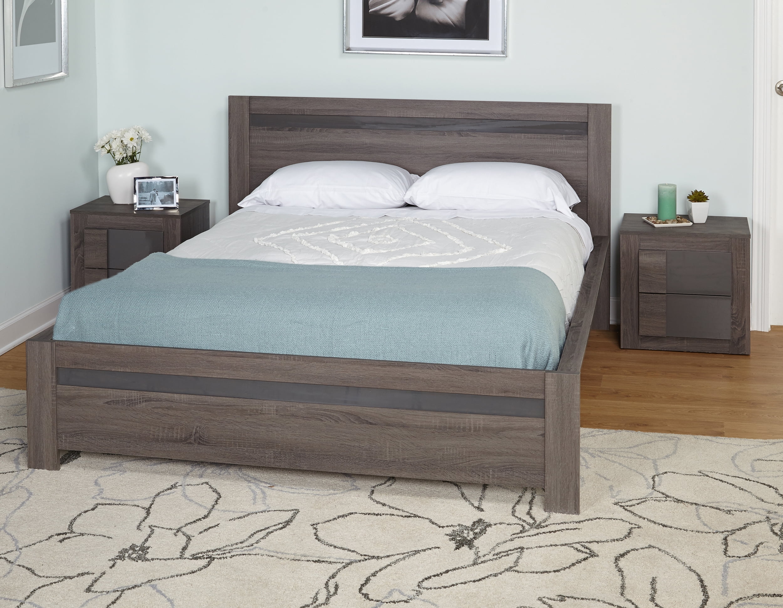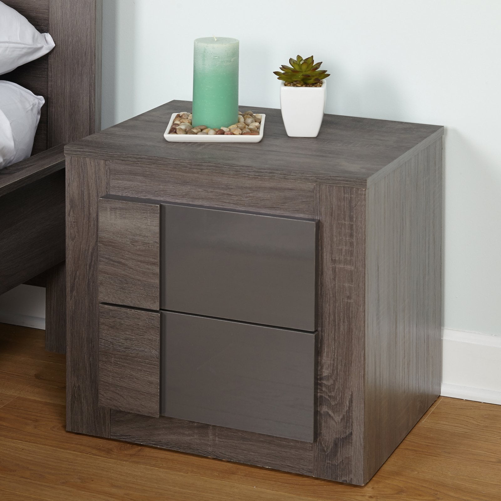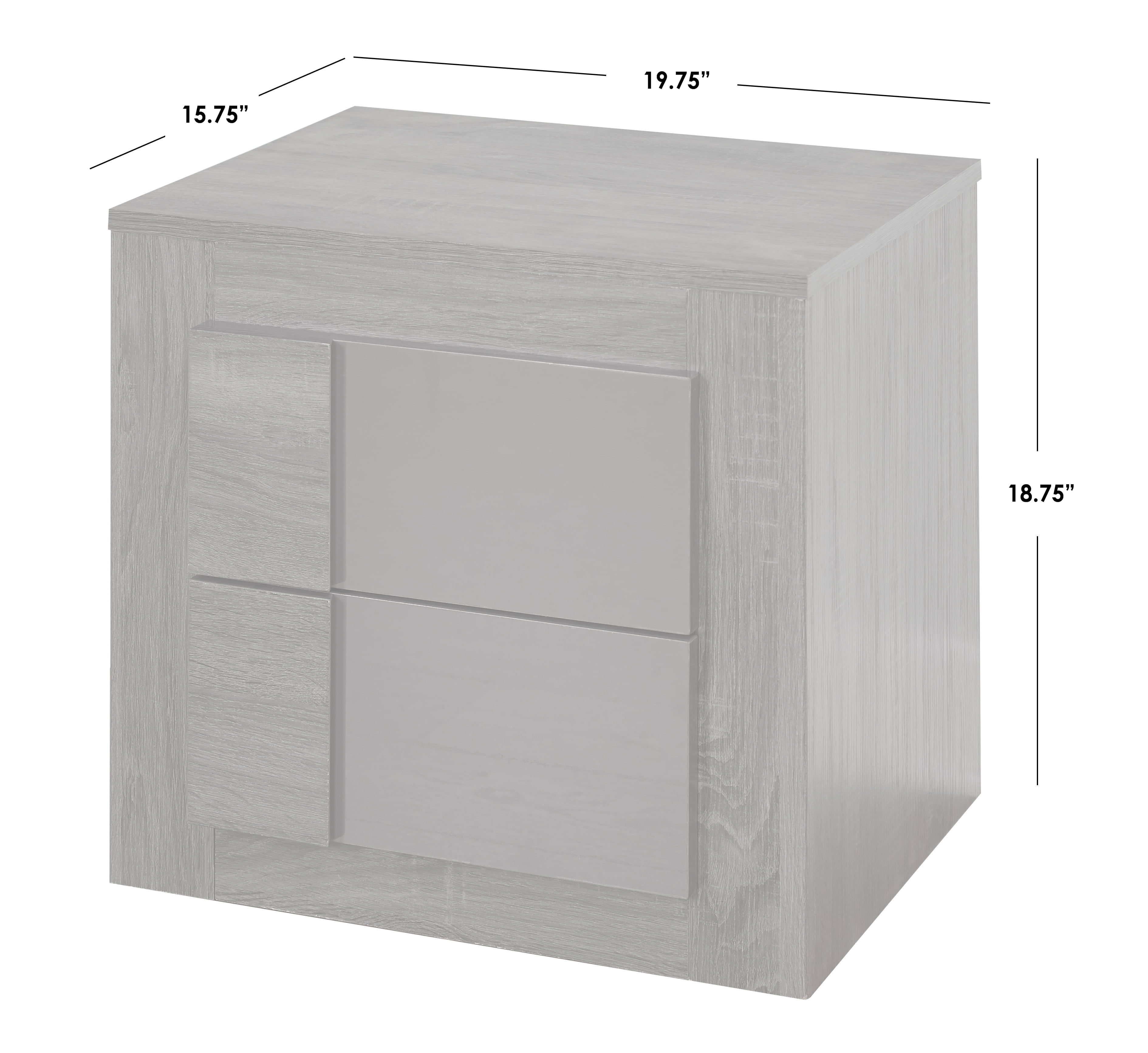 The Maya 2 Drawer Nightstand features a design that blends well into bedrooms of any style. Each drawer features a high-gloss gray finish for interest and depth against an otherwise oak finish. The sturdy wood composite and laminate frame with contrasting two drawers provide elegance and style to any room. Two spacious drawers provide ample space for storage. Personalize this nightstand with your favorite phots, lamps or any other accessories. Perfect for any space and blends in well with any decor. Assembly needed