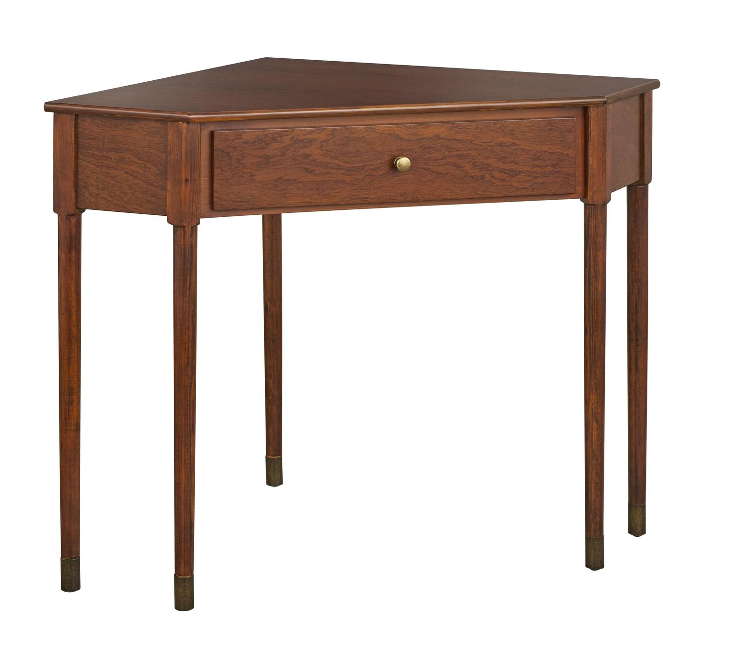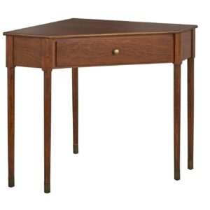Refresh your room or nook with the space-saving Mesa Corner Desk from TMS . Ideal for any home office area, the Mid-century inspired corner design assists in maximizing unused space. Featuring slender stylish sturdy legs that are accented with brass leg caps which complement the tone of the warm walnut finish. The generously sized drawer fashioned with a brass knob, provides ample space for holding all your office essentials. Constructed of durable MDF with solid pine legs, this desk is available in multiple finishes.
