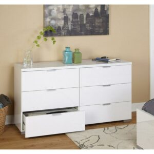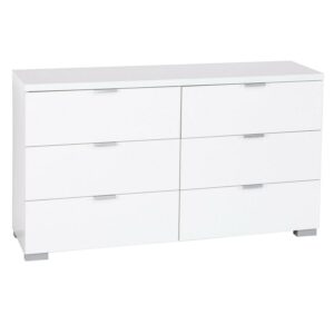 With six side-by-side drawers and a spacious top Zuri, Six Drawer Dresser offers ample storage and display space. Perfect to store in your clothes or accessories. This bedroom essential is fashionably crafted with engineered wood with clean lines and a laminated high gloss white finish. Its drawers operate on side-mounted metal glides and feature sleek metal pulls. The dresser stands on metal cap feet finished in contrast Grey to match. Blends well in with any bedroom decor and accessories