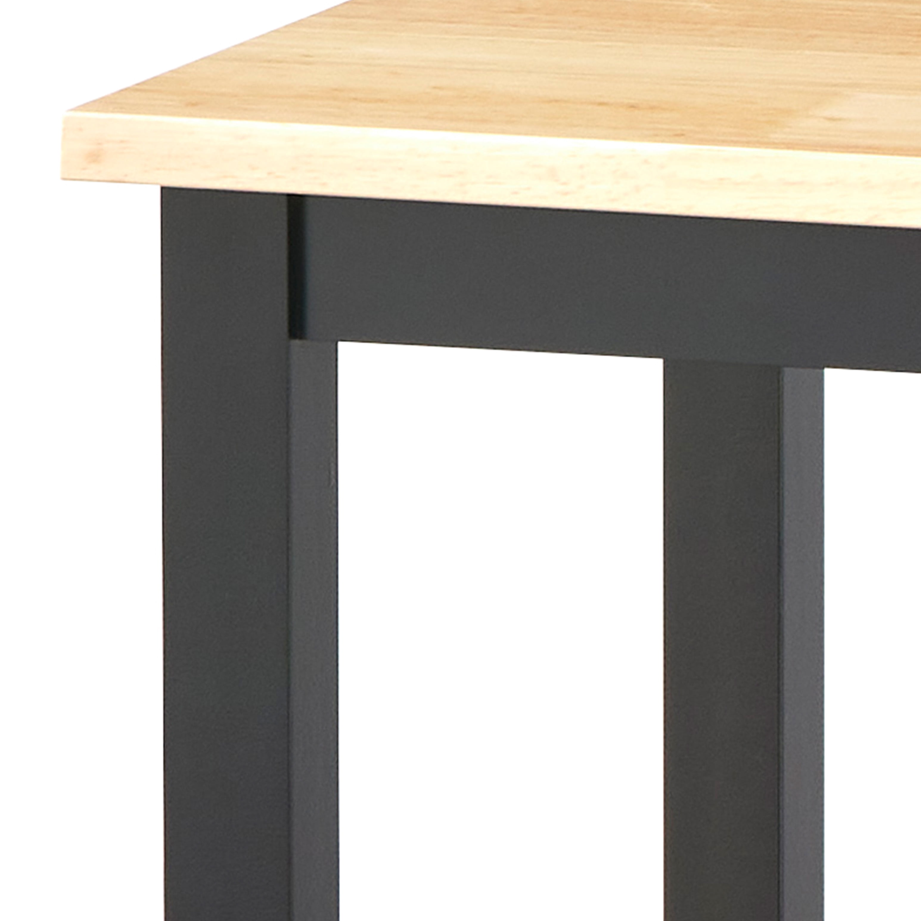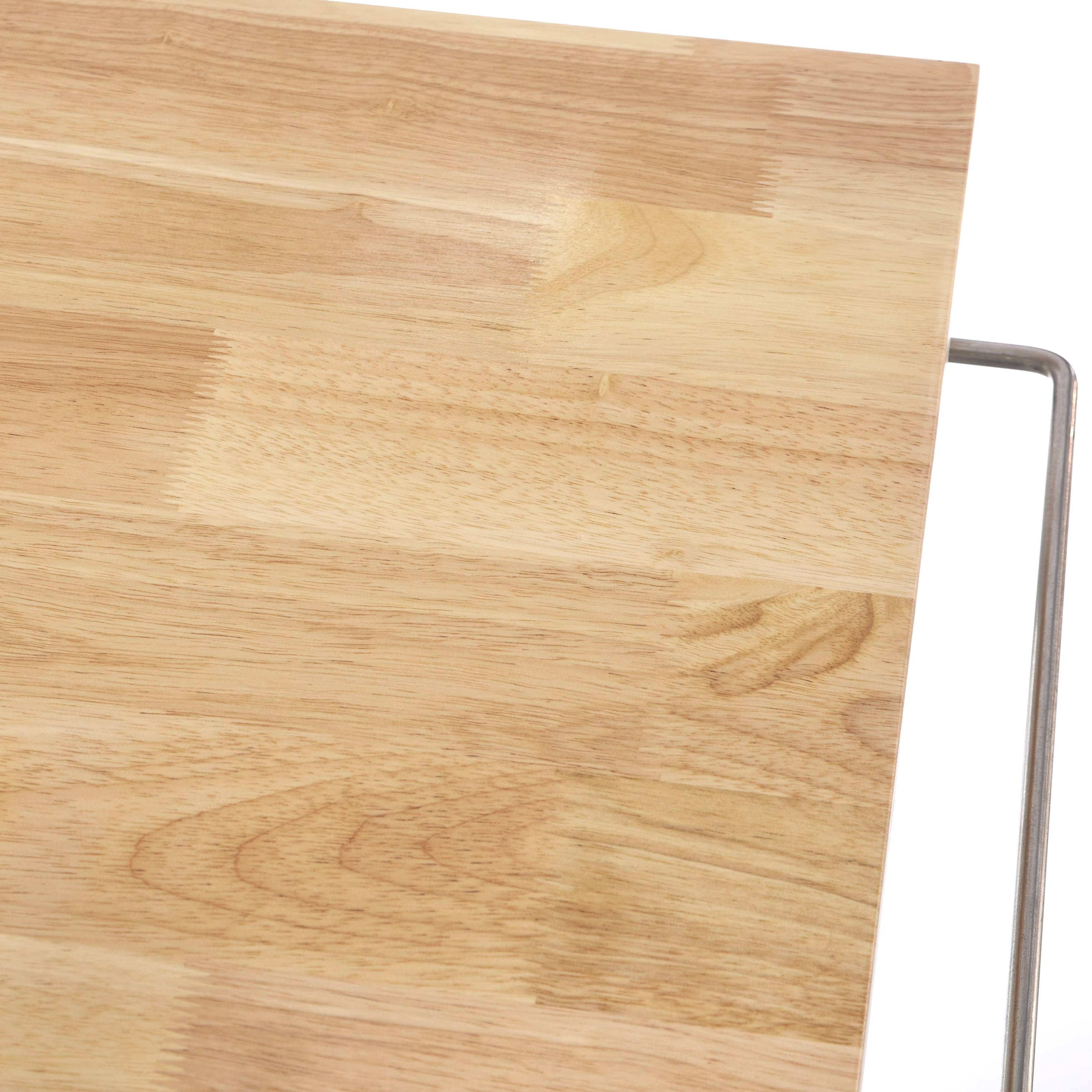 Includes: one (1) kitchen cart Natural finish solid wood top Two shelves for storage Removable locking casters to create a stationary cart Convenient stainless steel side towel bar Assembly required Constructed of MDF and with solid rubberwood top; floor clearance without casters: 4 inches Black finish Ships in one (1) carton Overall dimensions: 35 “H x 34 “L x 18.25 “W Dimension of tabletop: 32 “L x 18.25 “W; 18MM thick 12.5 inches between shelves Top weight capacity: 100 lbs Shelf weight capacity: 50 lbs Product Weight: 37 lbs.
