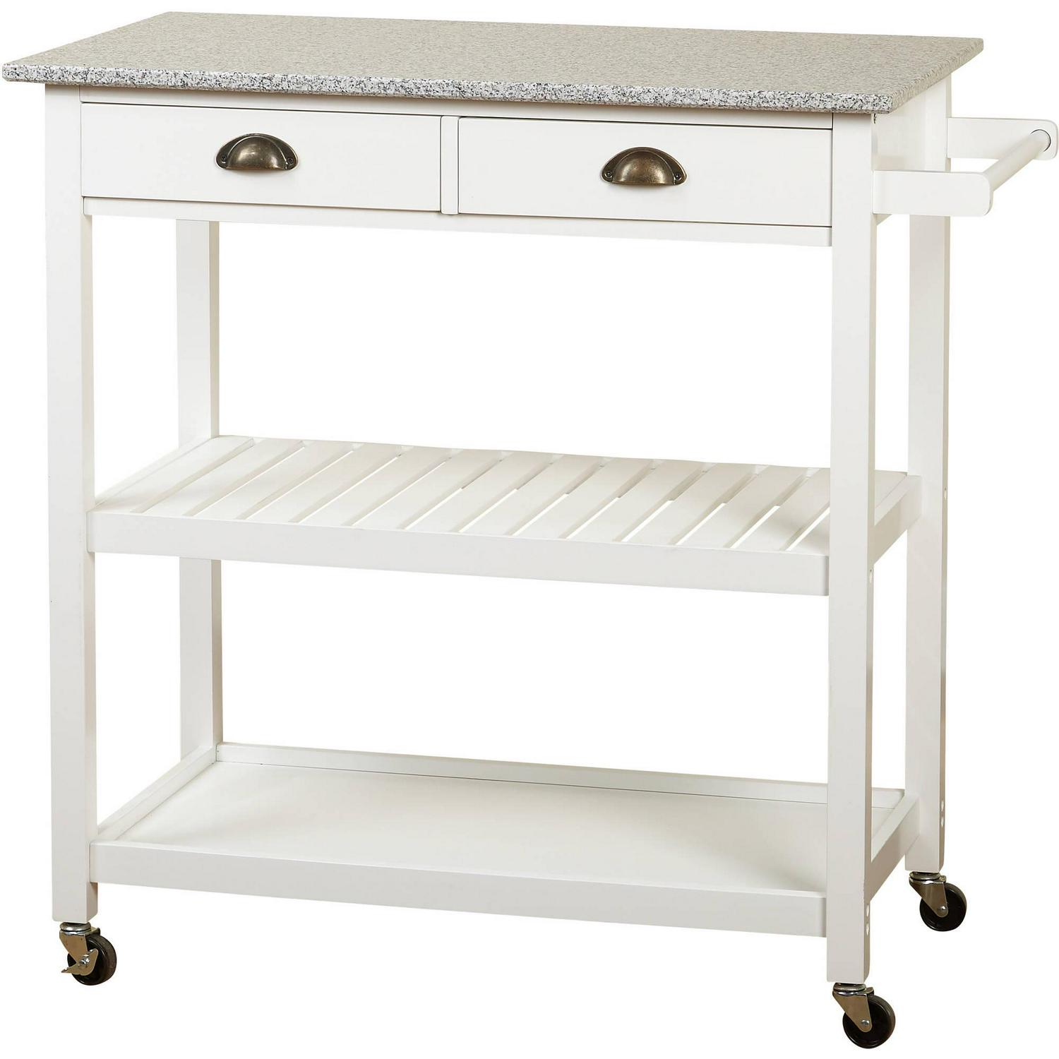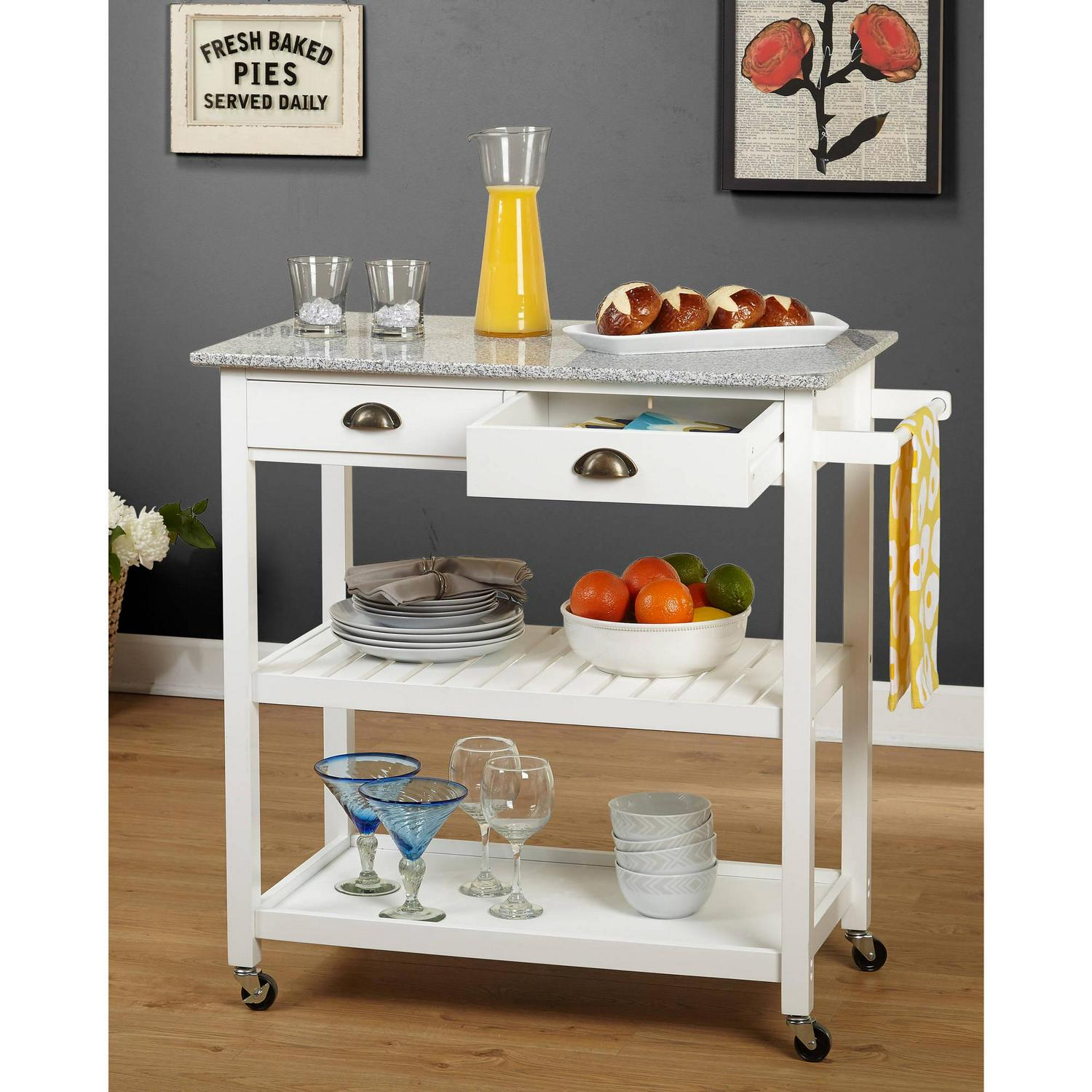 A gray and white marble top and retro cup pulls give the Oregon Portable Kitchen Island Cart its upscale farmhouse style. Practical features of this sturdy wood kitchen island cart include two drawers, one slatted and one solid shelf. A towel bar that doubles as a handle and casters mean you can use this island as a mobile bar cart, too. Choose from available finish options.