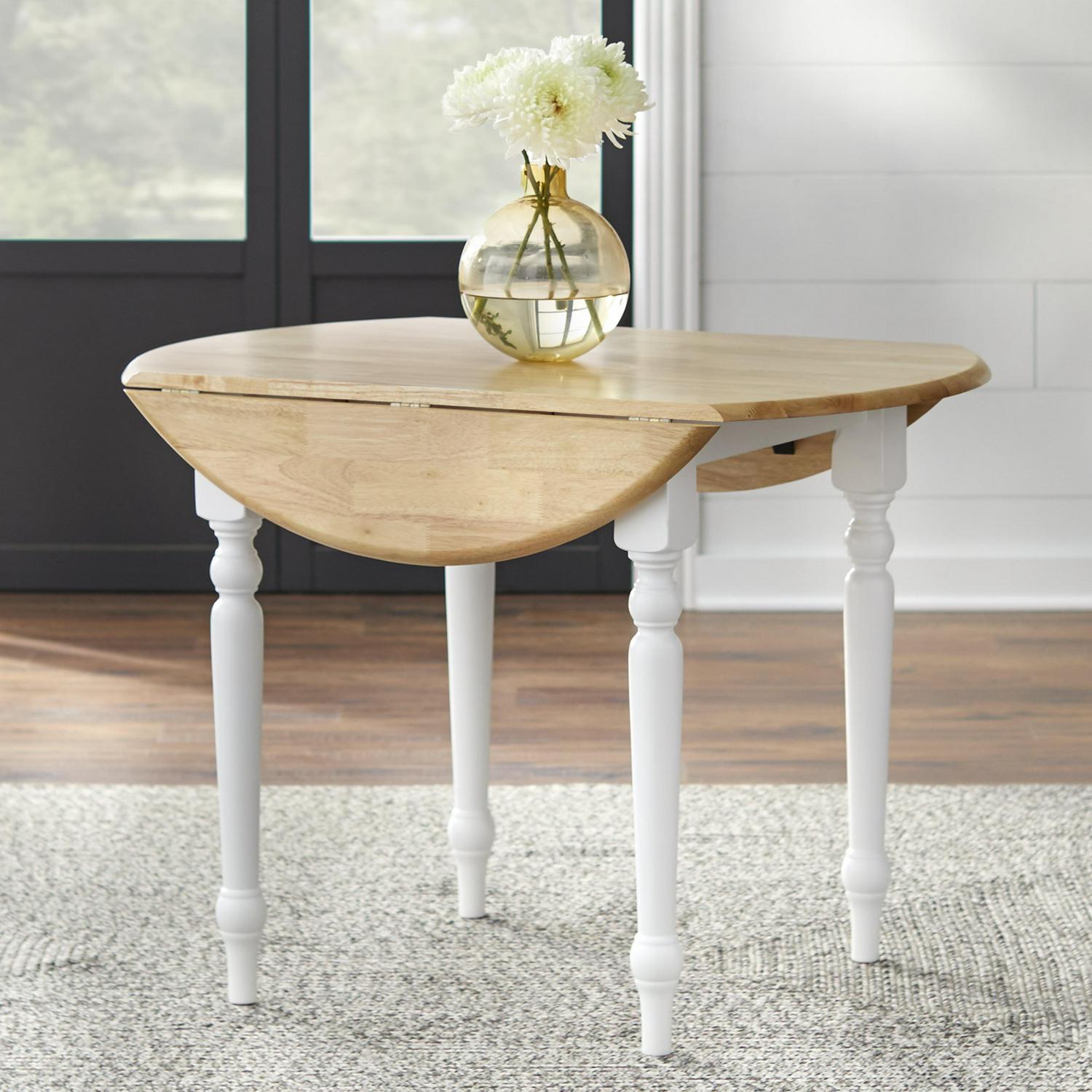 The Round Drop-Leaf Dining Table has charming turned legs and two standard 7″ drop leaves for maximum space efficiency and convenience. It is made of solid rubber wood for durability. The round drop-leaf table features a white/natural finish that will complement a variety of decor schemes.