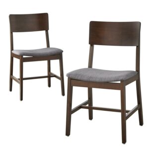 The Solid Wood Tiara Dining Chairs by TMS are the perfect set of chairs for updating your dining area. Inspired by Mid-Century style, these chairs (set of 2) are designed with clean lines and coordinate well with many styles of dining tables. Solid rubberwood gives the chairs their sturdy, high-quality construction. Contoured seats are upholstered in a soft Linen-look fabric with a warm walnut chair frame finish, offering a sleek addition to any kitchen or dining room area.