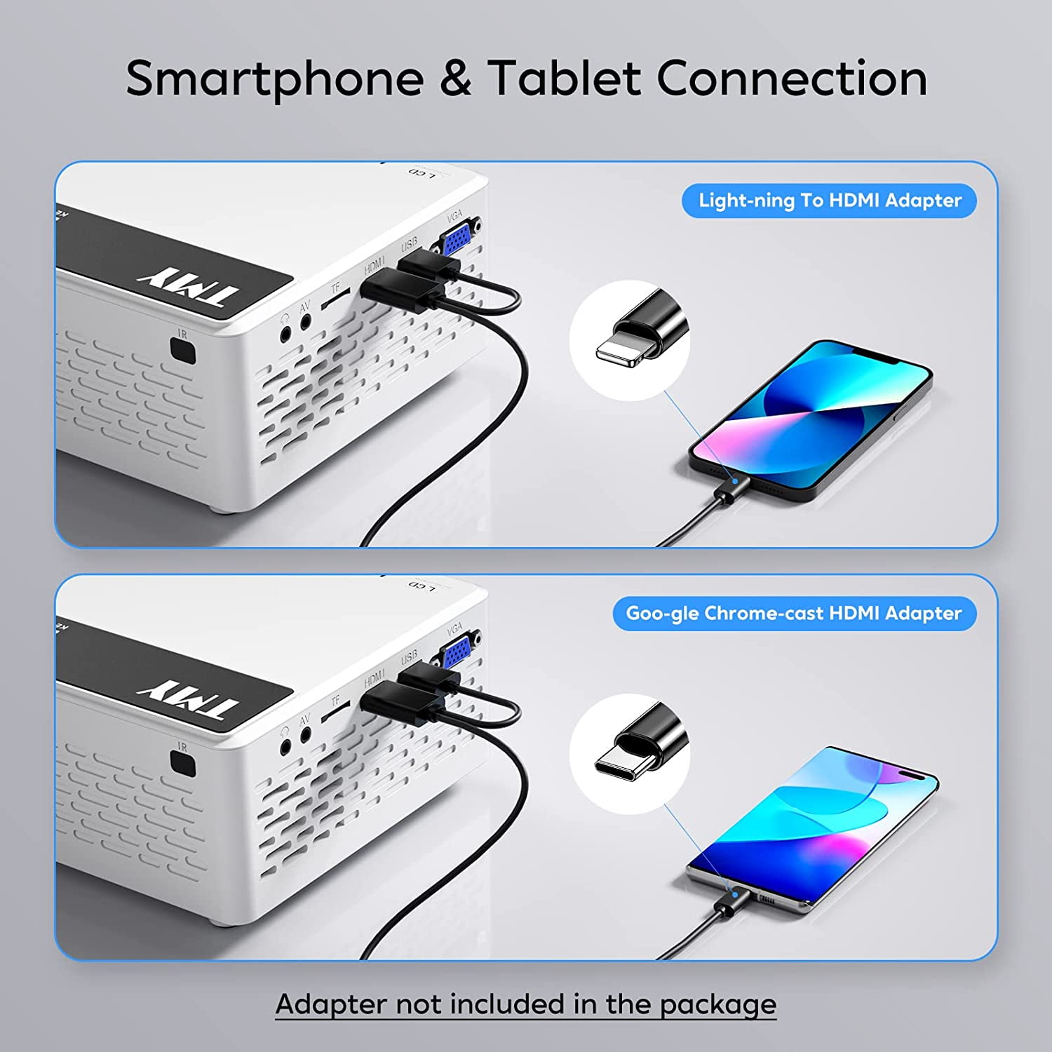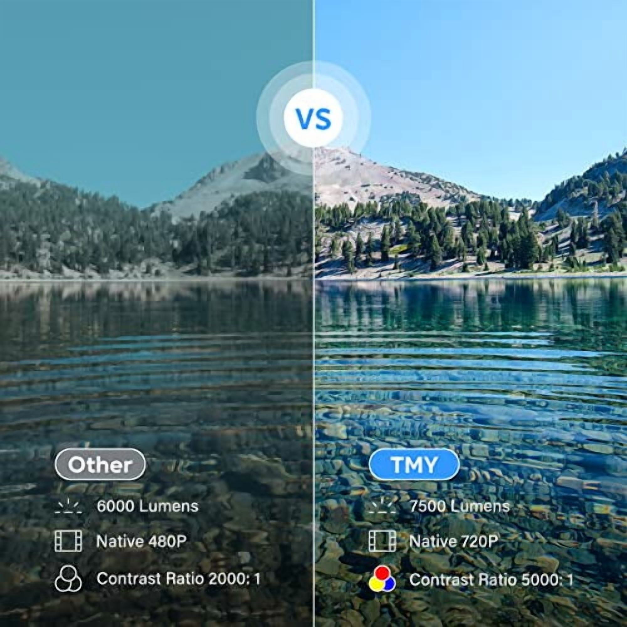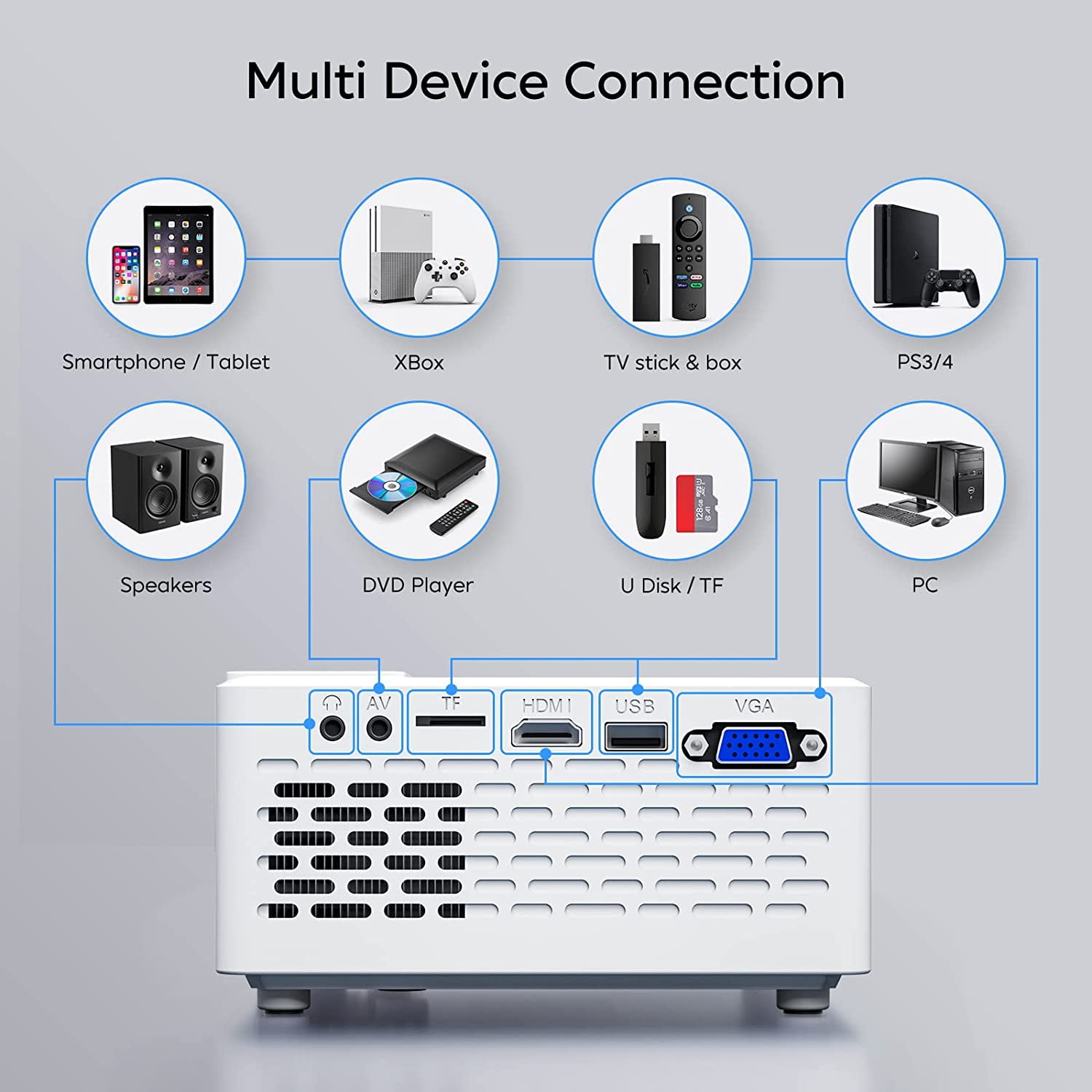 ???Upgraded 9500 Lumen HD Video Projector?To better meet your needs, we have upgraded the V08 home projector with our latest 9500 Lumen LED light source. The V08 smart projector features a native 720P resolution 1280×720 with 1080P Full HD support. The latest 3LCD color calibrating and adjusting technology works to reproduce more intricate color details than other mini projectors, which presents our customers a dynamic and color vibrant 1080P HD projected image quality. ???Bluetooth 5.1 Function & Upgraded Speaker?With built-in upgraded speaker, you can enjoy a cinematic audio-visual experience without connecting external speakers. Also, this portable projector built-in Bluetooth 5.1 technology to make the audio synchronization faster and more stable. With this Bluetooth projector, you can connect your ideal Bluetooth speakers or headphones wirelessly at any time to get more wonderful sound, and you can truly create your own home theater. ???Portable Projector Screen Included?The V08 mini projector includes a 100″ projection screen that is tailored to meet our customer’s needs. As opposed to other projectors, our included projector screen allows you to set up your own home theater anywhere to watch movies, TV shows, photos, slide shows, and play video games. This portable, foldable, anti-wrinkle and easy to wash 100″ projection screen is larger than others, which ensures wider viewing angles and enhanced picture detail. ???Portable Mobile Home Cinema?The V08 movie projector provides a minimal display area of 32 to a maximum 220 image with projection distances between 1.5-6m. Aspect Ratio: 4:3/16:9, Contrast Ratio: 5000:1, Lamp lifetime: 60,000 hours. It enables excellent playback of movies, TV shows, video games and can be set up conveniently. Our newly improved 2023 uniform illumination method provides the optimal visual experience, ensuring no dark areas are present along the edges of the displayed image. ???Extensive Connection Availability?With the built-in HDMI, VGA, AV, USB, 3.5mm headphone port & TF card slot, plus included AV & HDMI cables, this portable projector is the perfect solution for a wide variety of input sources including but not limited to TV Stick/Box, Game Consoles, PCs, Smartphones, Tablets, Laptops, DVD players, TF cards and USB flash drives. Our V08 phone projector with 100″ screen is easy to use and provides a great value.