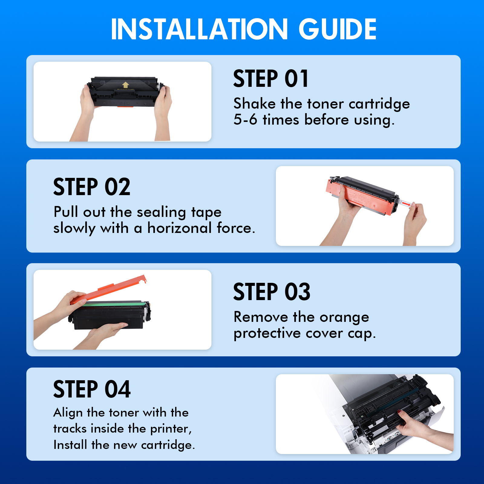 📢To all consumers: We have corrected and carefully inspected the shipped products together with the warehouse to ensure that customers receive the correct quantity and color. Please believe that the quality of our products is not a problem, and feel free to purchase with confidence! 🔔Printer compatibility: Brother HL-L8260CDW HL-L8360CDW HL-L8360CDWT Brother MFC-L8610CDW MFC-L8900CDW 🔔Page yield(based upon a 5% coverage of A4 paper): 3,000 pages per black cartridge 1,800 pages per color cartridge 🔔Package contents (Total 5 pack): 2 x TN431BK black toners, 1x TN431C cyan toner, 1x TN431M magenta toner, 1x TN431Y yellow toner 🔔Our products are certified with ISO 9001 and ISO 14001. 🔔Installation Guide Step 1: Gently shake the toner cartridge from side to side to distribute the toner. Step 2: Entirely pull out the sealing tape from the toner cartridge. Step 3: Remove the protective cover from the cartridge. Step 4: Install the toner cartridge in accordance with the correct slot into the printer.