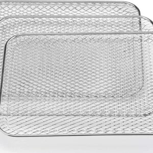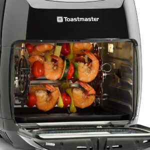 The Toastmaster 11. 6 quart air fryer is a healthier way to fry without using oil. The rapid air technology circulates the heat to lightly cook fries, meats, vegetables, and other snacks. The air fryer features an integrated safety mechanism to automatically switch off when the door is opened. Adjustable temperature controls allow a variety of foods to be prepared in a fraction of the time. The air fryer includes 8 preset cooking temperature/time options, so preparing meals is no longer a guessing game. Use the included accessories to air fry or dehydrate foods on the 3 crisping racks, roast a whole chicken on the rotisserie spit, or make shrimp kabobs with the metal skewers. Then, without the use of oil, clean-up is much simpler than cleaning a traditional fryer, simply remove the drip tray and wipe the unit clean.