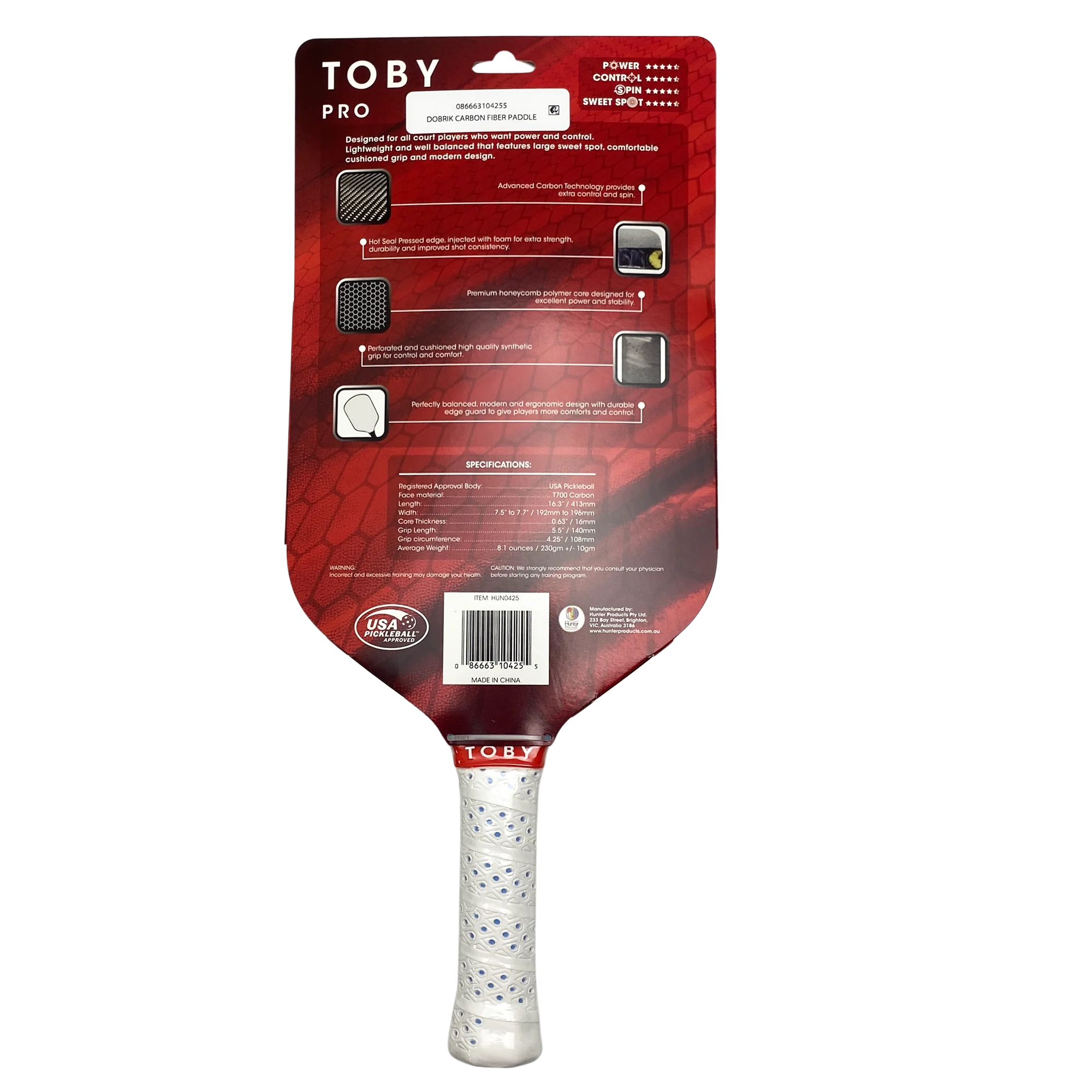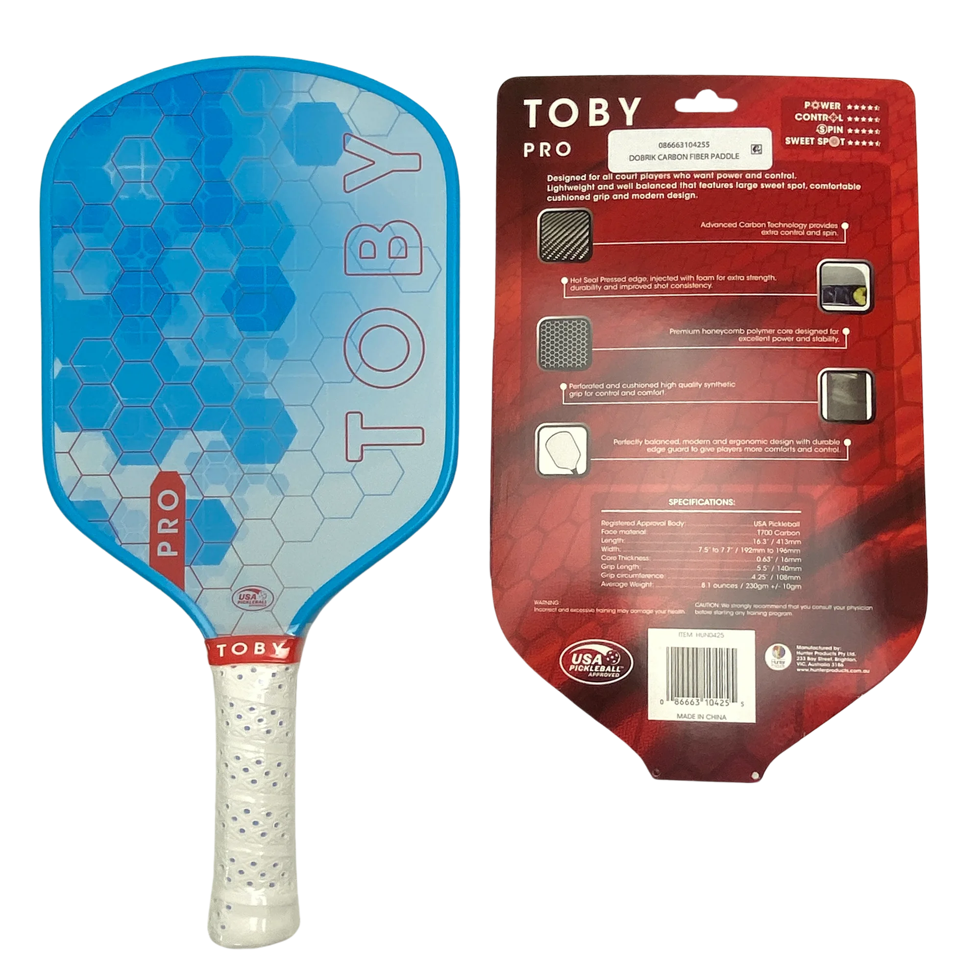 Elevate your game with the Toby Pro Pickleball Paddle, crafted for players of all levels. Featuring an advanced carbon technology face and a premium honeycomb polymer core, this paddle delivers unmatched power and control. Measuring 16.5″ in length and .63″ in thickness, it ensures optimal performance. Weighing just 8.1 oz, it’s lightweight yet durable. The perforated cushioned synthetic grip and hot seal pressed edge with injected foam provide extra strength and comfort. Approved by USA Pickleball, the Toby Pro Paddle comes in a striking sky blue color, combining style and functionality for the perfect game.