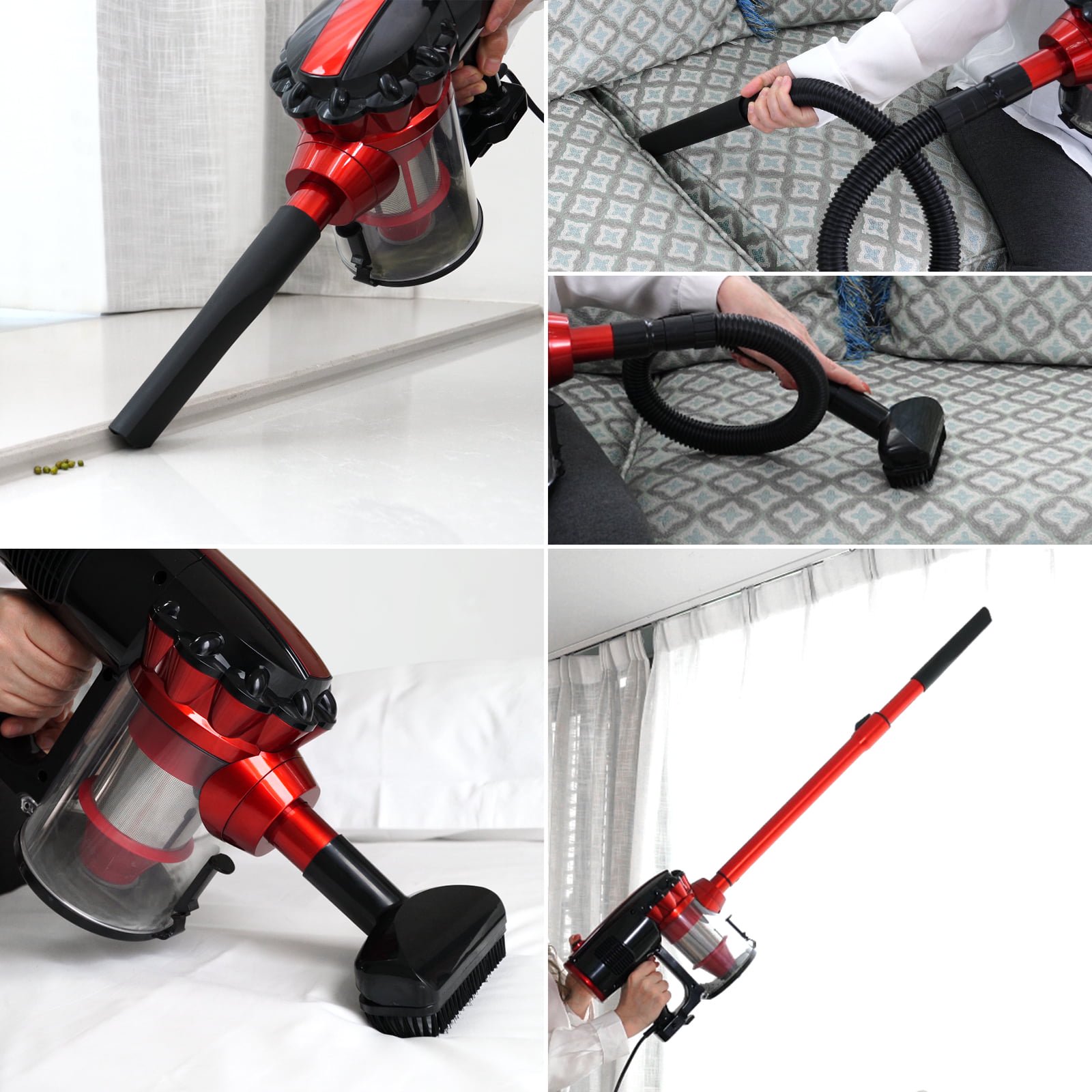 Tocwon hardwood floor vacuum can easily convert from a stick vacuum to a handheld vacuum with multi attachments. Lightweight with a weight of only 4.11 pounds, the compact vacuum cleaner can be operated with one hand to clean from the floor and high places easily. The corded stick vacuum provides continuous and stable power that doesn’t fade. Always ready to go. Perfect stick vacuum cleaner for marble, tile, and hardwood floor, pick up all debris, such as cat litter, dog food crumbs, and pet hair. With 18-30 inches adjustable length and a power cord of 23 feet long, the hard floor vacuum gets a wider range of use. The flexible joint could free to clean the dirt under the furniture and bed and clean up dead corners. The brush head is easy to be controlled, feel free to control its direction where you want. 2 modes selective – A red button is designed for different cleaning requirements: button upward, good for normal floor cleaning tasks; button downward, the hard brush and soft rubber will drop down, perfect for deeper cleaning. With multipurpose attachments, this corded stick vacuum can be easily converted to a portable handheld vacuum to cover your various cleaning needs.