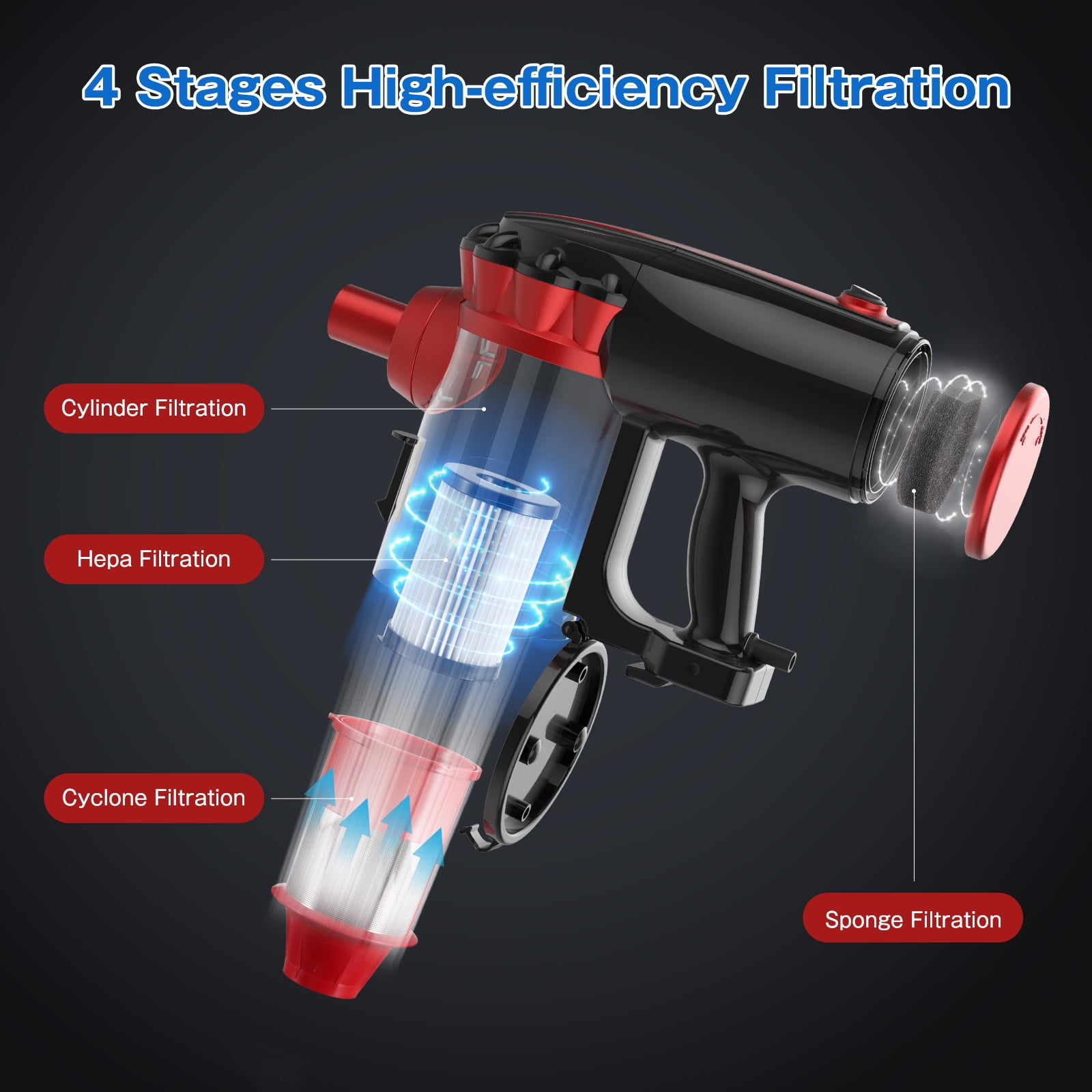 Strong suction of 17000pa on max mode. 4 stages fully-sealed filtration system. 0.8 liters dust bin and one click empty release the dirt. Easily converted to a portable handheld vacuum. Equipped with a wall mount to store.