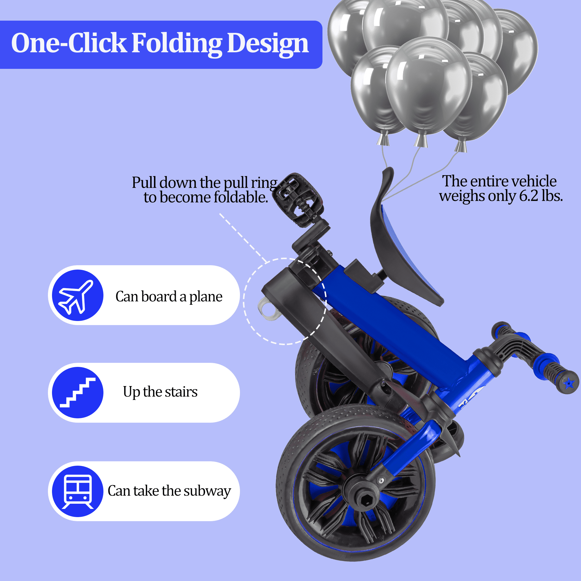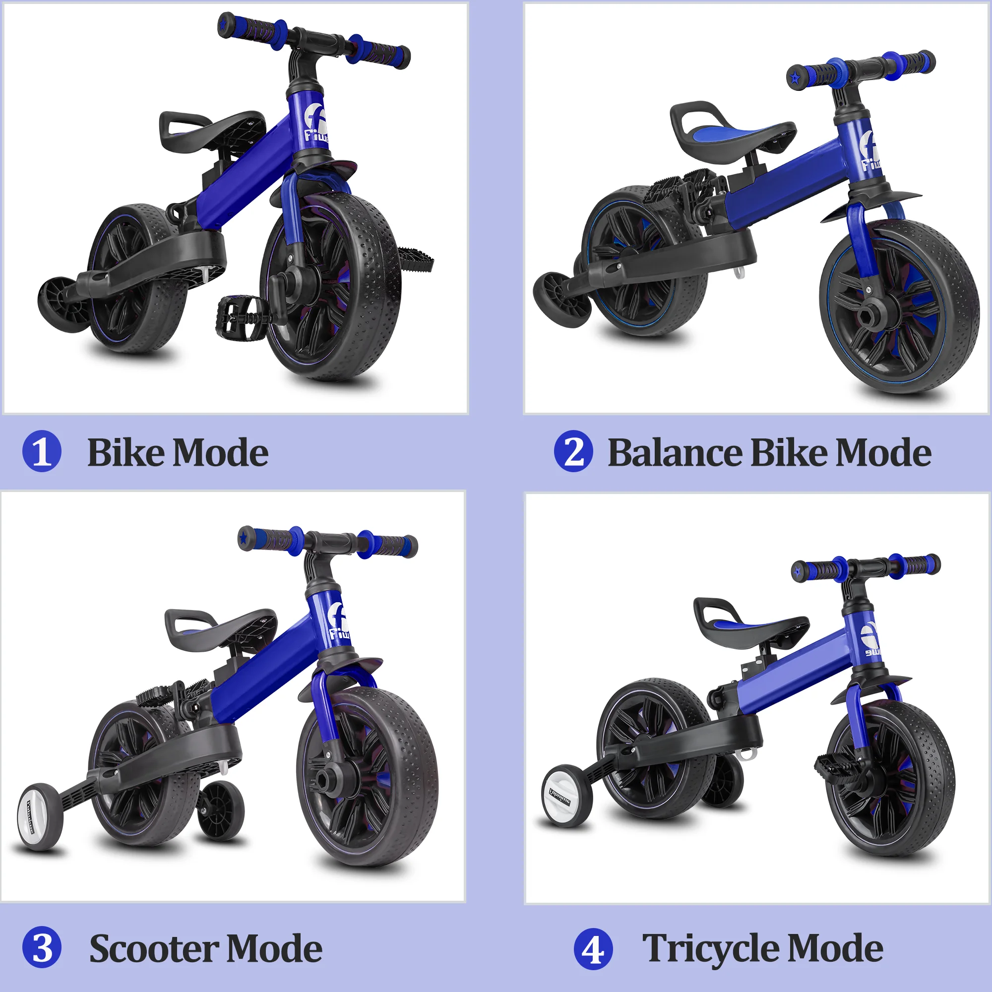 Our Arcwares tricycle can accompany your child for several years. This unique design offers 5 distinct riding experiences. Our pedal mechanism allows riders to rest their feet on the pedals and enjoy the ride, while adults steer and push. The adjustable push handle then removes older children who are ready to ride on their own. The trike is equipped with durable, molded wheels, an adjustable seat for your child, and a sturdy steel frame. Biking can improve children’s muscle strength, balance, coordination, and self-confidence. Feature: 1. 5 Riding modes: scooter, ride-on, tricycle, and balancing bike, push mode. 2. Tool-free transformation between modes. 3. Folding design for easy portability and storage. 4. 270° steering limited to avoid baby side falling. 5. Soft and non-slip handles are more suitable for babies to grasp. 6. The ergonomically designed seat with a PU surface provides maximum comfort and support. 7. A high-quality carbon steel structure can withstand up to 198 lbs. 8. Detachable pedals and training wheels for various needs. 9. Adjustable seats suitable for children between the ages of 2 and 6. 10. Equip with non-slip EVA wheels for various surfaces. 11. Low center of gravity triangle design is safe for babies when riding, stable, and not prone to rollover. Specifications: Product Name : 5 in 1 Balance Tricycle. Net Weight : 2.8kg Age Range : 2-6 years old Frame Material: high carbon steel Maximum Load: 198 lbs Wheel Width: 7cm Body Design: Non-inflatable, explosion-resistant wheels. Package Includes: 1 x Kids Tricycle 2 x Instruction