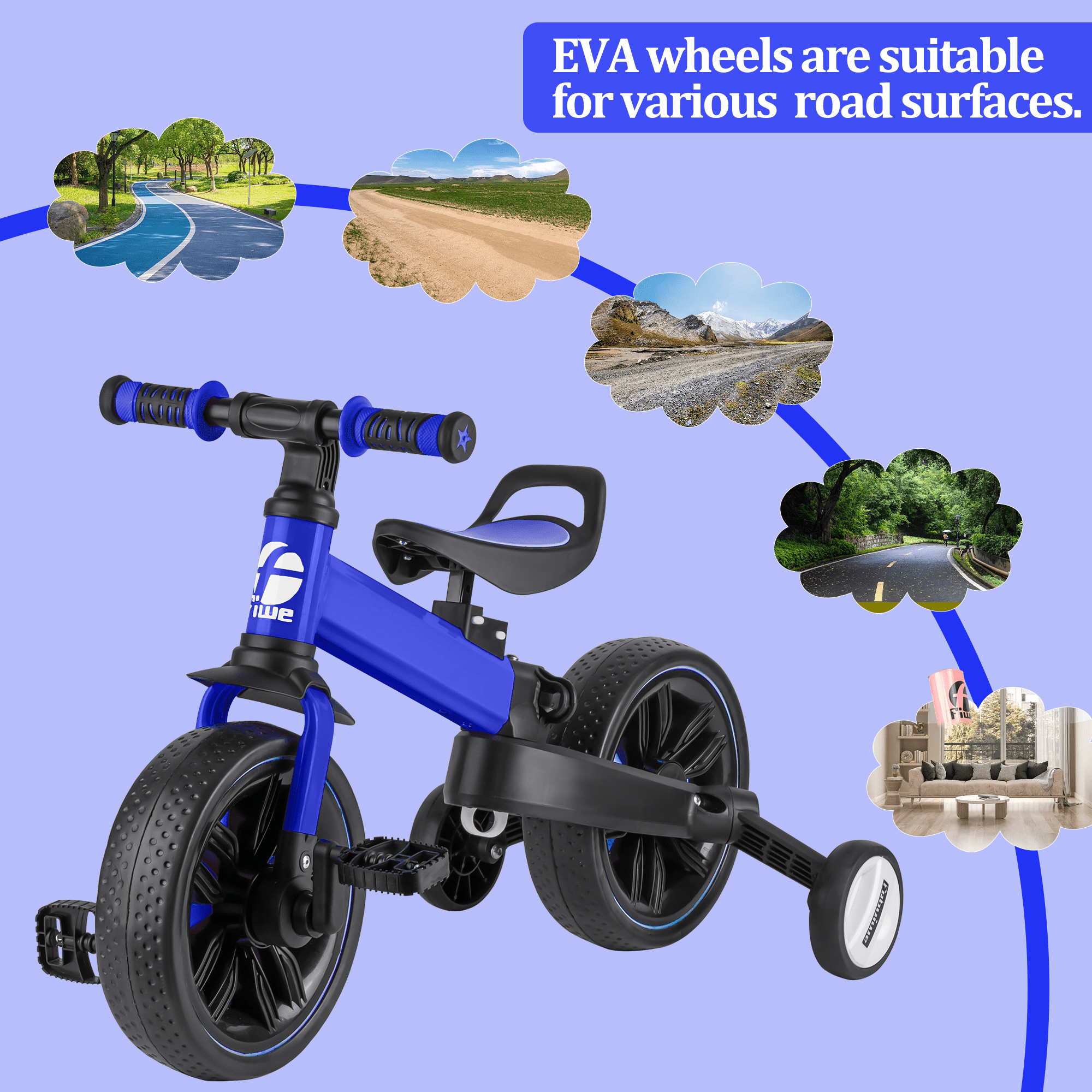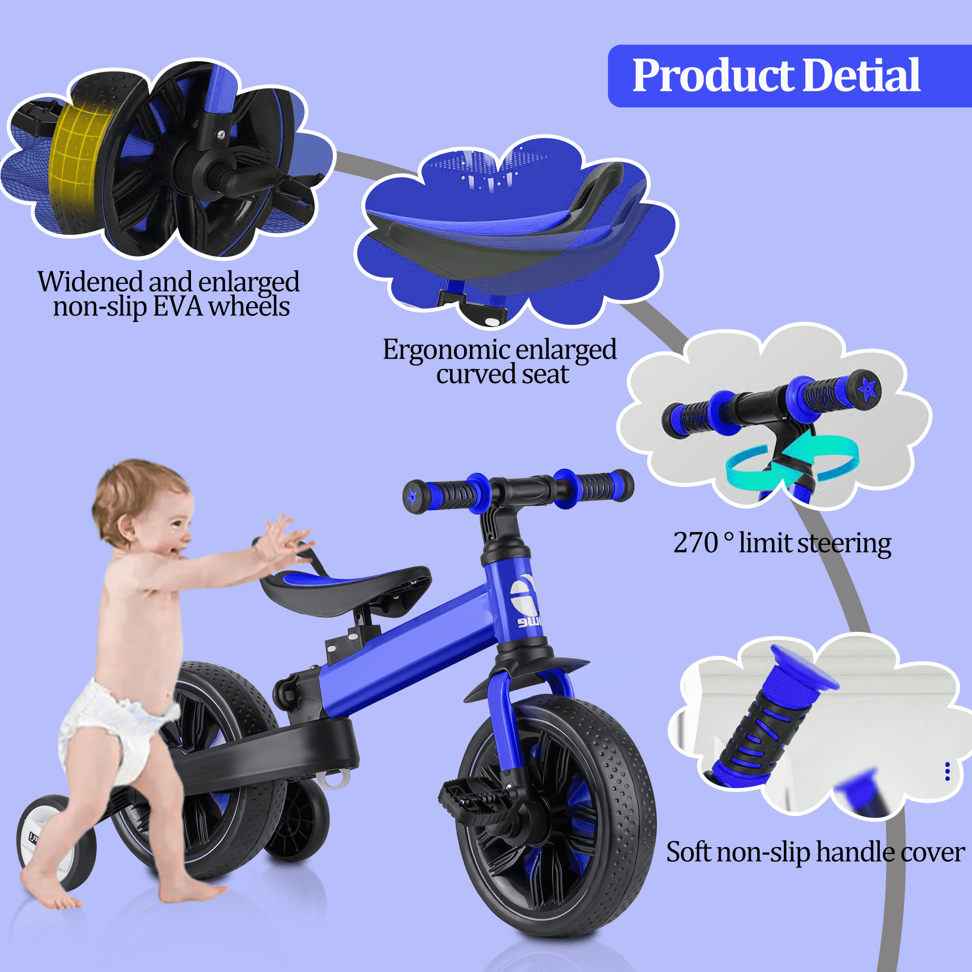 【5 in 1 Trikes】A tricycle that will accompany your child grow. This trike for kids offers various modes of learning, play, and exercise, including parent-push mode, traditional cycling mode, Tricycle mode, 2 Balance bike modes. 【High-Quality Product】Carbon steel, EVA solid shock-absorbing wheels, environmentally friendly and soft PP seats, will make the ride more comfortable and prevent fatigue, rubber handles maintain a long-lasting life, durable and stylish. Excellent products to make your children ride safer! 【120° Rotating Handle 】 Rotating 120 degrees to control the direction of the tricycle. Keeping your child safe from falling down or getting hurt. The anti-skid handrail and limited-speed steering can be used for wider scenes. 【Easy to Assemble】:It only takes 10 minutes to install , and all collections are push-button and snap-on , very easy to install. Kids will grow up happily with it. 【Perfect Gift Choice】Wonderful toy gift for boys and girls 2-4 years old at birthdays, Children’s Day, or Christmas. Raising happy and healthy childhood for your little ones.