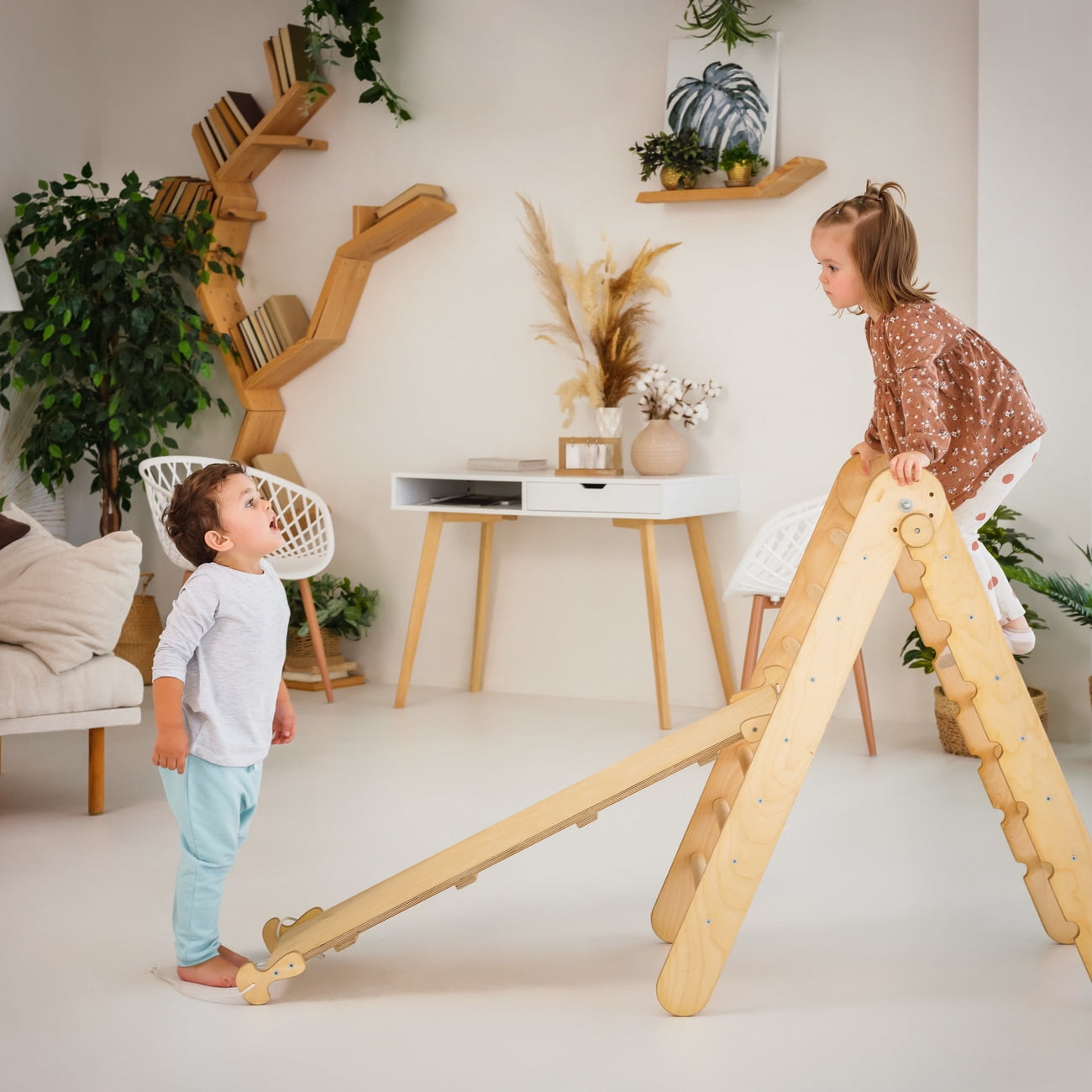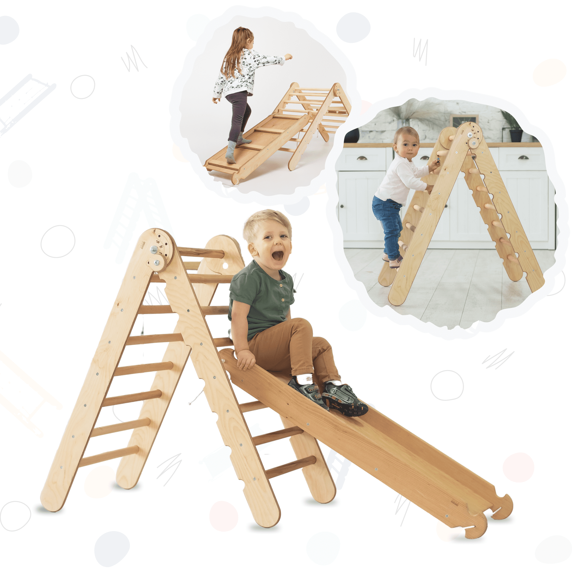 Are you in search of Montessori learning toys for toddlers and kids? Toddler Indoor Play Equipment 2in1 is one of the best options if you’re looking for a compact kids outdoor play equipment, as it consists of the classic triangle step ladder accompanied by the two-sided slide board/ramp. The triangle foldable ladder has 5 locking positions, which allow the toddler climber to be adjusted from 45° to 150°, which simply adds utility value both in use and storage. With the help of 4 additional wood planks, the toddler slide transforms into a ramp when flipped, opening up even more opportunities for your children to have fun and enjoy themselves! Montessori wooden toys are designed to develop and enhance a plethora of essential qualities and skills, such as gross motor skills, hand-eye coordination, courage, independence, dexterity, and many more!