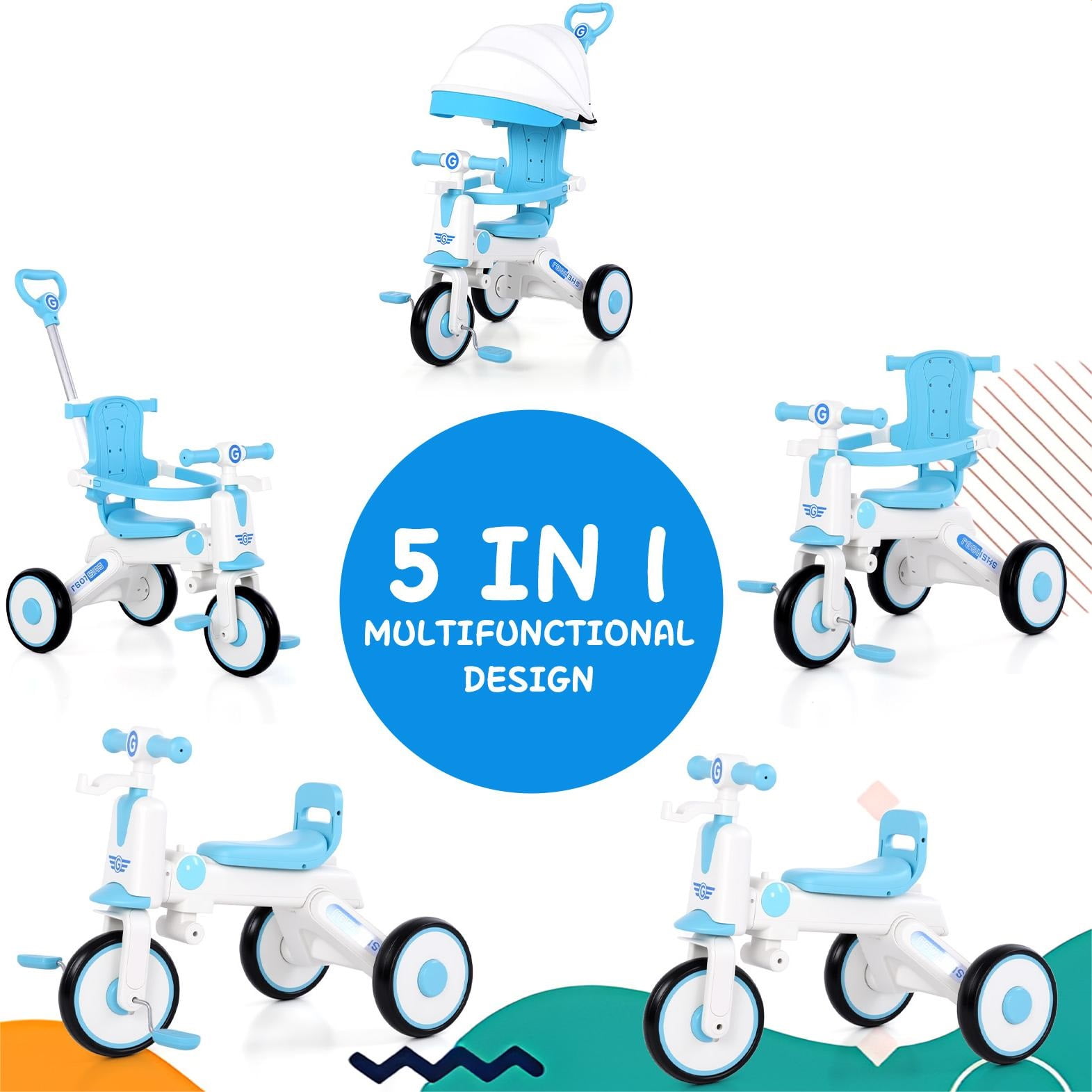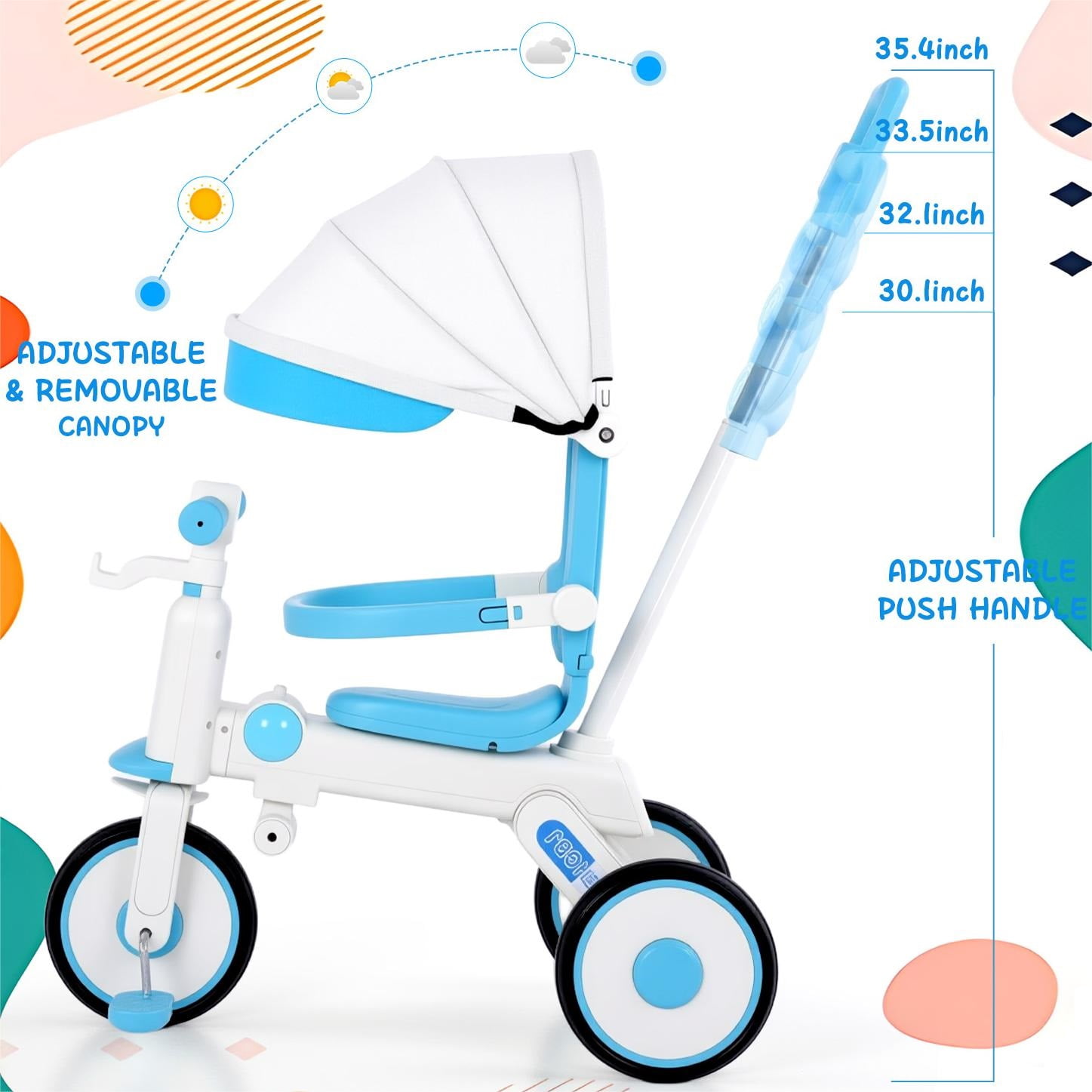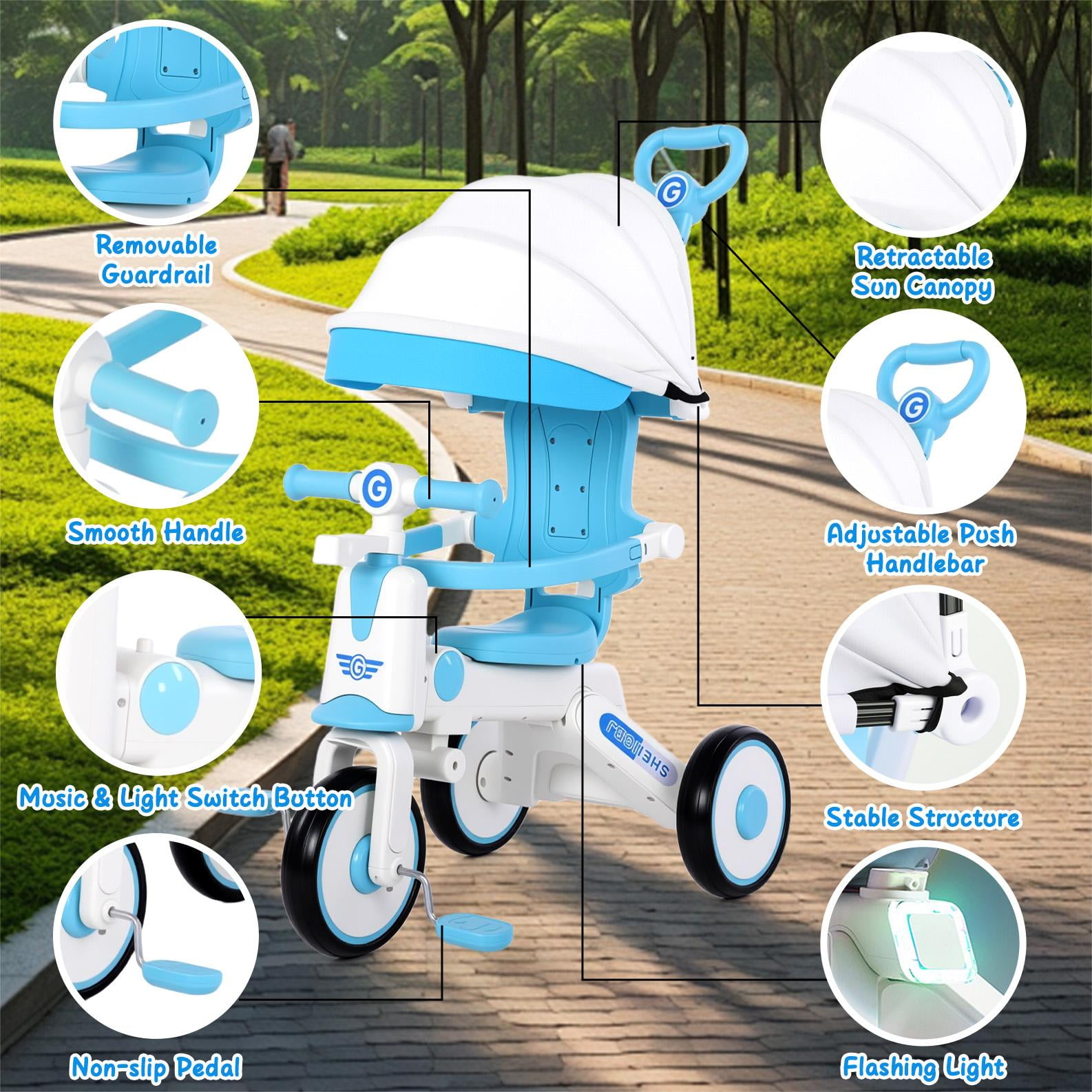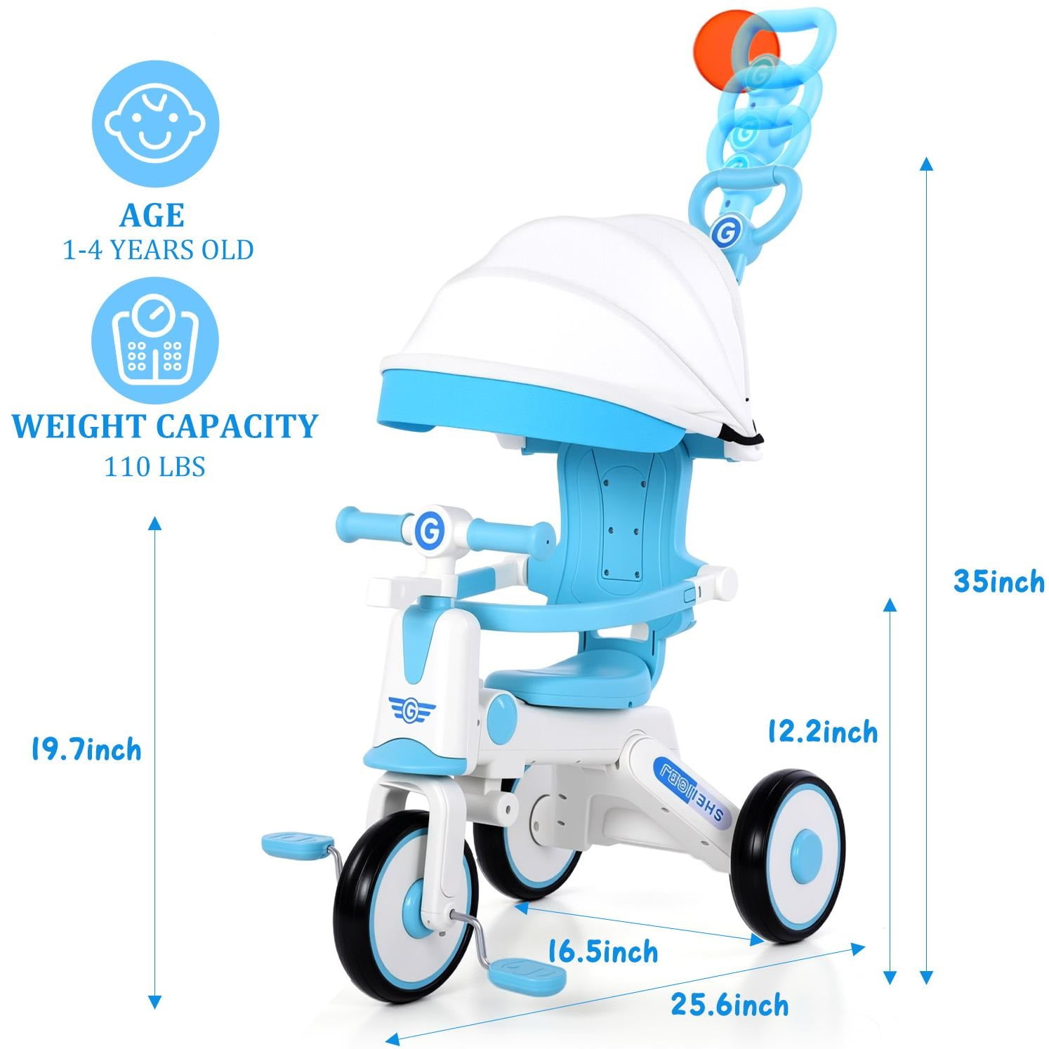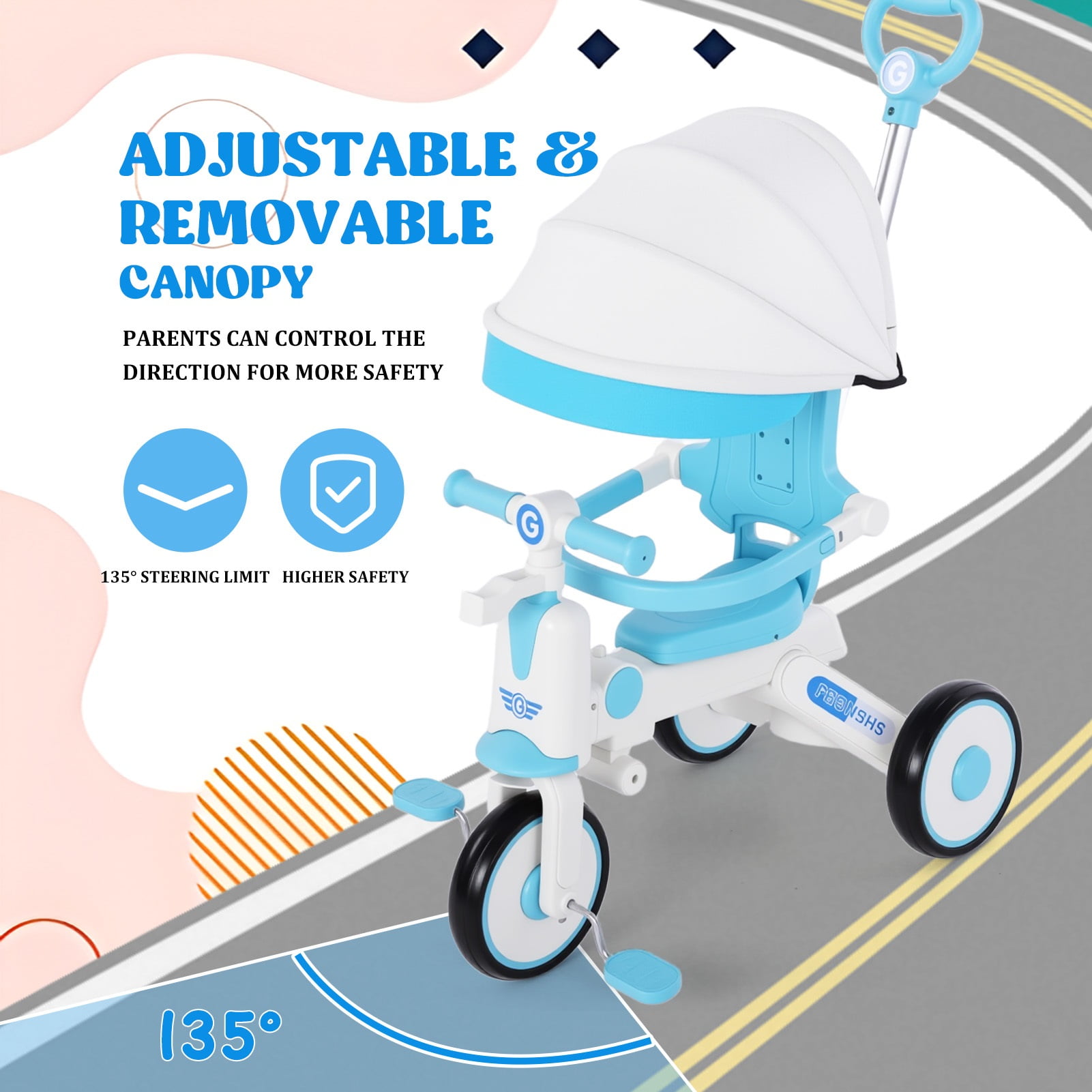 The kids trike with removable canopy for toddlers ages 1-4 years old is an unique and versatile unisex tricycle that can bring a lots of fun while helping beginners practice balance and motor skills. Multiple riding modes make it possible for your little one will be able to ride at his or her own pace. Our innovative pedal mechanism allows riders to place their feet on the pedals and enjoy the ride, while the adult is responsible for pushing and steering the trike. And a controlled turning radius prevents the push tricycle from tipping, ensuring your child rides safely and confidently. Once your baby is confident enough to ride the bike on their own, just simply remove the push handle. And as your child grows, the adjustable seat will allow your baby to enjoy the toddler tricycle for years of fun. In addition, the portable design enhances convenience, and you can even take it on trips because it’s lightweight enough. I’m sure your little one will never want to leave their favorite toy again. Versatile Toddler Tricycle, Grows with Your Kids Best Bike for Beginners: The toddler tricycle works on toddlers’ balance and motor skills while bringing boys and girls a fun riding experience. Multiple Ways to Ride: The kids tricycle has been carefully designed to be easily switched between multiple riding modes, making it the perfect birthday gift for boys and girls ages 1-4. Seat Adjustable: The adjustable seat with soft padding grows with your child, simply adjust the seat to match the rider’s growth. Adjustable Handlebar: The non-slip handlebar can be adjusted to different angles at any time depending on your child’s riding position. Safe and Stable Ride Prevent Rollover: Stable triangular structure design with steering angle restriction on both sides to ensure safety. Smooth Ride: The shock-absorbing mechanism in the front wheel and built-in bearings ensure a safe and smooth riding experience. Durable Design: Made of carbon steel and plastic, it can accompany your child for a long time. Easy to Install: Easy to assemble in minutes by simply referring to the included manual. Specification: Item Type: Kids Tricycle Material: High carbon steel, plastic, EVA Wheels: Foam wheels Maximum Load: Approx. 110 lbs Applicable Age: 1-4 years old with removable canopy, push handlebar, bottle cage, bell, pedals, storage baskets Package List: 1 x Front Wheel 1 x Frame 1 x Front Basket 1 x Rear Basket 1 x Tube Sleeve 1 x Front 1 x Red Plum Button 2 x Brakes 2 x Brake Discs 2 x Axle 1 x Steering Lever with Handle 1 x Backrest Tube 1 x Seat 1 x Backrest 1 x Guardrail 1 x Awning 2 x Wheels 1 x Pedal 1 x Cross Band 1 x Glass Leak 1 x Tape 1 x Mirror 2 x Ribbon 1 x Bell 5 x Gasket 4 x Large Screws 6 x Small Screws 6 x Other Accessories NOTE 1. All measurements are taken manually and may be subject to slight inaccuracies. 2. If you encounter any problems regarding the product, please contact us.